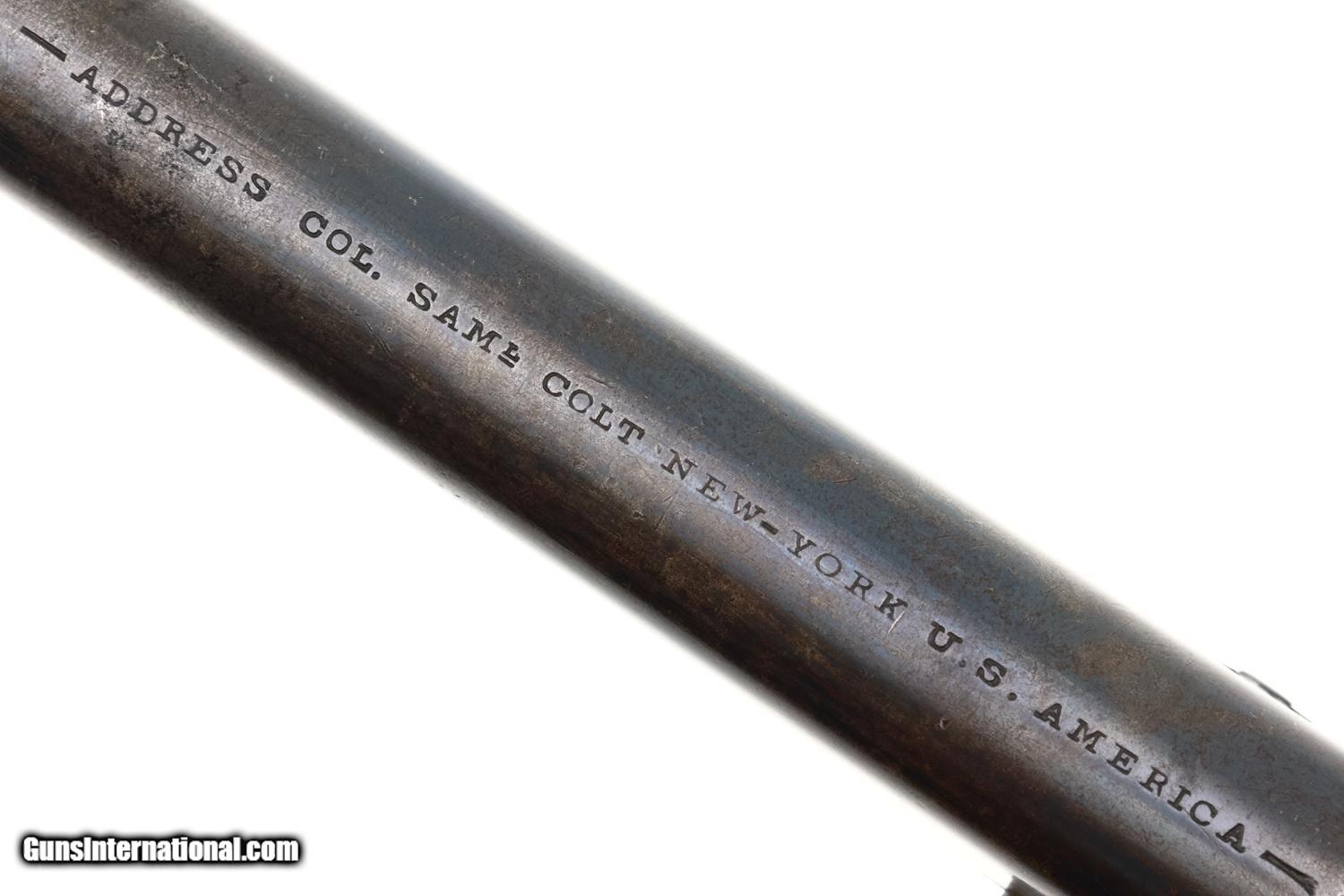 Description: Synopsis: Attractive, original, and all matching Colt 1860 Army Revolver, cal. .44, manufactured in 1862, a classic Civil War and Frontier Expansion revolver, this example accompanied by an original discharge document from a Civil War veteran. Description: All matching standard configuration Colt 1860 Army revolver, .44 percussion, SN: 74916, manufactured in 1862 with over 129,000 having been purchased by the US Government. Features include a round 7.5" barrel with fixed blade front sight and hammer-notch rear sight, engraved rebated cylinder depicting naval battle scenes of the Battle of Campeche on May 16, 1843, and brass trigger guard. Top of barrel marked "ADDRESS COL. SAML COLT NEW-YORK U.S. AMERICA" with matching cylinder showing "COLTS PATENT No 4916" and "PAT SEPT 10TH 1850" patent markings. Left side of frame marked "COLTS PATENT" below the cylinder. Fitted with smooth walnut grips showing natural wood grain and cartouche acceptance on each panel. Grip strap is inspection-stamped "W". Serial number 74916 appears on brass trigger guard, under barrel, steel frame, and butt. Wedge and cylinder axle marked "4916". Accompanying this revolver is a framed, original discharge paper of Samuel Linsenbigler, dated 16 June 1865, referencing his three years of duty during the Civil War. On the back are additional notes dated 6 August 1870. The Colt 1860 Army became one of the most successful revolvers in firearms history and was widely used during the American Civil War and western expansion, favored by military forces and civilians including Wild Bill Hickok and Buffalo Bill Cody! Condition: VG+ original condition with fading in usual areas of holster contact and handling. Faded/dulled color case hardening on ramrod, hammer and frame. Brass trigger guard having toned to a pleasant mustard color. Grips oil stained with scattered handling marks, inspection cartouches easily discernible. Bright bore with light oxidation, sharp rifling. Correct manual mechanics with each of the cylinders indexing nicely on full cock. EXC original discharge document with expected fading and folds. Manufacturer: Colt Model: 1860 Army, Military Issue Serial Number: 74916 Caliber Info: 0.36 Condition: VG Price: $8,995.00 Contact Seller |