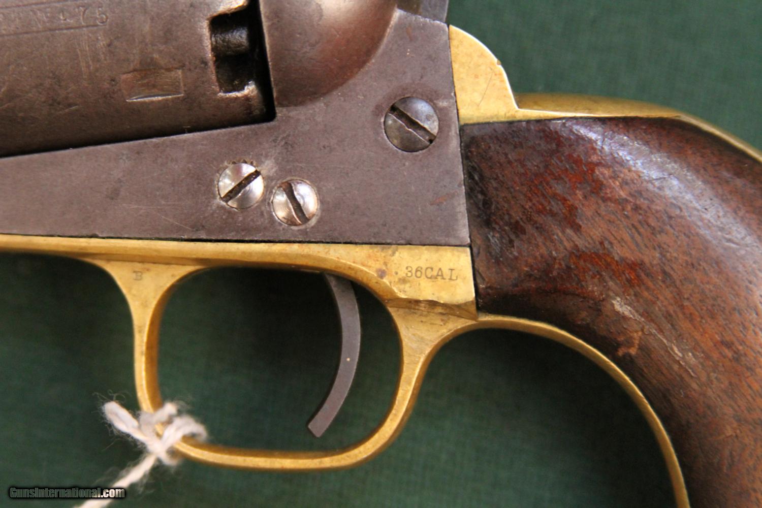 Description: Colt Model 1861 Navy Revolver manufactured 1864. Barrel marking is faint as well as the cylinder roll naval battle scene. COLTS PATENT, 36 CAL and serial number markings are clear. SOLD Antique: Yes Manufacturer: Colt Model: Model 1861 Navy Revolver Serial Number: 22475 Caliber Info: .36 Manufacture Date: 1864 |