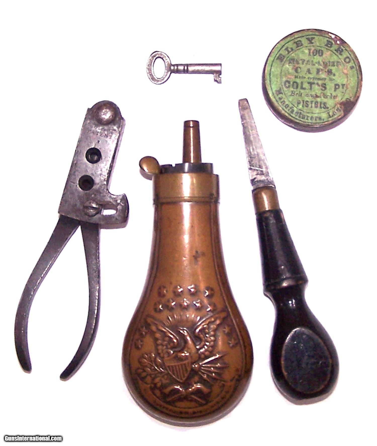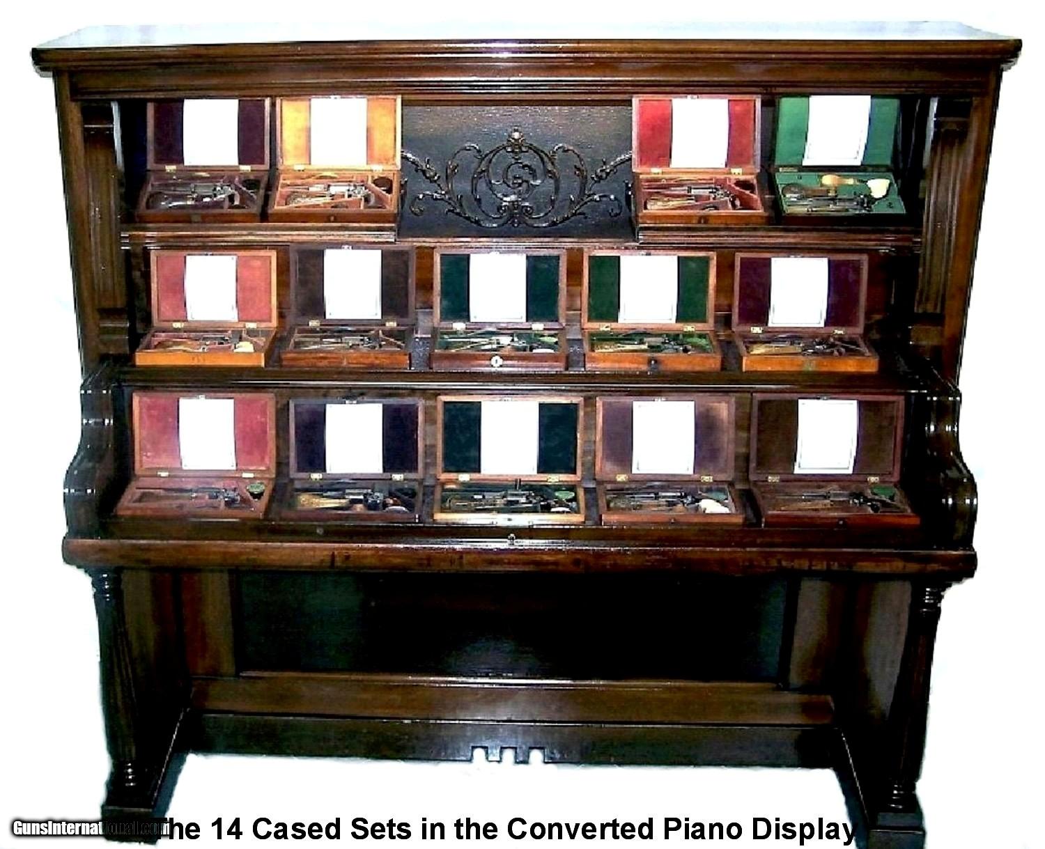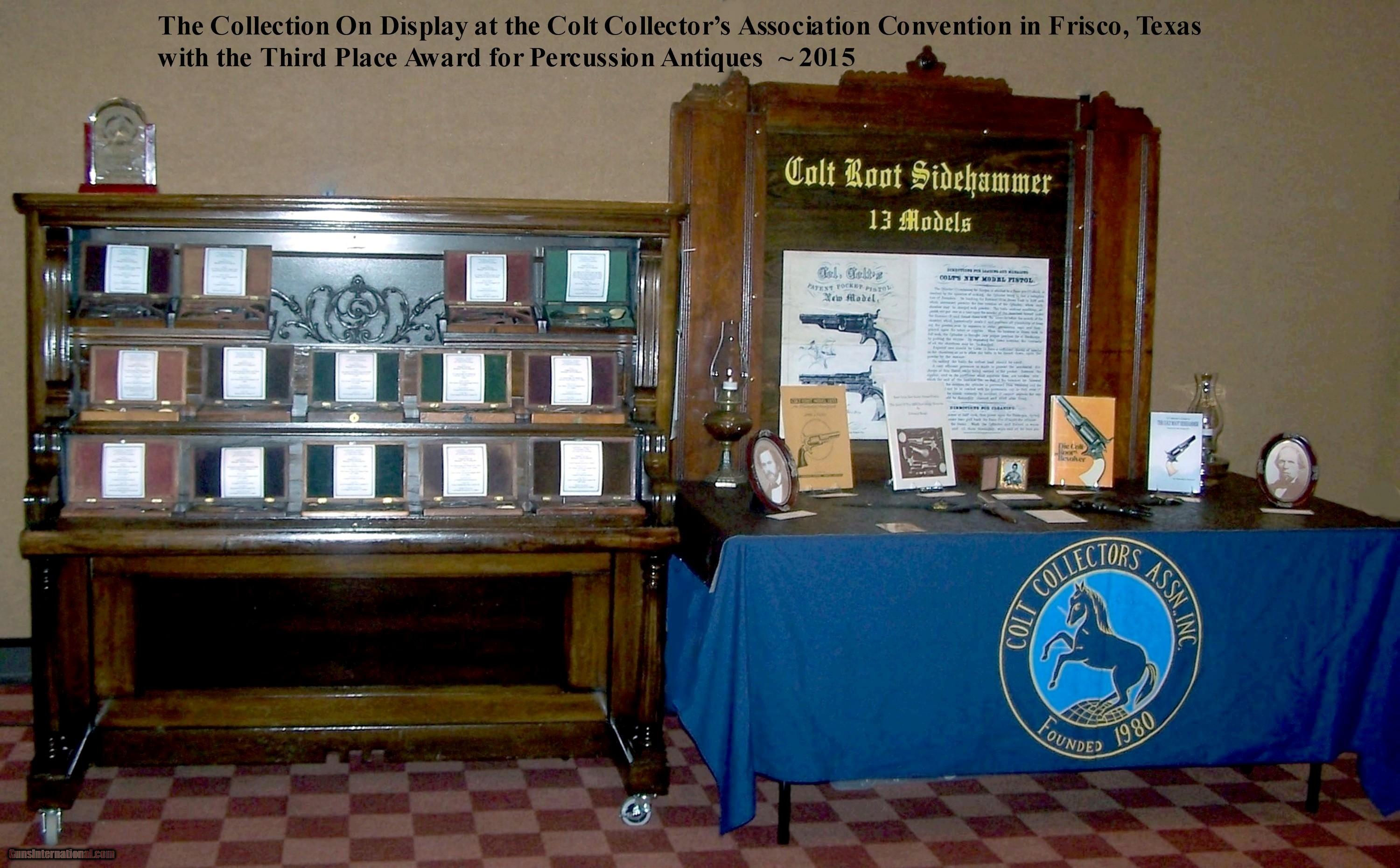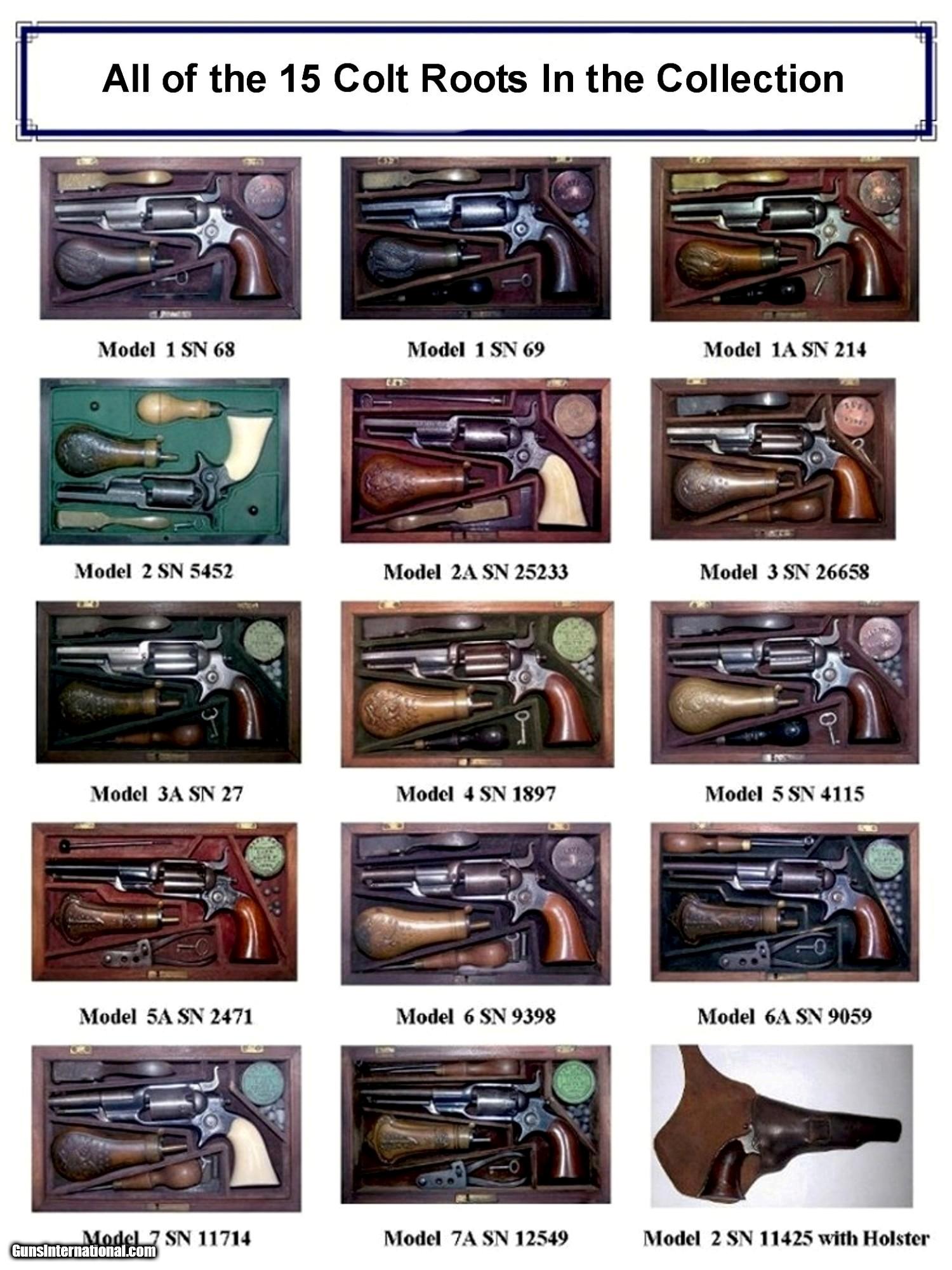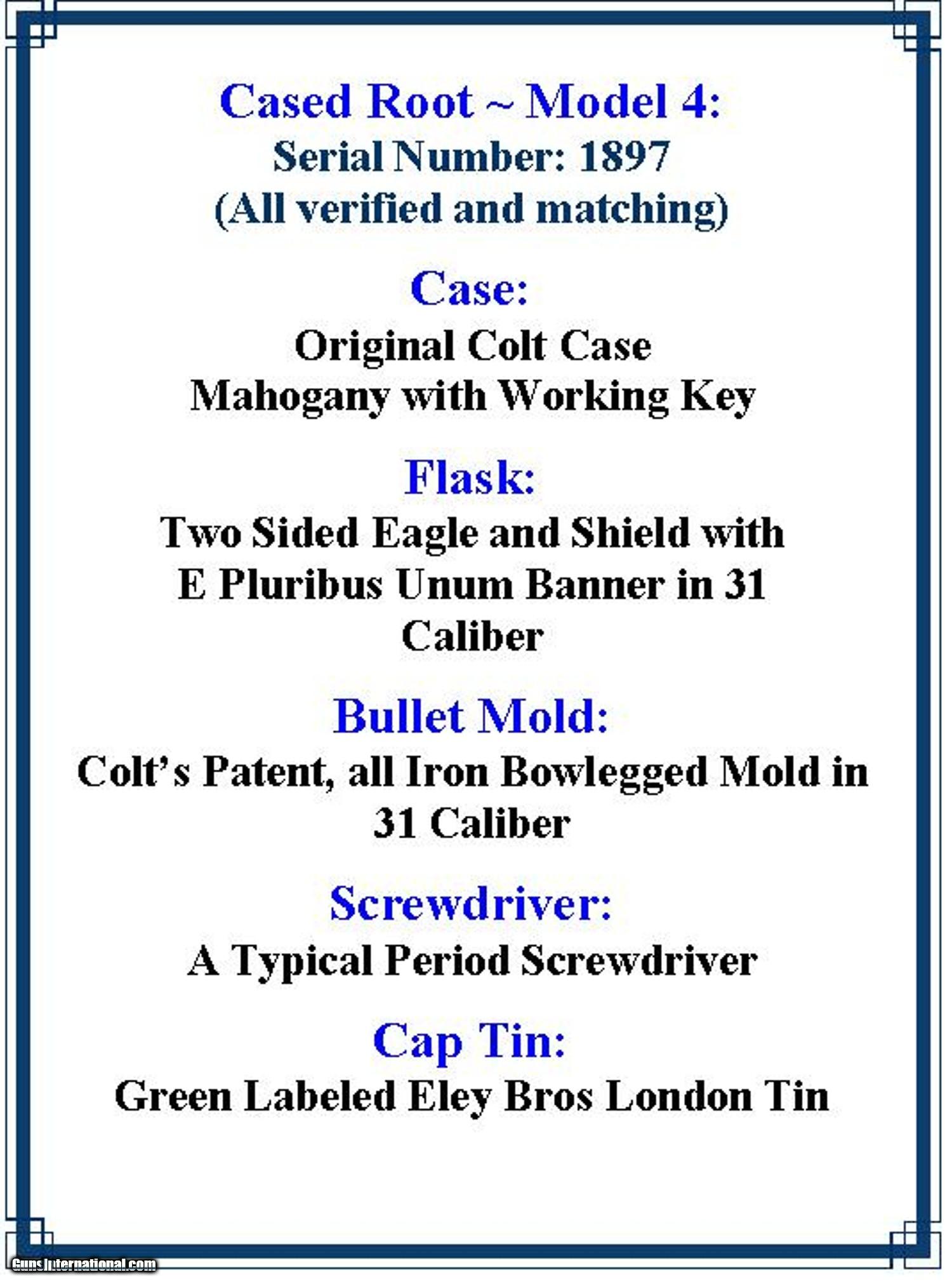 Description: The Colt Root Sidehammers pictured and listed here are not for sale individually. They are offered as a complete collection.There is one each of all 13 models, properly cased, included in this collection plus two additional examples. A good number to start talking about a purchase would be $150,000.00. We will listen to your number if you don't like ours. Perhaps we can get together. If you are interested, arrangements will be made for you to see the collection on display in Florida. Details given with appointment. Model 4, serial number 1897, is a blued revolver retaining much of the finish and has a very good patina overall. The numbers all match, including the back face of the fluted cylinder and the grip. This revolver work as it should as well. The case is an original Colt mahogany case with a green lining. The accoutrement group includes a two-sided brass eagle and shield flask with the E. Pluribus Unum banner, a 31 caliber all iron “Colt’s Patent” bowlegged bullet mold with sprue cutter, an Eley Brothers green labeled 100 count cap tin, a typical wooden-handled period screwdriver, a few bullets, and of course a key This remarkable collection was 20 years in the making—20 years that culminated in winning 3rd place in the Antique Percussion Arms category at the 2015 Colt Collectors Association show. The Colt Root Sidehammer was one of the least produced percussion revolvers manufactured by Samuel Colt. There were only a total production quantity of approximately 40,000. Made up of 26,000 of the 28 caliber models and 14,000 of the 31 caliber models. The production period for these percussion revolvers was from 1855 through 1870 which spanned the Civil War period. Therefore, the surviving quantity of these 40,000 produced is an unknown. Much care was taken to select artifacts in similar condition so that they make a consistent and attractive collection. Included are rare pieces such as two consecutively numbered Model 1s, a Model 7A, a Model 2A with a case-hardened frame, an L. D. Nimschke engraved Model 2, a Gustave Young engraved Model 2A, and a fully silver-plated Model 3. Some of these take years of diligent searching to locate: To see a complete collection with all 13 models together is nearly unheard of. All cases, bullet molds, powder flasks, cap tins, and other accessories are appropriate for the models they accompany according to research in The Powder Flask Book by Ray Riling, The Complete Collector’s Guide to the Identification of Colt Percussion Accoutrements, 1834 – 1873 by Robin J. Rapley, and A Guide To The Proper Accoutrements For Hartford Produced Percussion Colt Revolvers by Fred Sweeny. As the centerpiece of a serious firearms connoisseur’s gunroom, an addition to a sportsman’s den, or a complement to a Civil War historian’s library, this collection would be a coveted enhancement to any fine residence. We’ll include the display furniture and some of the props for the award-winning display pictured as well as the firearms, cases, and accessories. You can enjoy hunting other related period antiques and enhancing your own showcase. SOLD Antique: Yes Manufacturer: Colt Model: 4 Serial Number: 1897 |