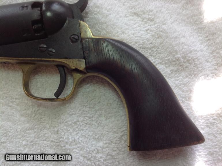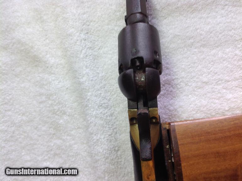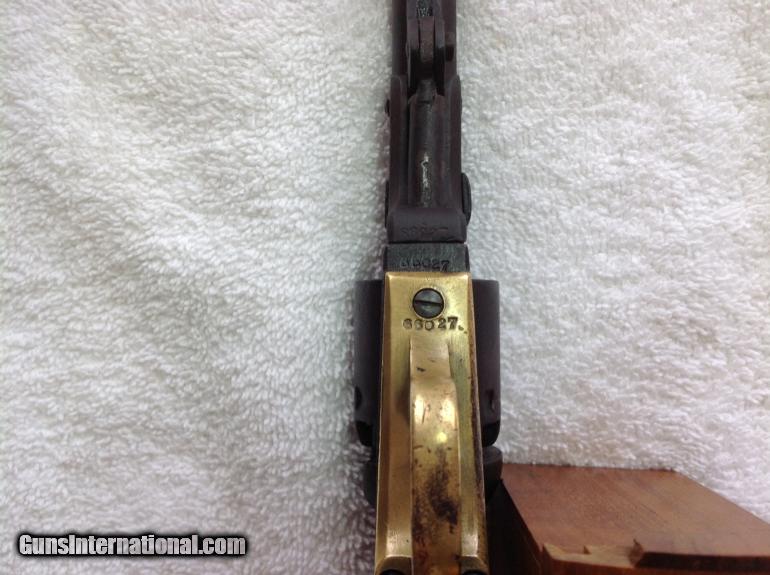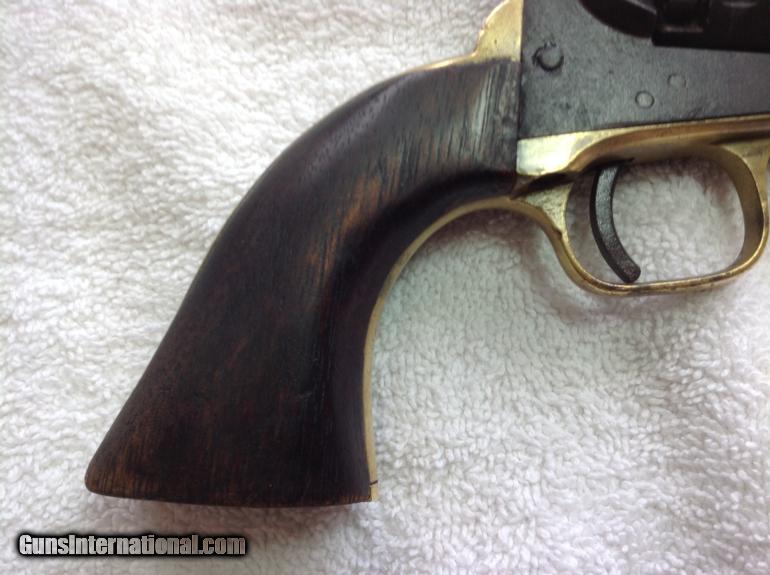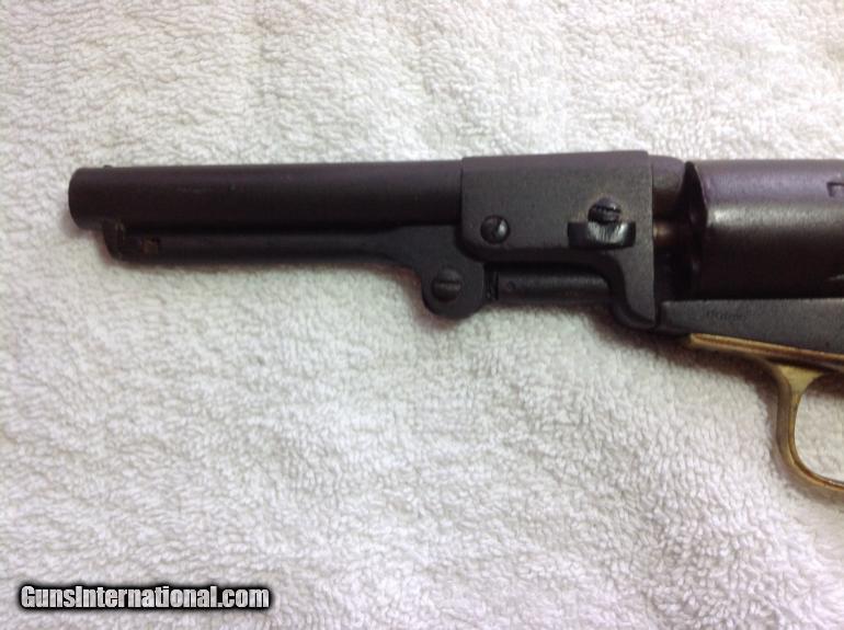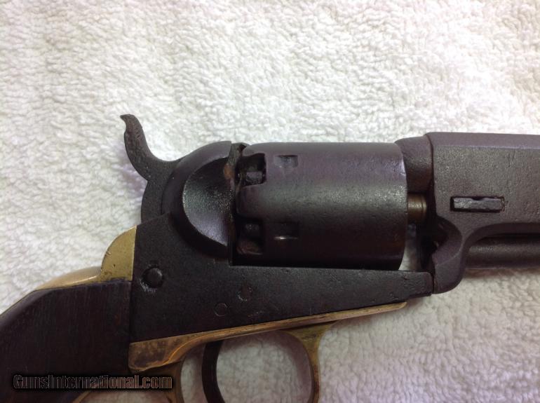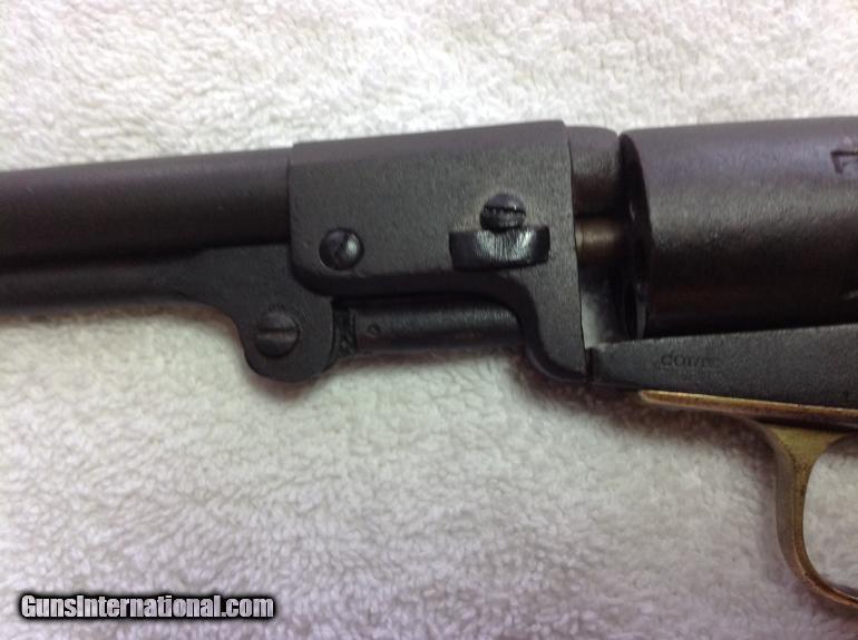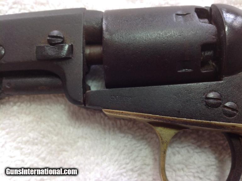 Description: RAREST of the RARE --One of the Rarest Colt Revolver's of the Era! The Colt Round-Barrel/"Baby Dragoon Pocket" .31 Cal. Revolver, All-Matching Serial #'s 66027 (including wedge!) The Enigmatic mid-1850's Production Extremely Rare seen Specimen-- Only a handful of documented specimens 100% Complete, Original, Fully-Functional, Good Barrel Markings There's only around 25 documented specimens, ALL around the 50,000 to 60,000 serial range, and almost all (like this one) with the 5" barrel. It's clearly in the serial range for the Colt Model 1849 "Pocket" .31 caliber revolvers, and is a .31 caliber specimen in every way--with the classic two-line New York address atop the angled-edged frame....but that round narrel clearly is NOT like any Model 1849 Colt "Pocket" revolver! Thus, these have been dubbed as "Baby Dragoon Pocket Revolvers" or just simply the "Round-barrelled /49'er". Some of them--Just like this one--have the "2" above the serial number underneath, denoting that it was made with as with a "set" or "pair". Some theorize these were a special trial or Sam Colt's handiwork to make for some special "gifts". Obviously being not like the Model 1849 with complete octagonal barrel, NOR like the Model 1851 "Navy" .36 caliber being the same, ONLY the "Dragoon" series of revolvers show the round-barrel with the last inch or so being "angled" by the breech. It's a total mystery. But they are as real as ever!And this one is a beauty! All matching serial numbers 66027--including the wedge!--and is FULLY-FUNCTIONAL, COMPLETE, and absolutely beautiful with the most gorgeous rich, deep-dark chocolate brown patina all over the metal surfaces. Purchased from my great friend and Civil War expert John Spicer of Champion Hill relics. Buyer will receive letter of purchase I received from him. Here's a killer pre-war that is one of the rarest and most enigmatic Colt revolver ever! Compare prices! You will not find a better price on this rare Civil War gun. Buyer pays shipping and insurance. SOLD Curio/Relic: Yes Antique: Yes |