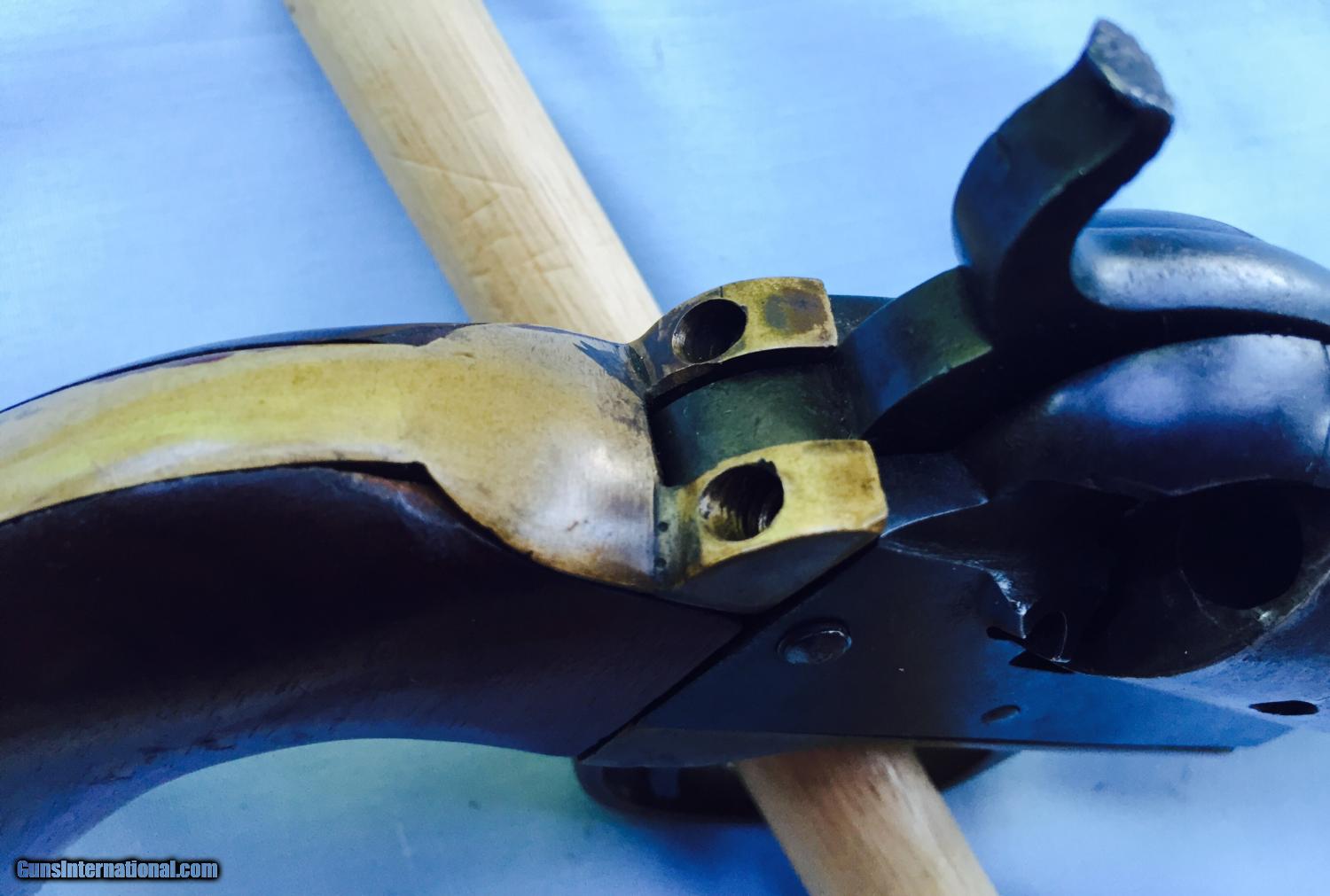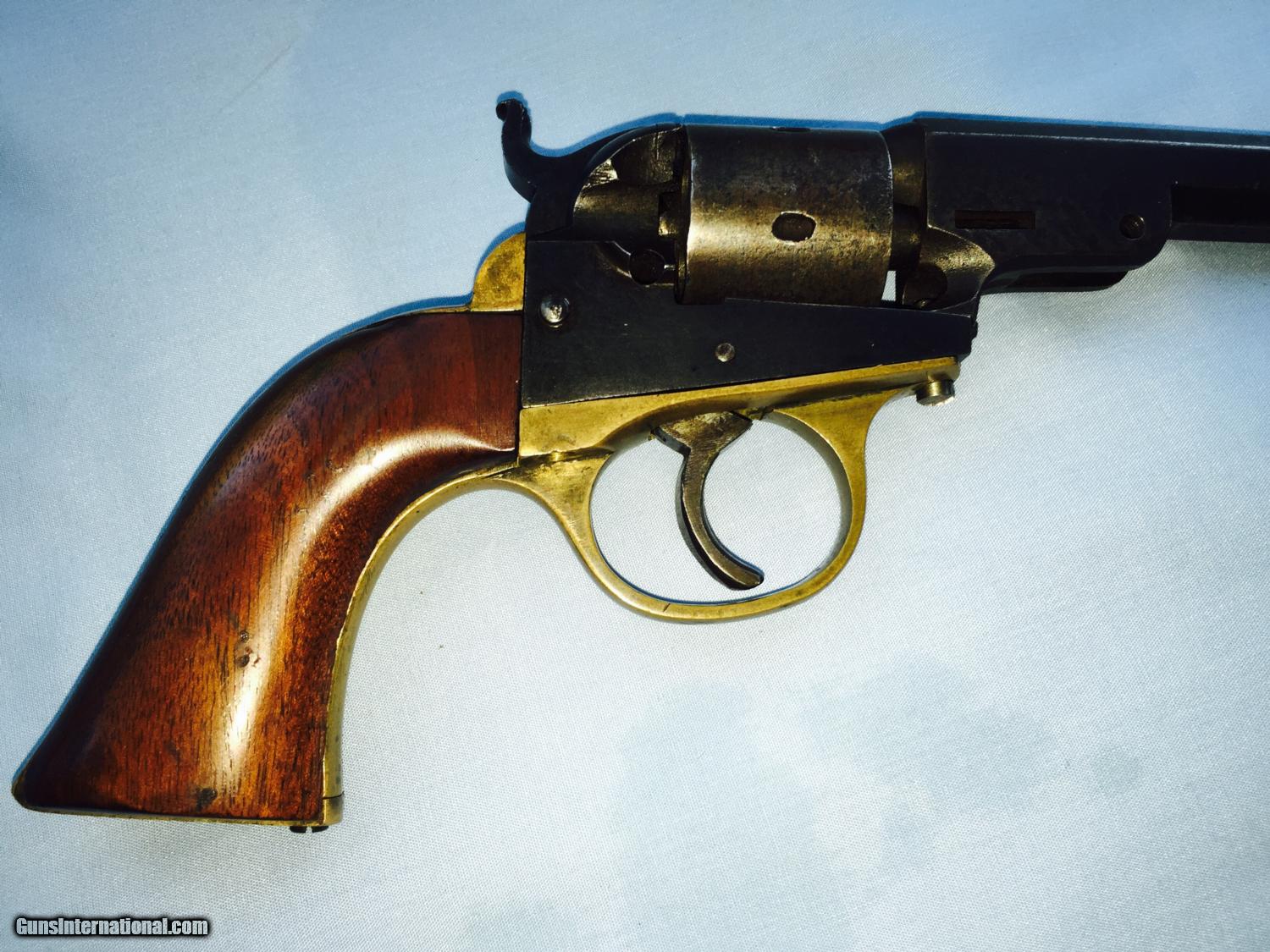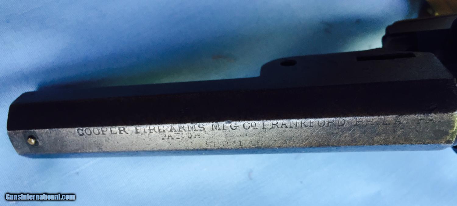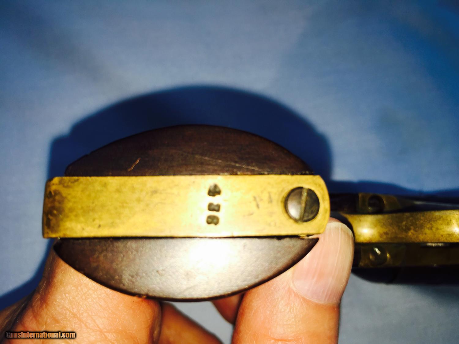 Description: Brass frame Cooper Firearms Manufacturer Philadelphia, PA dated 1851, 5 shot 36 caliber cartridge revolver - hammer and trigger spring a loading lever, loading gate Missing along with several screws - this is a excellant CIVIL WAR example and looks very good in a glass coffee table or on a wall. Grips are near excellent condition and intact. Handsome piece of CIVIL WAR history . SOLD Curio/Relic: Yes Antique: Yes Manufacturer: Cooper firearms manufacturer Frankford Serial Number: 437 Caliber Info: 30 Bore: Rifled good cond Chambers: 5 Ejectors: None Condition: Very good for an 1850 revolver Wood Condition: Excellent Bore Condition: Average Barrels: 3 INCH Action: Double action Triggers: One |