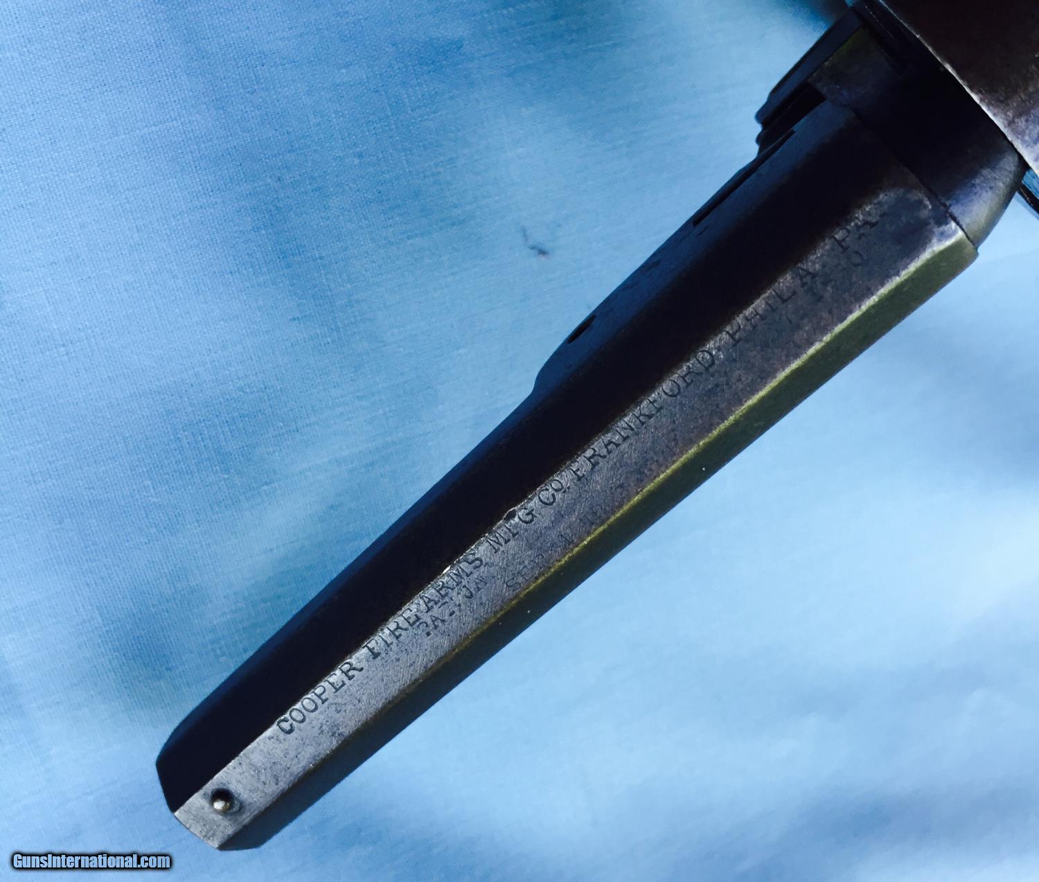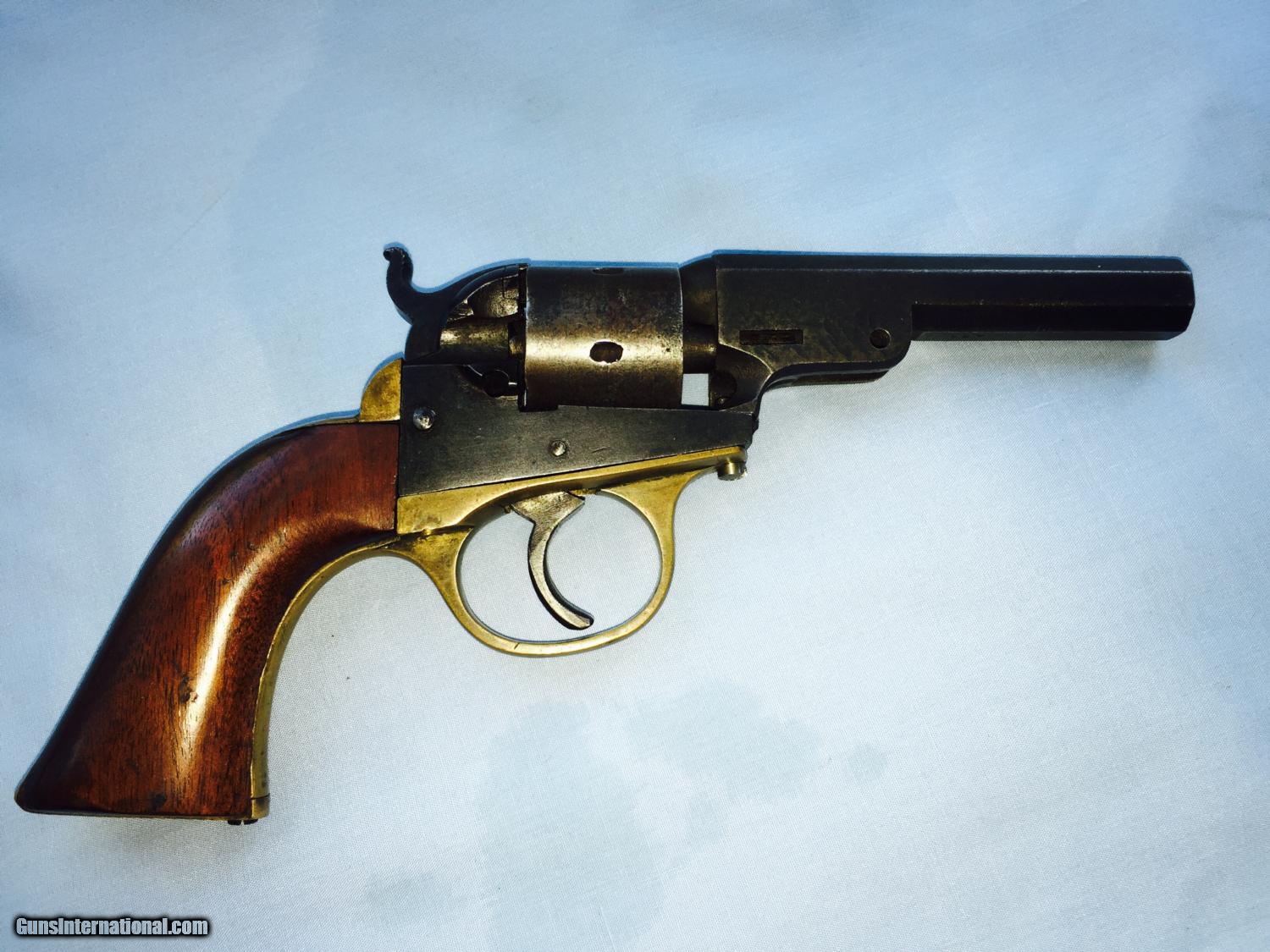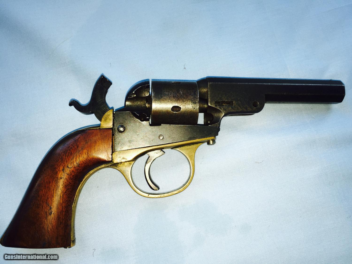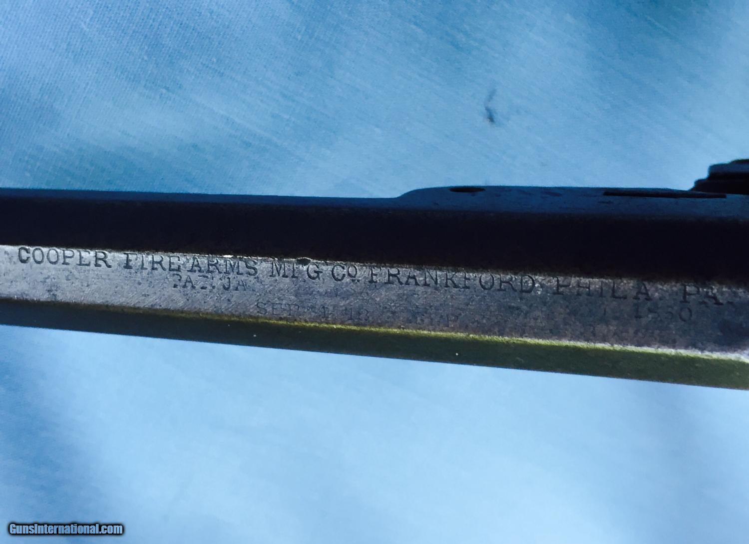 Description: Brass frame Cooper Firearms Manufacturer Philadelphia, PA dated 1851, 5 shot 36 caliber cartridge revolver - hammer and trigger spring a loading lever, loading gate Missing along with several screws - this is a excellant CIVIL WAR example and looks very good in a glass coffee table or on a wall. Grips are near excellent condition and intact. Handsome piece of CIVIL WAR history . SOLD Curio/Relic: Yes Antique: Yes Manufacturer: Cooper firearms manufacturer Frankford Serial Number: 437 Caliber Info: 30 Bore: Rifled good cond Chambers: 5 Ejectors: None Condition: Very good for an 1850 revolver Wood Condition: Excellent Bore Condition: Average Barrels: 3 INCH Action: Double action Triggers: One |