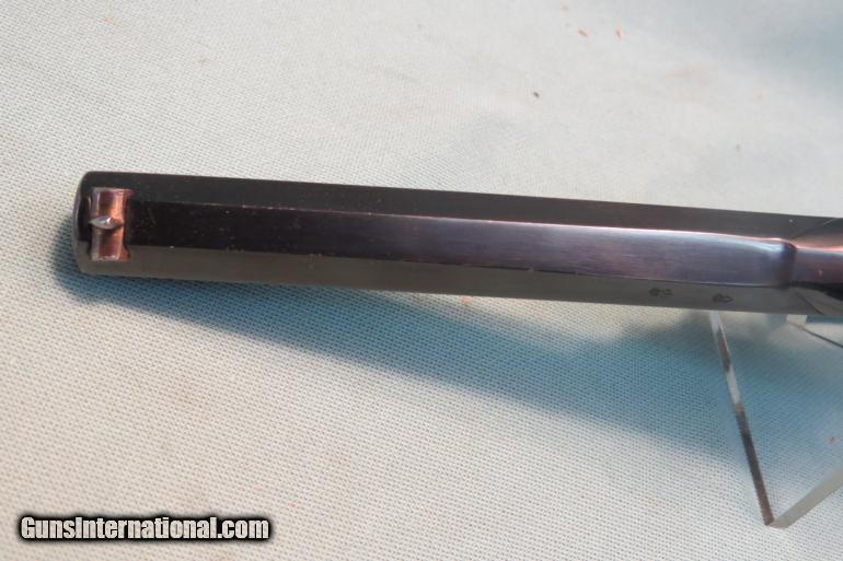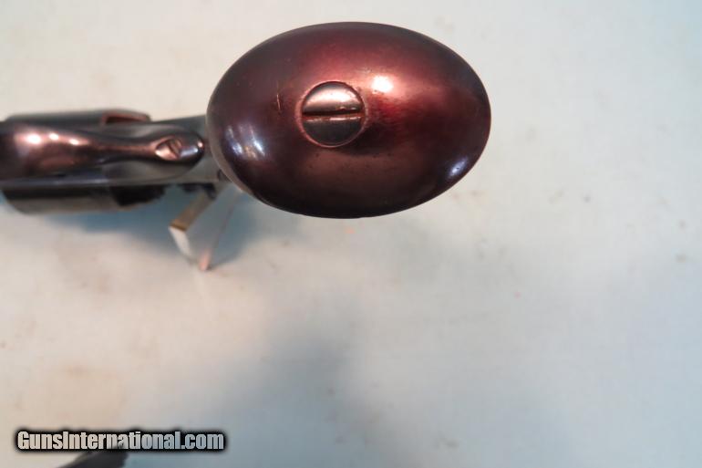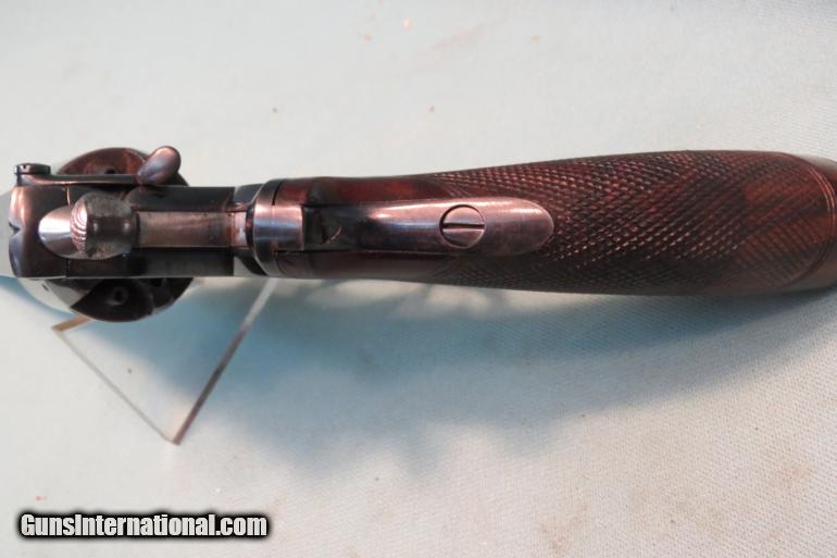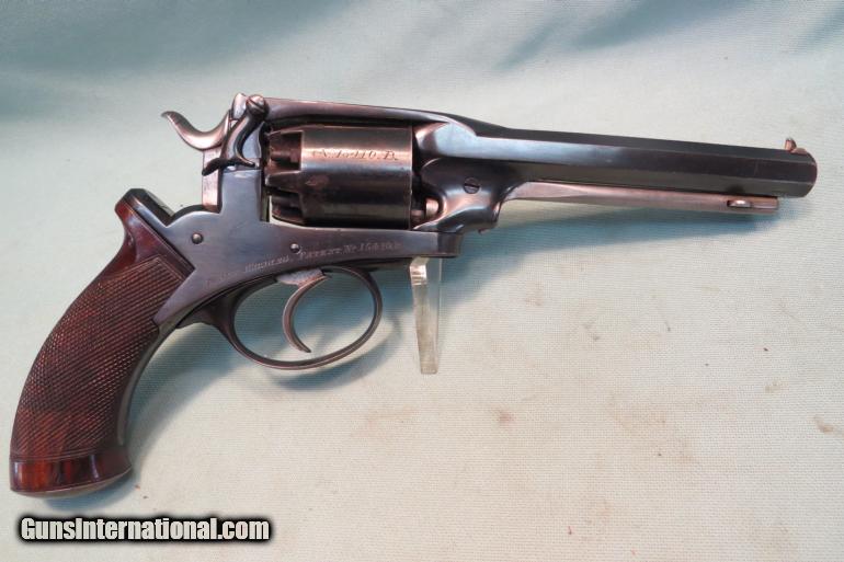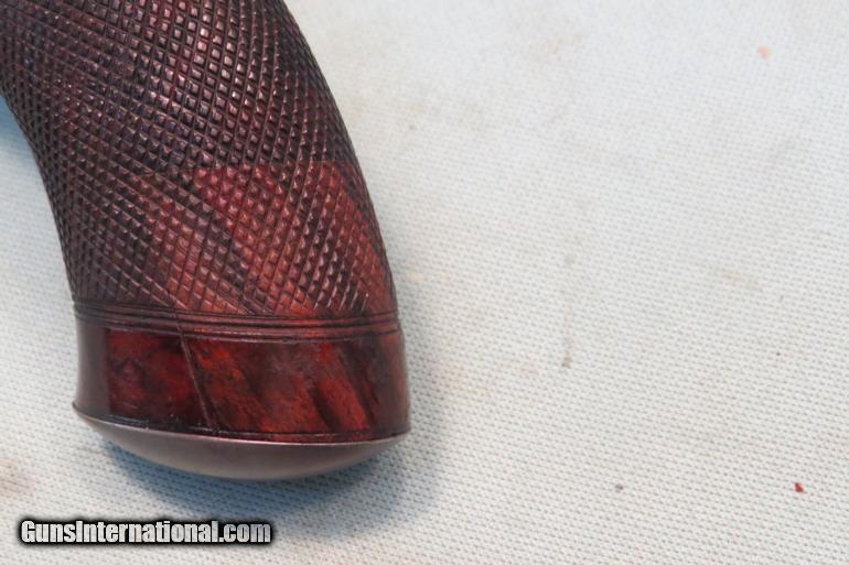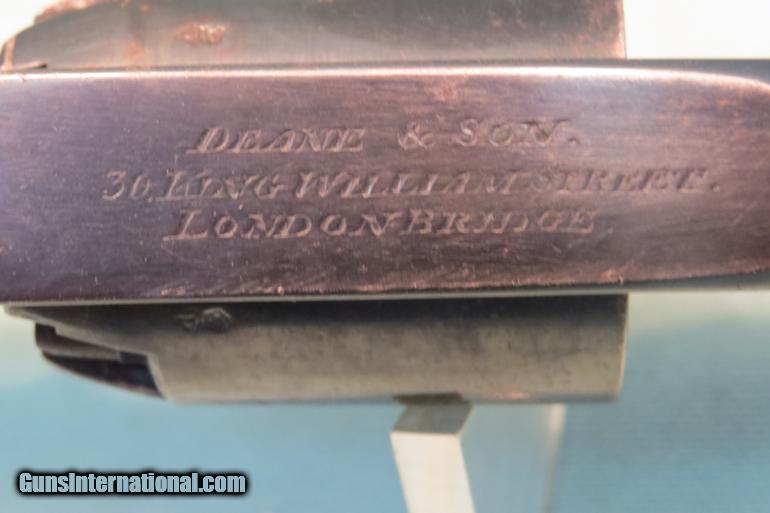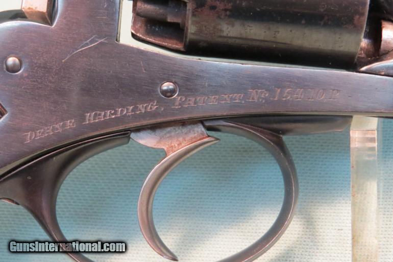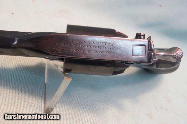 Description: NEW LOWER PRICE! FREE SHIPPING IN THE CONTINENTAL US! This is a Deane & Son percussion double action revolver in .45 caliber. The finish overall is very good. It may have been refinshed a long time ago and it was an excellent job. All the markings are clear and very readable, as shown in the photographs. The barrel is 6 1/8" and the bore is great! The grips have fascinating feature in that on the lower back side you can see where a piece of walnut has been patched in when the grips were originally made as the checkering is perfect. The cylinder shows the effects of some bad storage over the last sixty years with a few spots of pitting. The cylinder and frame have the same number. Safety latch is in tact. This is a tip-up style frame when the screw that holds the safety latch is removed. Really nice antique revolver with many advanced features for it's time. Please email with any questions or offers. "This is an example of one of the Deane Harding, percussion revolver, one of the less often-encountered English pistols of the mid-19th Century. The Deane Harding revolver was produced by the firm of Deane & Sons of London from 1858 through the late 1860’s and the demise of the age of percussion revolvers, and continued in production as a cartridge revolver until about 1873. During its production, the Deane Harding competed directly with the revolver designs of Adams, Tranter and Kerr. In the ever-sordid world of English gun makers, the relationship of Deane with other notables in the trade looks more like a soap opera than a normal series of business relationships. John Deane was one of Robert Adams original partners in the production of the famous Adams percussion revolver. The initial production guns were produced by their firm of Deane, Adams & Deane at Deane’s 30 King William Street shop. There they produced the 1851 Pattern Adams revolver as well as the later, improved Beaumont Adams revolvers. Adams was subsequently hired by the London Armory Company and the rights to produce his revolvers were purchased by the L.A. Co as well. At that time, LA Co also issued 125 shares of stock in their company to Deane as compensation for his portion of the now severed Deane-Adams partnership. Around 1857, Deane saw the Adams-London Armory relationship souring and sold his shares and went back into business for himself under the name of Deane & Sons. He retained his 30 King William Street shop and also hired James William Harding as his company manager and superintendent. Harding had recently patented a new revolver frame and loading lever, and together he and Deane started production of what became known as the Deane-Harding revolver. Harding’s patent was for a two-piece frame that hinged together via a hook shaped wedge at the lower end of the frame, forward of the cylinder. By removing the screw at the top rear of the frame that secured the safety to the right side of the frame, the barrel could then be depressed and the upper frame un-hooked from the lower frame. The break down system is nearly identical to that of a US M-1858 Starr Revolver, only without the hinge at the bottom of the frame. Harding had also patented a loading lever that was quite similar to the Colt style hinged loading lever, which mounted under the barrel. Deane primarily produced the guns in 54 Bore (.443 caliber), with the hope of obtaining military contracts. However, due primarily to some bad press, the revolver never became particularly popular and simply never gained the level of acceptance of the Adams and Tranter designs. At least one noted user of the revolver at the time, a Lord Roberts, noted in THE FIELD (an English firearms periodical of the time) that the gun “could always be depended upon to malfunction at a critical moment”. Such faint praise did not help Deane to compete with his much more established rivals. Deane was forced to find customers where he could and as such turned to the commercial trade to sell guns to anyone who would buy them. By the early 1860’s, as a cost saving measure, Deane had turned to the Birmingham trade to produce the guns for him at a lower cost to improve his profit margin. This Deane-Harding revolver is one of his early guns as it is London and not Birmingham proved. The top strap is engraved in three lines: DEANE & SON. / 30 KING WILLIAM STREET / LONDON BRIDGE. The right side of the frame is engraved in one lone line: DEANE HARDING PATENT No 15262P. The same patent number is located on the cylinder as well. Their maker mark is also stamped in a number of locations, much like a military sub-inspectors mark. London proof marks appear on the barrel and cylinder. The gun functions perfectly, both as a single action and a double action revolver. The lock work is based upon the Beaumont-Adams double-action lock work, but according to period commentary was even more fragile than the Adams version! The gun has a 6 1/8” barrel a 5-shot cylinder. The loading lever is complete and original, and functions exactly as it should. The original frame mounted safety lever is in place on the upper right side of the frame and functions correctly. The safety is essentially an inverted version of the safety found on later model Tranter patent revolvers. The bore is in about fine condition. It is mostly bright and retains crisp three-groove rifling, with scatter light pitting along its length, mostly in the grooves. The cones (nipples) are all present, and appear to be original to the period. The original dovetail mounted front site blade is in place at the end of the barrel as well. The checkered walnut grips are in fine condition. What's unusual is on the back of the grip a patch of wood has been inserted. This appears to be factory as the checkering is a perfect match. Overall this is a really outstanding and complete example of one of the less often encountered English percussion revolvers of the Civil War era. These large frame, double action service caliber revolvers we