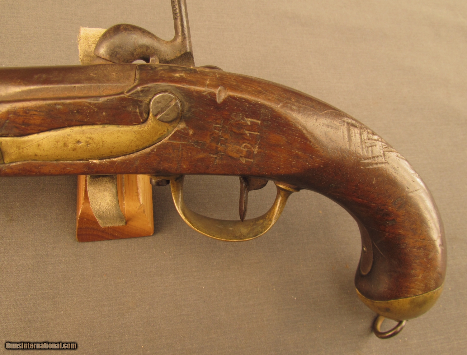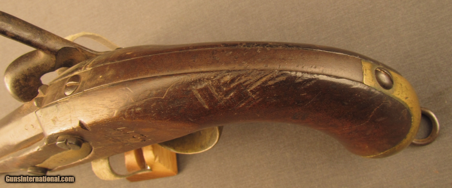 Description: NSN, .68 cal., 7 3/4” barrel with a good, pitted bore that has dark brown oxidation along its length. This is a large, “Mutzig” marked pistol, that has an overall freckled plum-brown patina with some mild-moderate pitting, heaviest on and around the nipple bolster. There is some further pitting and mild surface oxidation on the barrel at the muzzle and on the hammer. The brass furniture likewise has a dull yellow-ochre patina while the walnut stock is in very good shape with minor handling marks spread throughout the added oil finish with a stable, with-the-grain crack through the grip, a small armory repair on the right side of the lockplate, and deeply struck issue numerals on the left side behind the sideplate. The lock itself is tight and fully functional with faint, but legible armory markings, and the thick iron ramrod is still present. This is a very nice example of an 1822/42 pistol, and would make a nice addition to a collection. {Ref. French Military Weapons 1717-1938” by Maj. James E. Hicks; 1964} Antique SOLD Antique: Yes Manufacturer: French Model: 1822/42 Caliber Info: .68 Cal Gauge Info: .68 Cal |