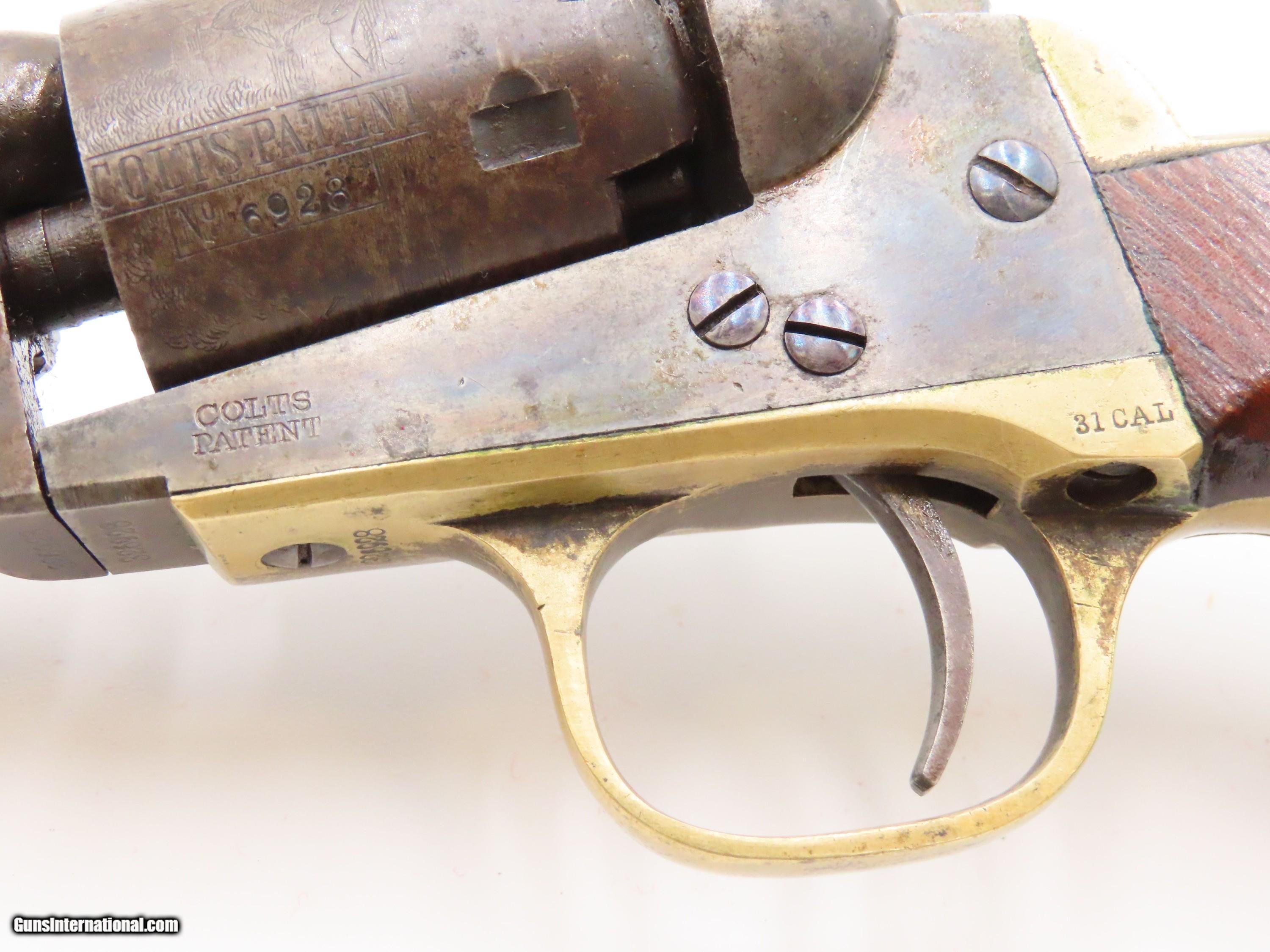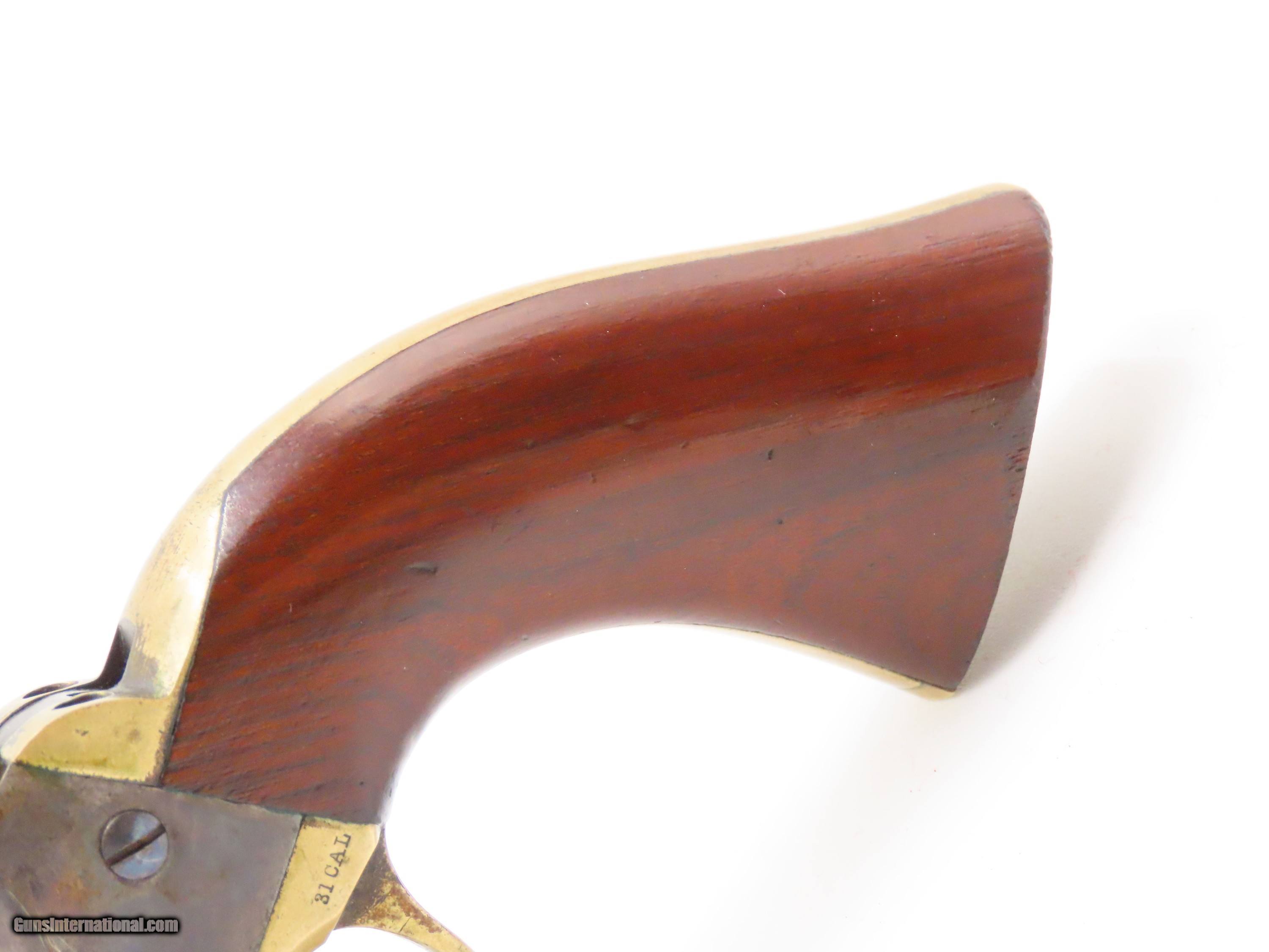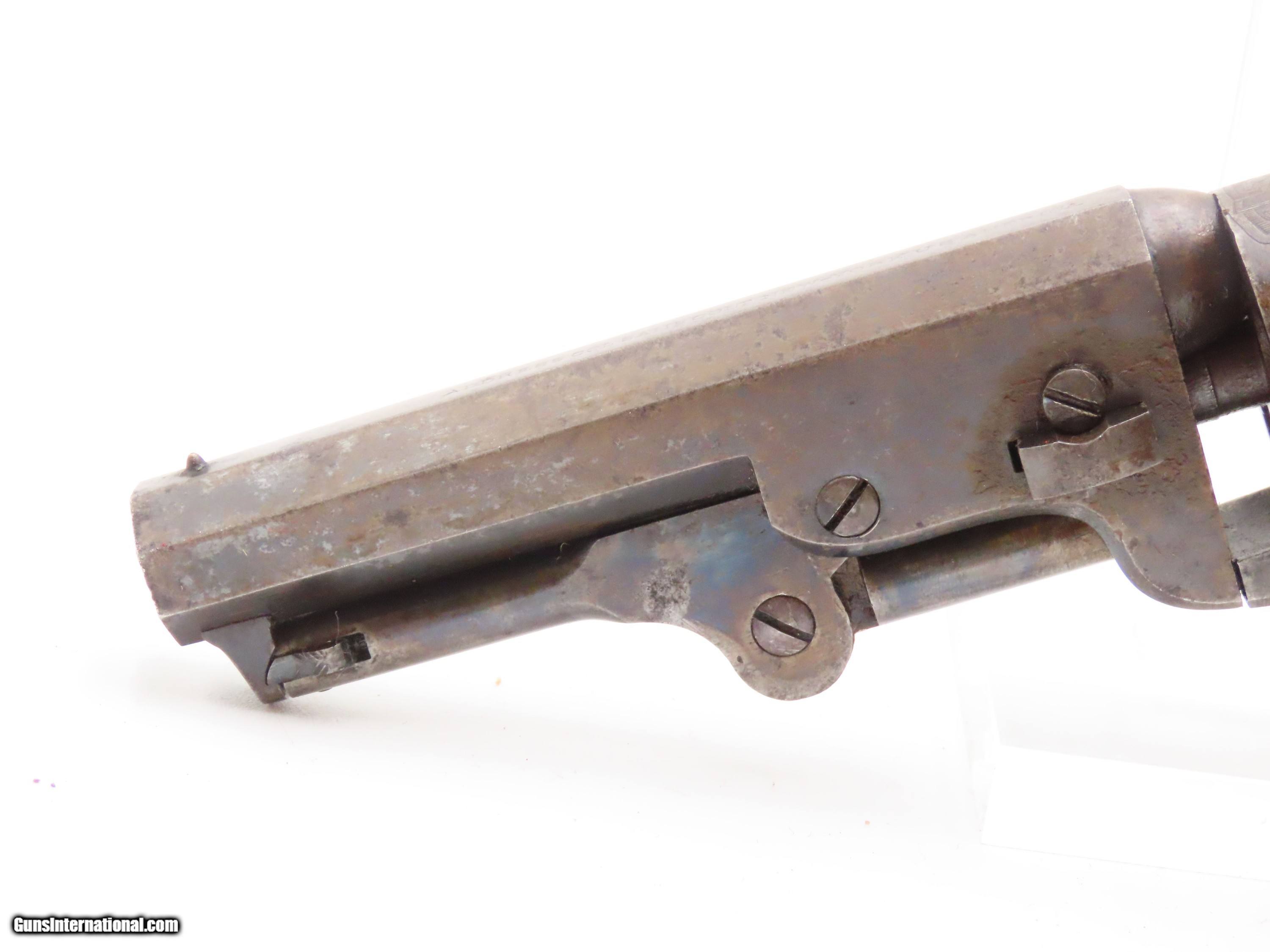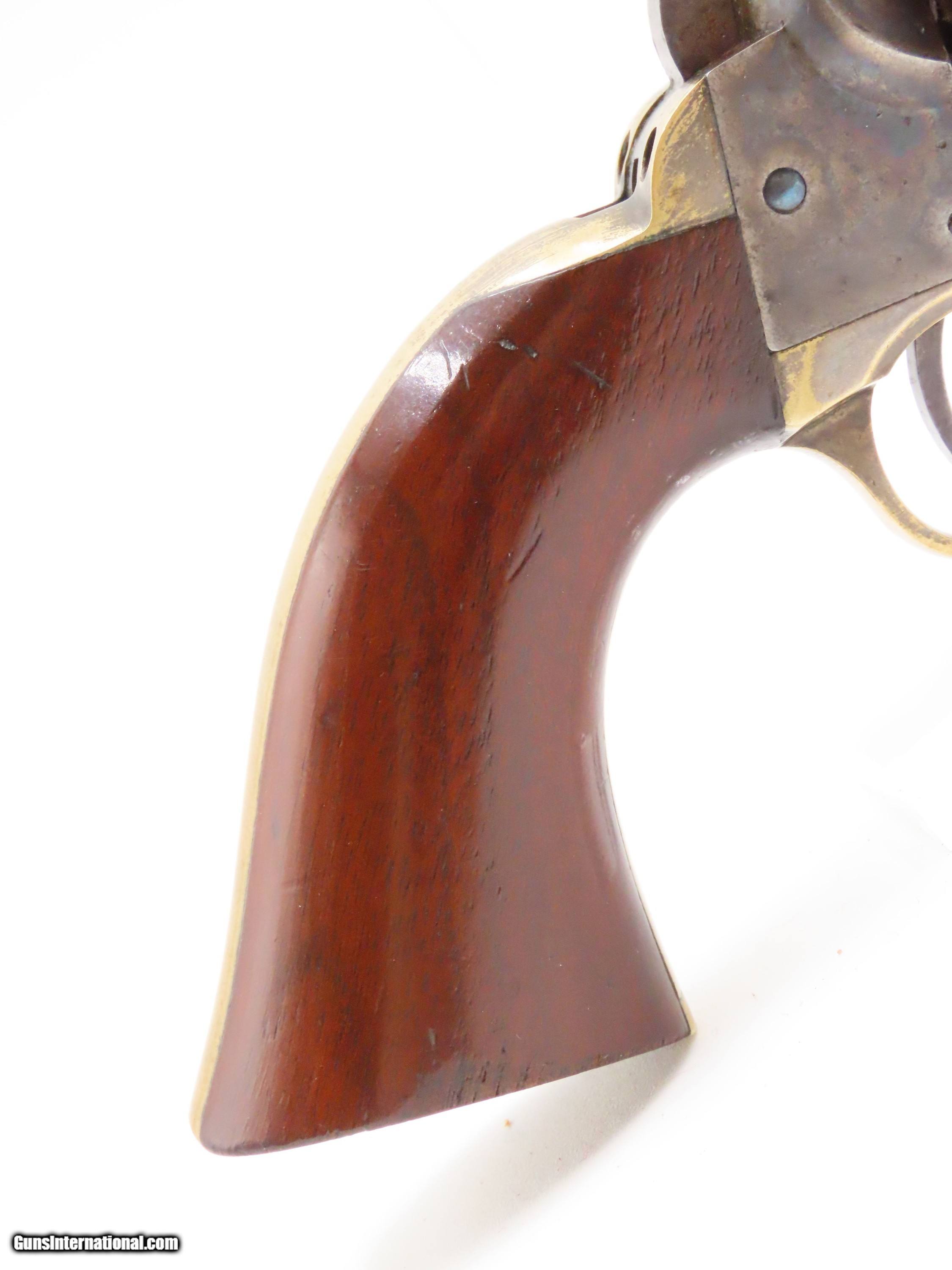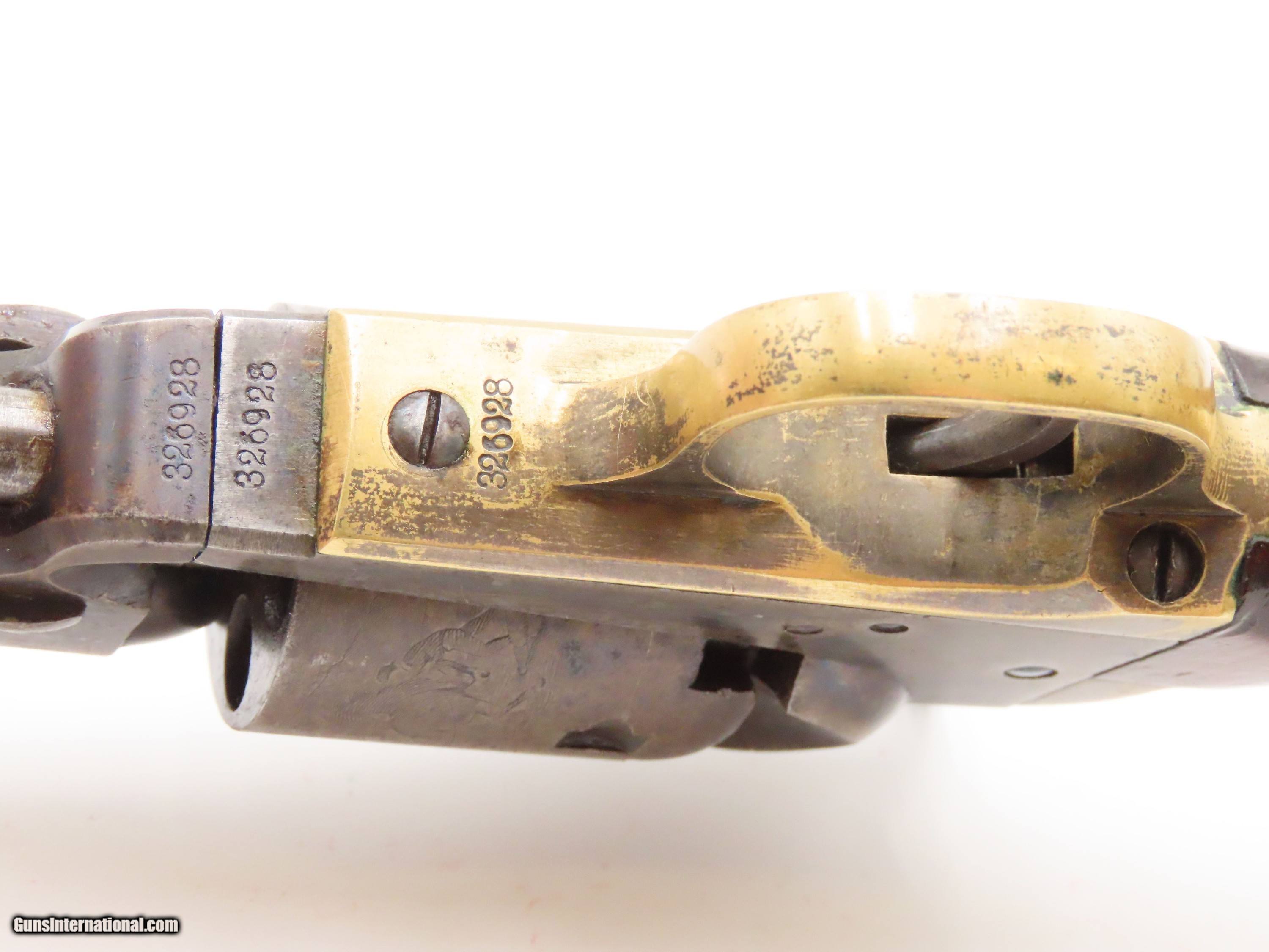 Description: HANDY Post-CIVIL WAR / WILD WEST Antique COLT M1849 Percussion .31 POCKET Nice WILD WEST/FRONTIER SIX-SHOOTER Made In 1871 Here we present an antique Colt Model 1849 Percussion Pocket Revolver, made in 1871 in Hartford, Connecticut. The Model 1849 Pocket, the replacement for the Baby Dragoon, was the most widely produced of any Colt percussion pistol. Nearly 340,000 were manufactured during its 23-year production run that ended in 1873. Over 280,000 of these were produced by Colt’s factory at Hartford by the end of the American Civil War in 1865. These were very popular and saw a lot of use on the battlefield, on the home front and in the West. These were some of the smallest, handiest pocket revolvers of the time. Though not a primary military arm during the American Civil War, these handguns were commonly privately purchased by soldiers for use on the battlefield. Whether legend or fact, it is interesting to note something commonly read about pocket revolvers of the day, that while they could be used for self-defense againstthe enemy, many soldiers kept them on their person to defend themselves against an unwanted amputation in the primitive field hospitals that were notorious, even in their day. The overall condition is nearing fine with some original finish and case colors preserved in low handled areas. Strong action. The bore is in good shape with serviceable rifling. Fine grip. Markings are legible. Numbers match. Loading lever is unmarked. Most of the cylinder scene is intact. Own the original! This is a legitimate antique and not a reproduction. Barrel is 4 inches. Caliber: .31 Percussion Overall condition as seen in photos. Very Fast. Very Safe. FREE SHIPPING WORLDWIDE. Delivered directly to your door by express mail! Guaranteed AUTHENTIC & Includes CERTIFICATE OF AUTHENTICITY. ancestryguns $2300 #250508 Antique: Yes Price: $2,300.00 Buy Now Pay with