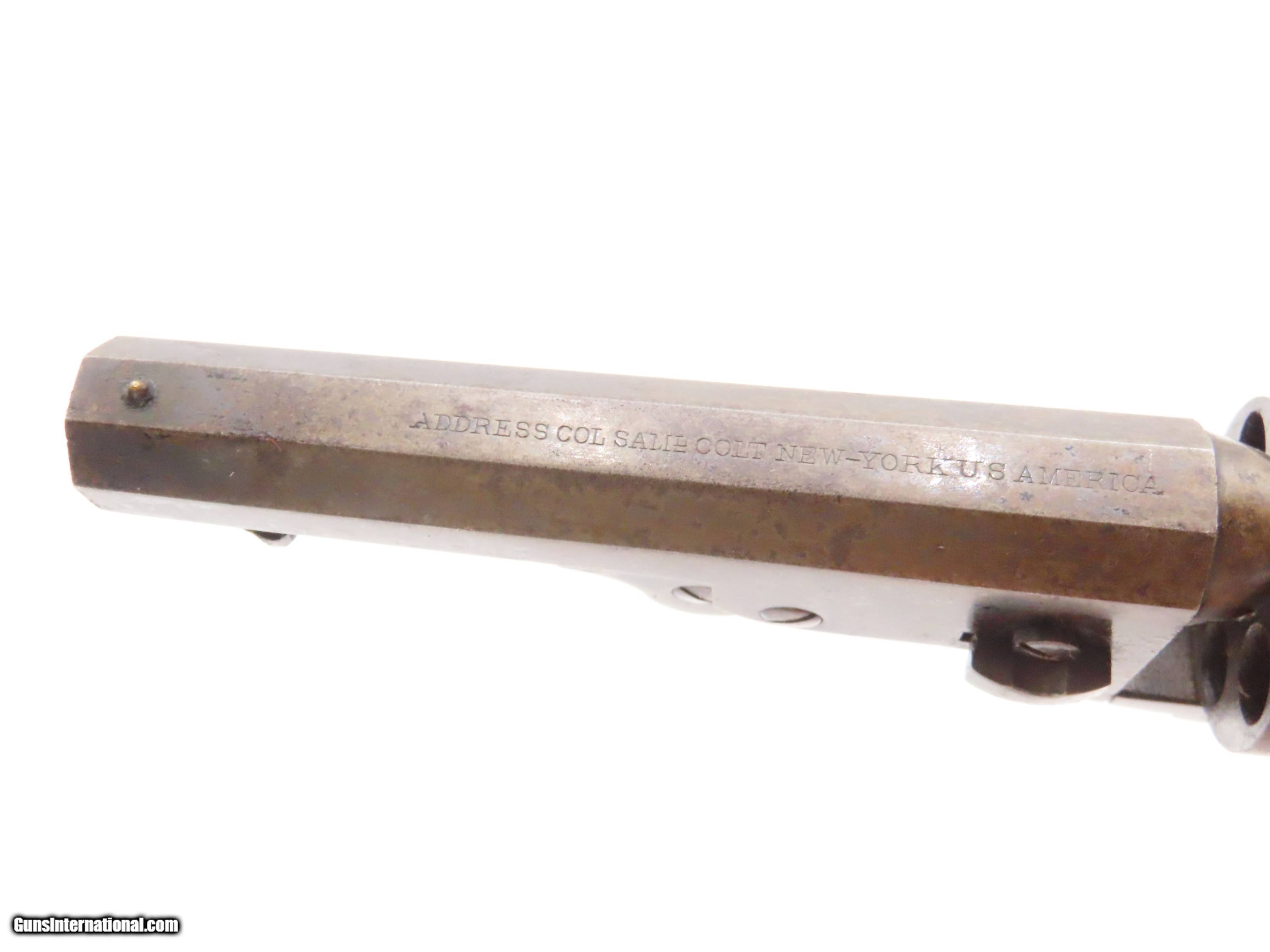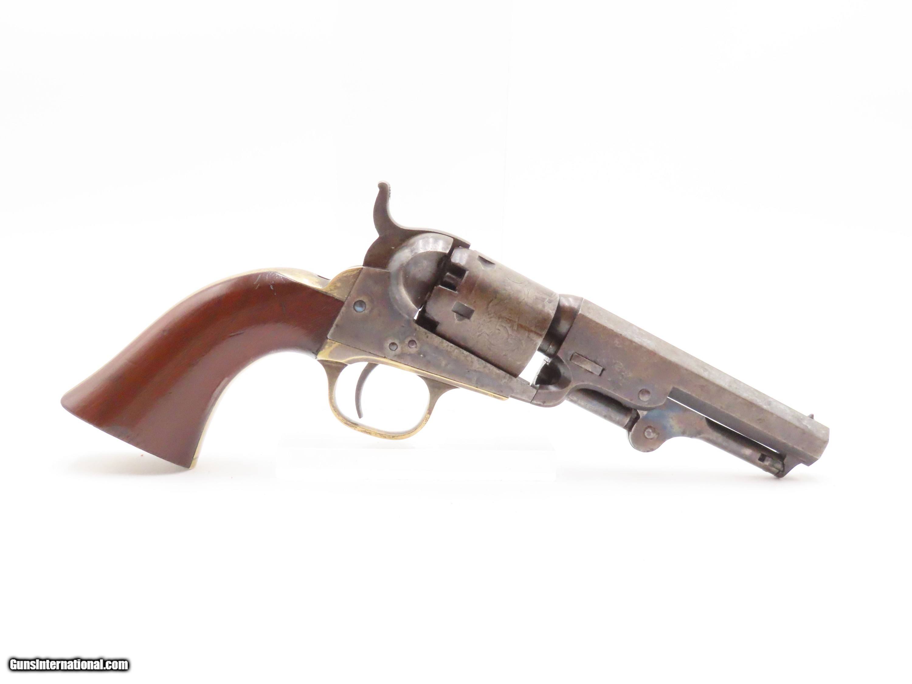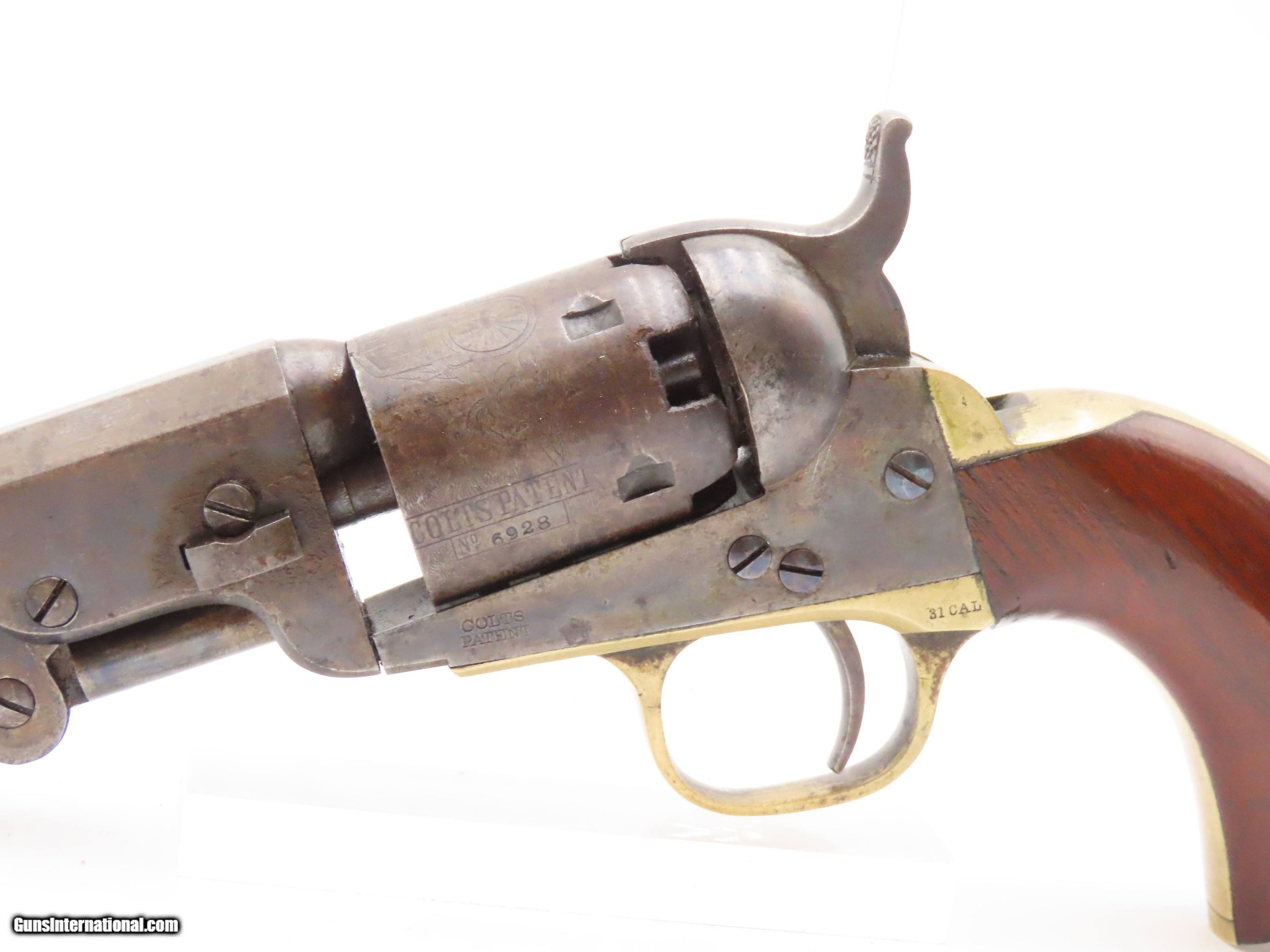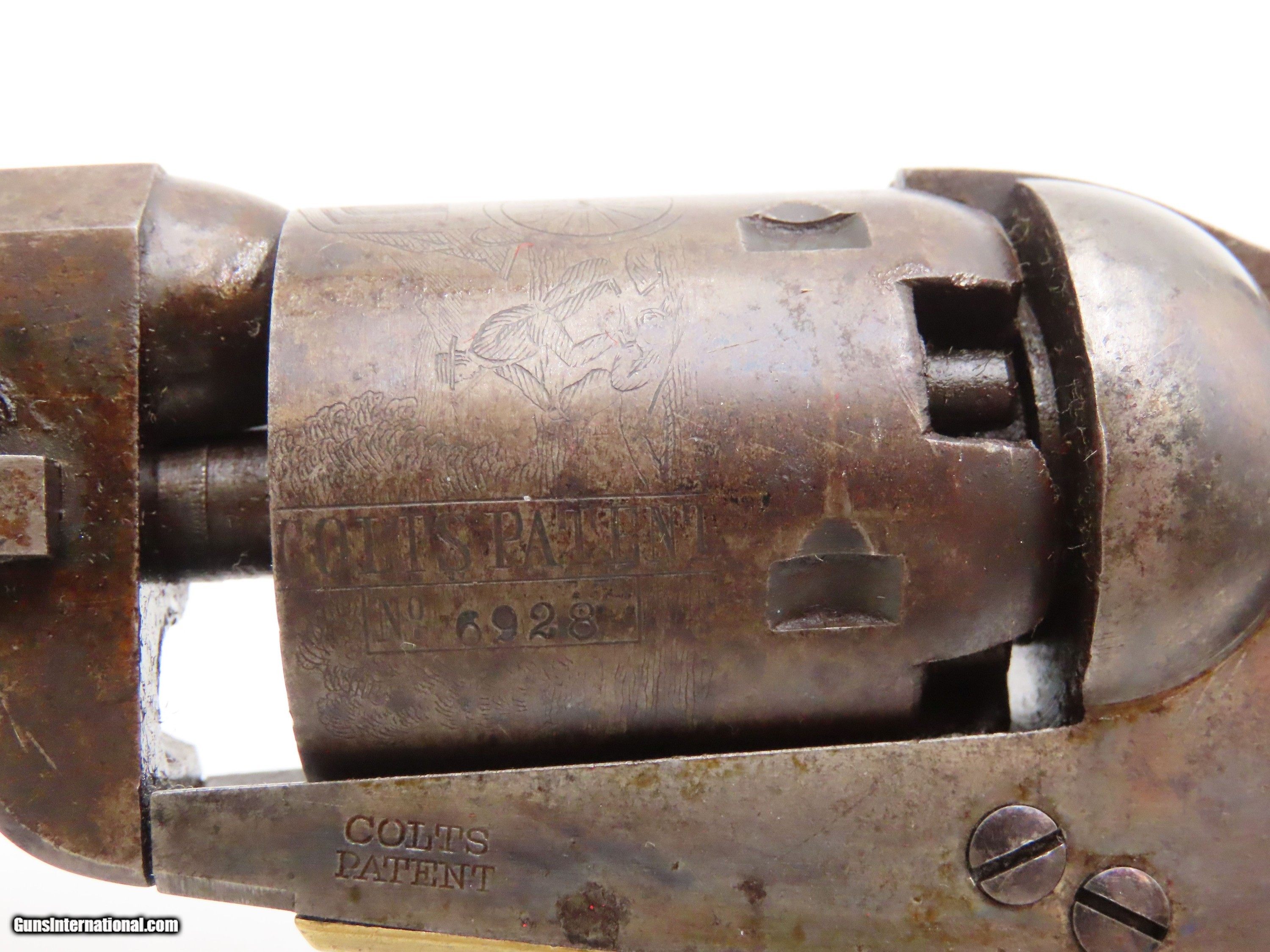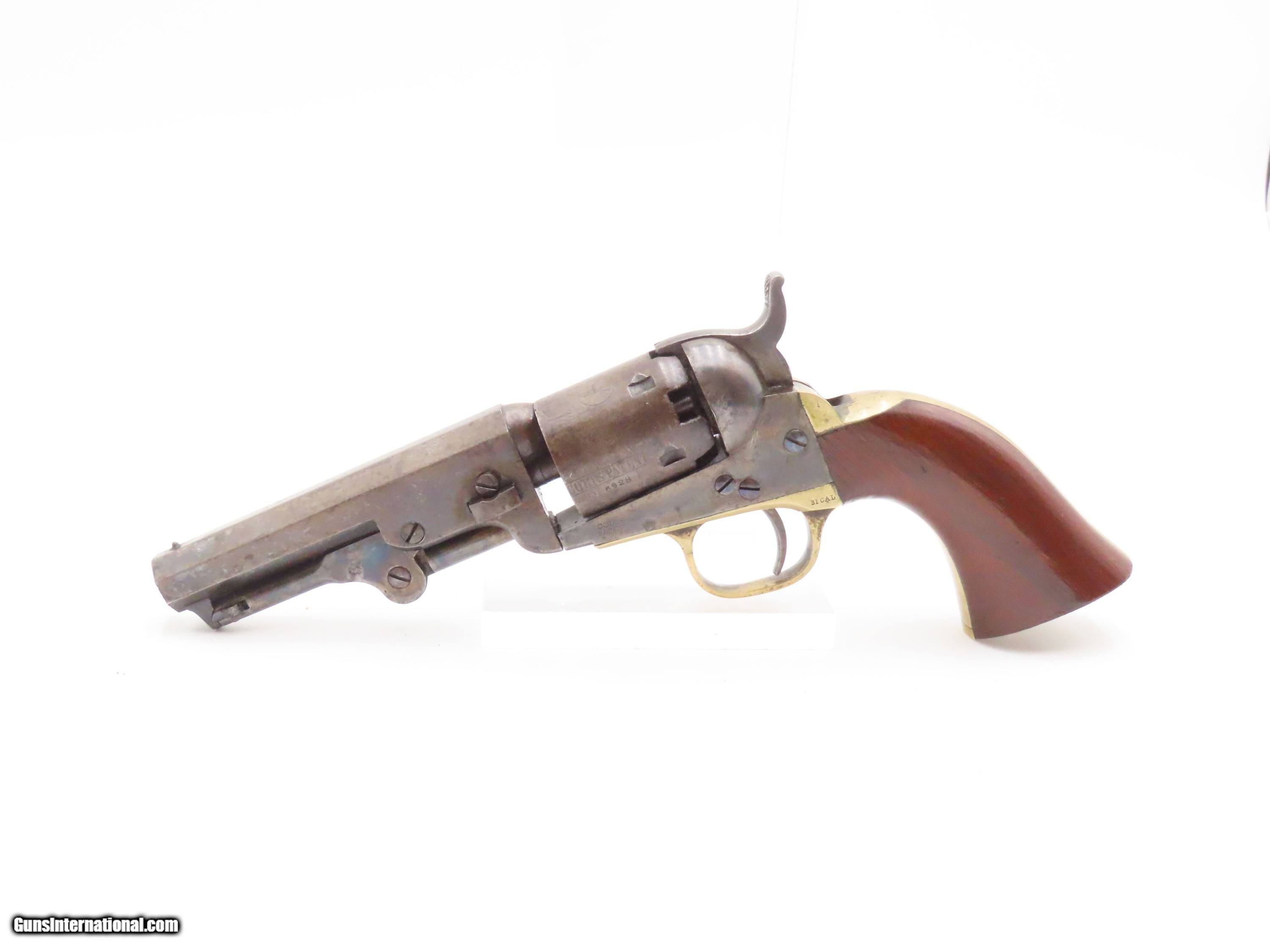 Description: HANDY Post-CIVIL WAR / WILD WEST Antique COLT M1849 Percussion .31 POCKET Nice WILD WEST/FRONTIER SIX-SHOOTER Made In 1871 Here we present an antique Colt Model 1849 Percussion Pocket Revolver, made in 1871 in Hartford, Connecticut. The Model 1849 Pocket, the replacement for the Baby Dragoon, was the most widely produced of any Colt percussion pistol. Nearly 340,000 were manufactured during its 23-year production run that ended in 1873. Over 280,000 of these were produced by Colt’s factory at Hartford by the end of the American Civil War in 1865. These were very popular and saw a lot of use on the battlefield, on the home front and in the West. These were some of the smallest, handiest pocket revolvers of the time. Though not a primary military arm during the American Civil War, these handguns were commonly privately purchased by soldiers for use on the battlefield. Whether legend or fact, it is interesting to note something commonly read about pocket revolvers of the day, that while they could be used for self-defense againstthe enemy, many soldiers kept them on their person to defend themselves against an unwanted amputation in the primitive field hospitals that were notorious, even in their day. The overall condition is nearing fine with some original finish and case colors preserved in low handled areas. Strong action. The bore is in good shape with serviceable rifling. Fine grip. Markings are legible. Numbers match. Loading lever is unmarked. Most of the cylinder scene is intact. Own the original! This is a legitimate antique and not a reproduction. Barrel is 4 inches. Caliber: .31 Percussion Overall condition as seen in photos. Very Fast. Very Safe. FREE SHIPPING WORLDWIDE. Delivered directly to your door by express mail! Guaranteed AUTHENTIC & Includes CERTIFICATE OF AUTHENTICITY. ancestryguns $2300 #250508 Antique: Yes Price: $2,300.00 Buy Now Pay with