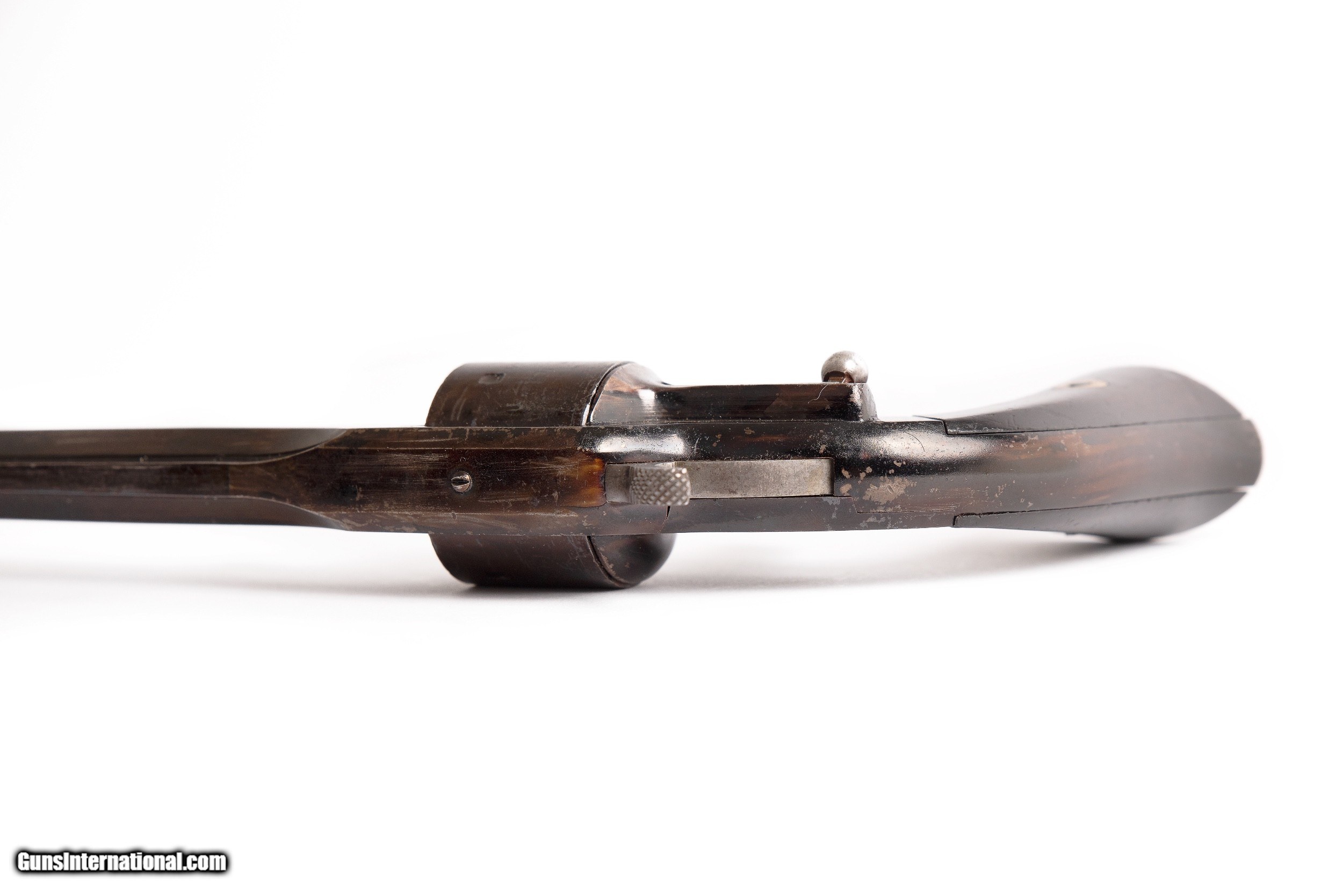 Description: An American Civil War era, iron frame, Plant revolver. It has rosewood grips, and a black Japanned finish on the frame, cylinder, and barrel. It is a transitional model with features of both the second and third models. Caliber: .42 Cupfire cartridge. Overall Length: 10.75 Barrel Length: 5.90 Condition: Frame, barrel & cylinder retain a large percentage of the original black Japanned finish – Hammer & Trigger with some remaining original case hardened finish – Grips retain most of their original finish with very minor marks – Action is crisp and tight SOLD Antique: Yes Manufacturer: Plant Model: Iron frame Serial Number: 585 Barrel Length: 5.90 Caliber Info: .42 cup fire Finish: black japanned |