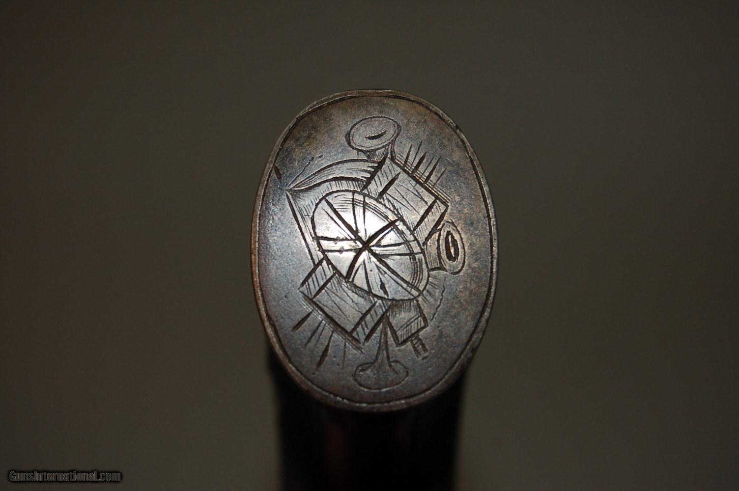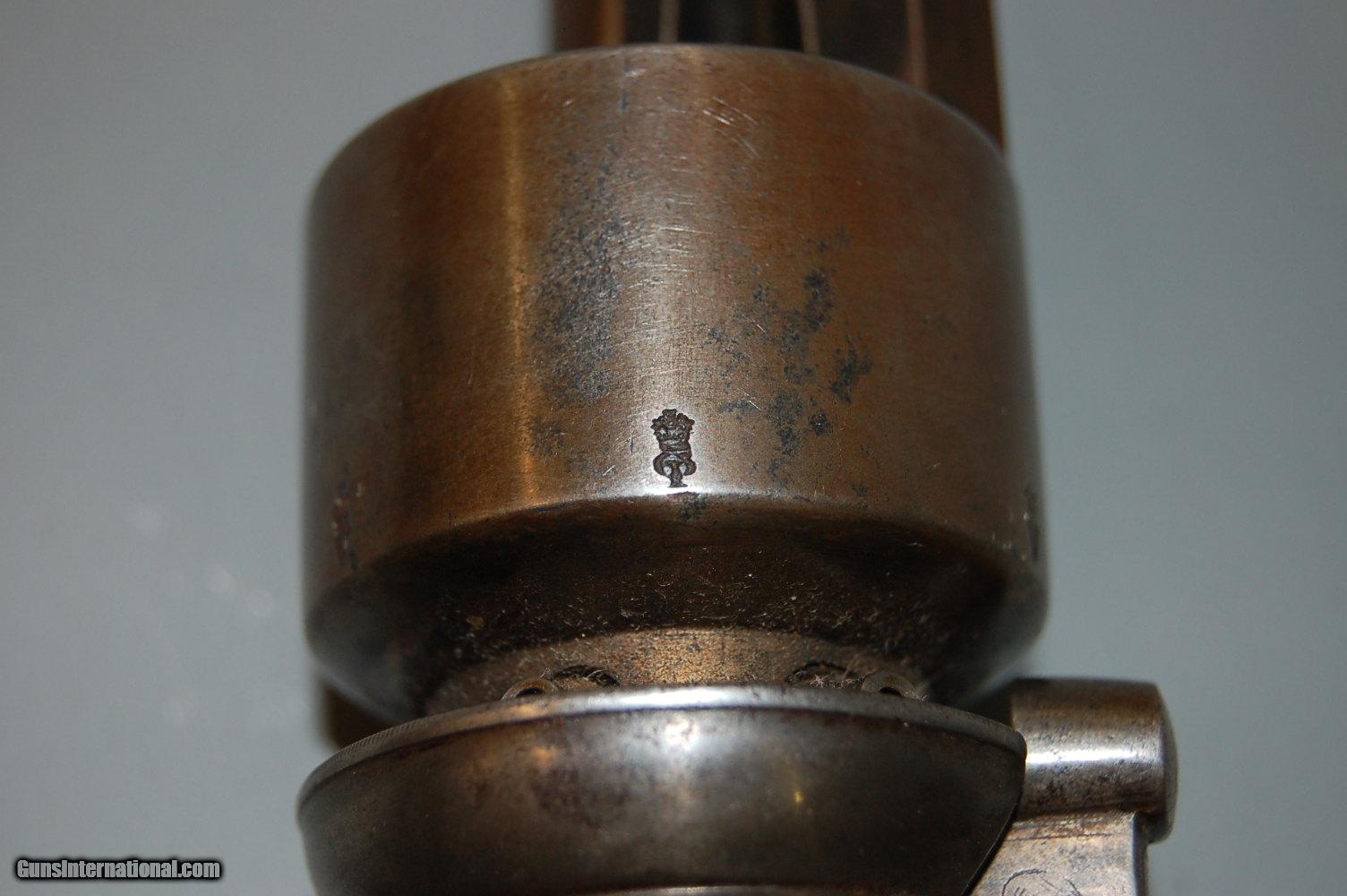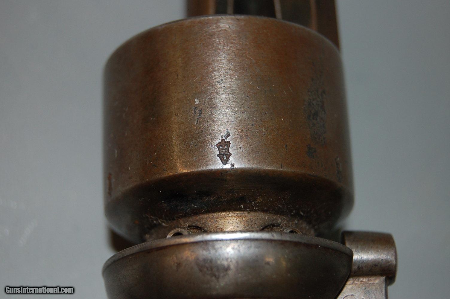 Description: Up for sale is this London proofed Double-Action Bar Hammer Transitional Percussion Revolver. The proofs date it's manufacture to between 1813 and 1855 at the earliest. Overall it is in very good condition, with only minor pitting on a few external surfaces like the grip strap and cylinder. The bore still has some rifling, but there is pitting throughout the bore and inside the cylinder chambers. There is fine leaf engraving throughout the sides of the frame, grip strap and hammer. On the left side of the frame amid the engraving is etched "PD. Coult's Patent", and on the right of the frame amid more engraving is etched "London". On the cylinder, between the chambers, are two proofs, alternating, all the way around. The first is a Crown above a capital V, the second is a Crown above a CP. These proofs are also stamped on the bottom of the barrel. The pommel also has an unknown engraving. The wood grips are checkered and in very good condition, with the left side bearing a diamond around the grip screw. Mechanically, the action functions but does not always cycle, and the timing is off a bit. SOLD Curio/Relic: Yes Antique: Yes Manufacturer: London Proof House Chambers: 6 Condition: Fine Metal Condition: Very Good Wood Condition: Very Good Bore Condition: Poor Barrel Type: Octagonal Action: Double-action Manufacture Date: 1813-1855 Engraving: Leaf Item Location: 85635 |