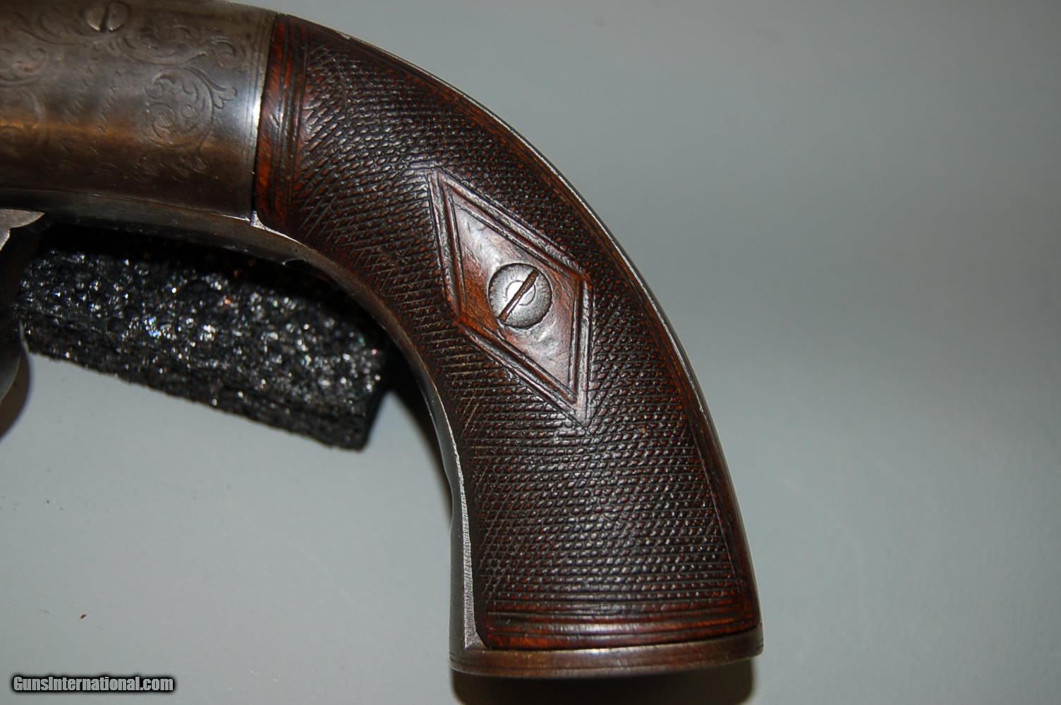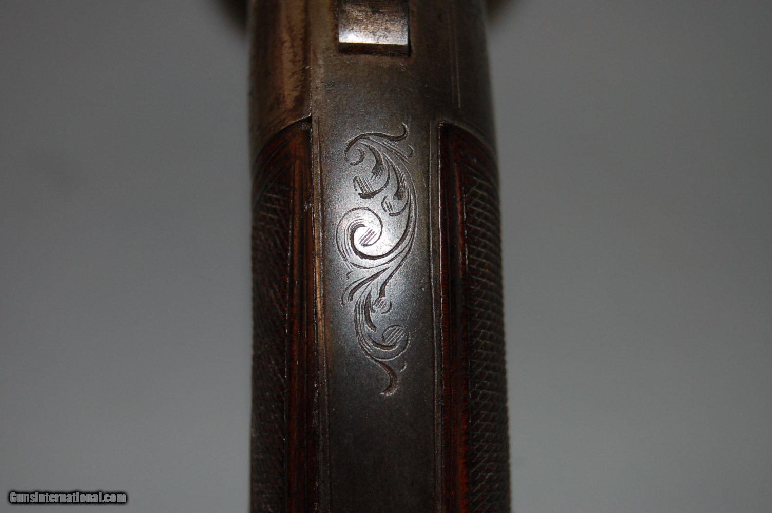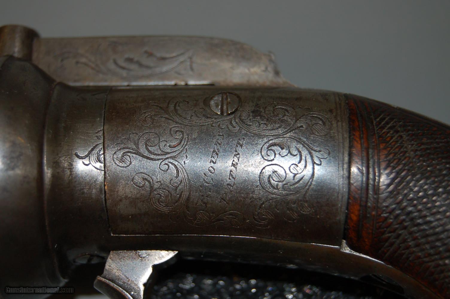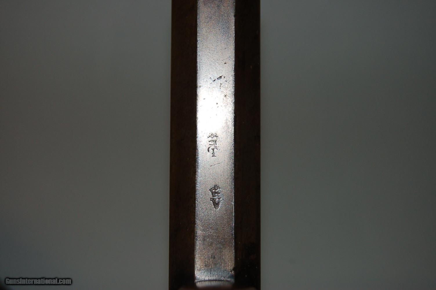 Description: Up for sale is this London proofed Double-Action Bar Hammer Transitional Percussion Revolver. The proofs date it's manufacture to between 1813 and 1855 at the earliest. Overall it is in very good condition, with only minor pitting on a few external surfaces like the grip strap and cylinder. The bore still has some rifling, but there is pitting throughout the bore and inside the cylinder chambers. There is fine leaf engraving throughout the sides of the frame, grip strap and hammer. On the left side of the frame amid the engraving is etched "PD. Coult's Patent", and on the right of the frame amid more engraving is etched "London". On the cylinder, between the chambers, are two proofs, alternating, all the way around. The first is a Crown above a capital V, the second is a Crown above a CP. These proofs are also stamped on the bottom of the barrel. The pommel also has an unknown engraving. The wood grips are checkered and in very good condition, with the left side bearing a diamond around the grip screw. Mechanically, the action functions but does not always cycle, and the timing is off a bit. SOLD Curio/Relic: Yes Antique: Yes Manufacturer: London Proof House Chambers: 6 Condition: Fine Metal Condition: Very Good Wood Condition: Very Good Bore Condition: Poor Barrel Type: Octagonal Action: Double-action Manufacture Date: 1813-1855 Engraving: Leaf Item Location: 85635 |