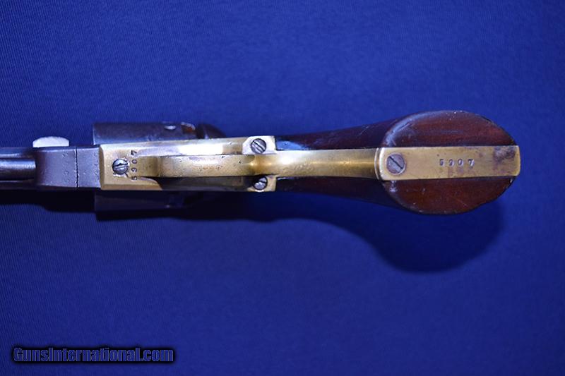 Description: Manhattan Firearms “Series V” .36 Caliber Percussion Revolver, a.k.a. “Navy Type”, 6 ½” bbl., 6 shot, serial number 5,XXX circa 1867-68. Features 2 line barrel address, “MANHATTAN ARMS CO. NEWARK N.J./PATENTED MARCH 8, 1864”. All matching serial numbers except for wedge. Overall in very good condition showing a smooth dark gray patina throughout with traces of original finish & about 70%+ cylinder scene. Walnut grips are in very good condition & are a good fit with minor handling marks. Action is very good with correct timing & bore is good with some pitting. Wedge screw is broken. Nice example of a Manhattan .36 “Series V”. Big Iron Firearms & Collectibles is a family owned & operated business. We are a licensed FFL Dealer & stand behind all of our listings. We try to replicate all aspects of the firearm in our photos & if you’re not completely satisfied, we will refund 100% of the purchase price during the 3 day inspection period. We Do Not Charge credit card fees, all major credit cards are accepted. We offer a 2% discount on sales price for items purchased with a money order, cashier or personal check, with item held until cleared. Will M. at 260-319-6961 SOLD Curio/Relic: Yes Antique: Yes |