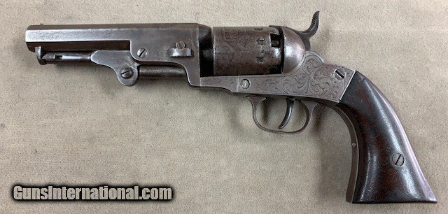 Description: This is an incredible find. Manhattan Firearms knocked off Colt's Percussion Pocket Model and made 1000 guns in 1858 after Colt's Patent had expired, but Colt sued them anyway. They made 988 of these 1st series revolvers in .36 caliber with 4,5,and 6 inch barrels - and they made 12 with 4 inch barrels in .31 caliber. This is one of those 12 and also it is factory engraved revolver in a mahogany casing with original manhattan .31 cal bullet mold, nipple wrench, eagle flask, and box of Wincheser percussion caps. Photos show the original condition of this wonderful revolver. Please note the revolver was originally equipped with a belt hanger on the right side and this was removed prior to sale because of the risk of another lawsuit from Col Colt. A very rare and important Manhattan revolver in what appears to be its original or period casing. SOLD Curio/Relic: Yes Antique: Yes |