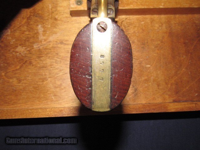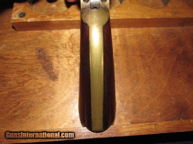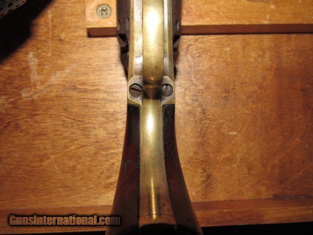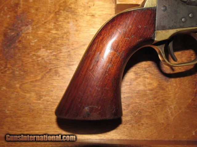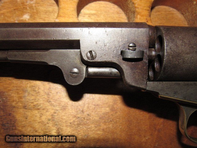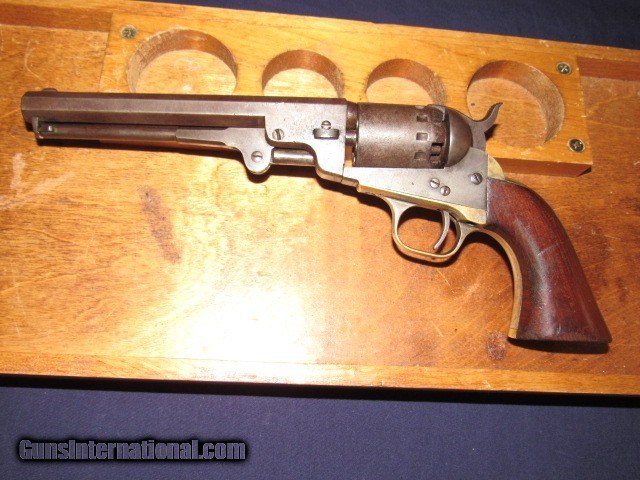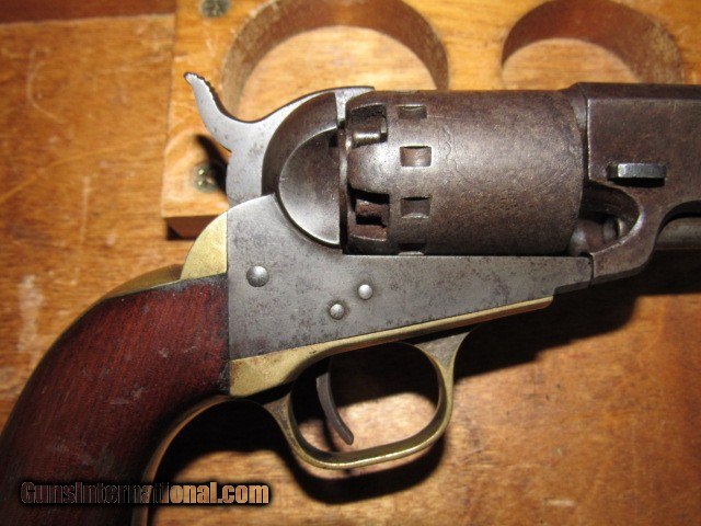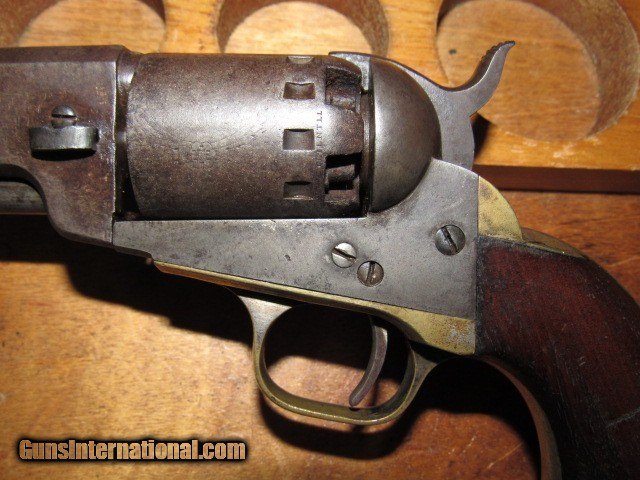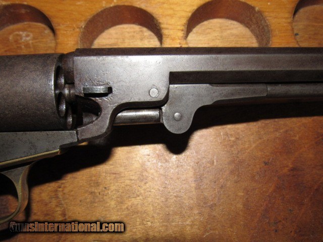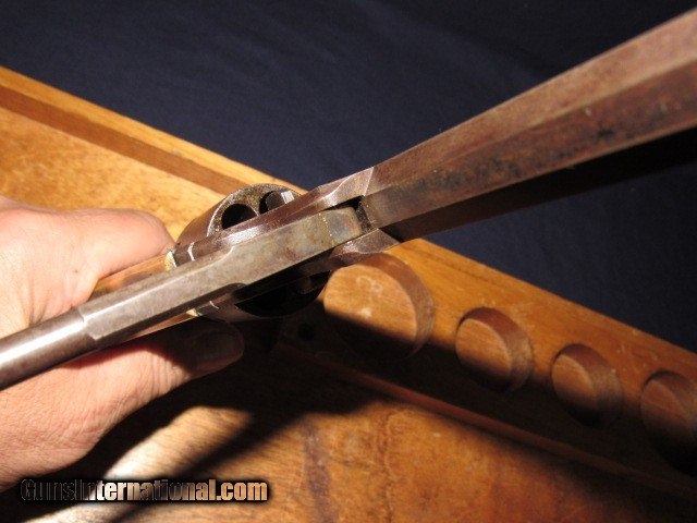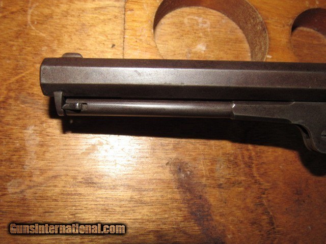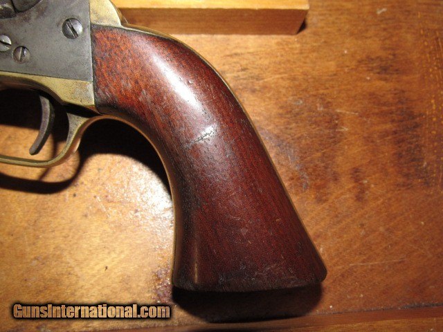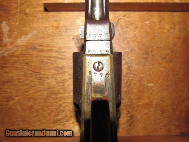 Description: *** SOLD JOHN IN BATON ROUGE *** Manhattan Firearms Company of New Jersey manufactured these Navy caliber percussion revolvers in five different series. This is a Series V, which had their own serial number range, made from early 1867 to late 1868. Only 9,000 of this series were produced. This one is serial number 8777, so it's near the end of production. 6 shot cylinder, blued and case hardened finish, brass trigger guard and back strap, walnut grips, 6.5" octagon barrel, single action revolver. Barrel has the two-line address correct for these late-model revolvers. Basically a smaller version of the Colt 1851 Navy, with the major difference being the 12-stop cylinder compared to the 6-stop cylinder of the Colt. CONDITION: All blued and case hardened surfaces have 2% original finish remaining that has turned patina. Good but pitted bore. Very tight action that locks up solidly at both half cock and full cock, indexing perfectly. Nice, mellow brass. Very good walnut grips retaining a good amount of the original varnish. Serial number matches on cylinder, grip, trigger guard, frame, barrel and wedge. Cylinder retains 50% of the scene. A decent Indian Wars/Post-Civil War percussion revolver that will nicely fill a hole in your collection. TERMS: Shipping to the Continental US States will be a flat $30 with insurance included. We are registered with the CA DOJ and will ship to California! No international sales, no sales to New York City, and no sales to Alaska or Hawaii. Antique so it can ship directly to you assuming your local laws allow it. 3 day non-firing inspection period; buyer pays return shipping. Payment by bank check, money order or personal check; all major credit cards are accepted with a 4% convenience fee added. Ships by USPS Priority Mail Large Flat Rate Box with tracking. Always interested in Civil War items, as well as used long guns and used antique handguns so please contact me if you have anything for sale or trade. 315.251.4799 with questions or concerns. Please keep in mind that I work a full-time job during the week and may not be able to immediately respond to your text, phone, or email message. Thanks for looking! SOLD Antique: Yes Handgun Caliber: .36 Manufacturer: Manhattan Model: Navy Serial Number: 8777 Barrel Length: 6.5" Octagon Action: Single Action Revolver Triggers: Standard/plain Stock: Walnut Sights: Standard Manufacture Date: 1868 Item Location: New York |