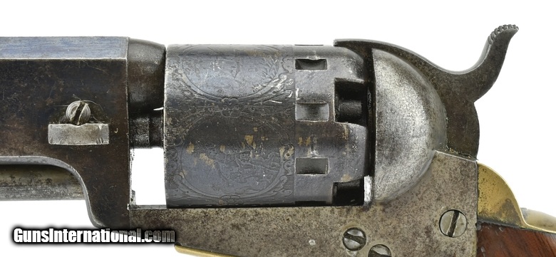 Description: Manhattan Navy 2nd Series. Made circa 1860. .36 caliber with a 6 ½” barrel. Approximately 50% of the original blue on the barrel. Dark gray patina on the frame. Grips are excellent. Silver still remains on the straps in protected areas. Cylinder scene is visible. The cylinder has been refinished. SOLD Antique: Yes |