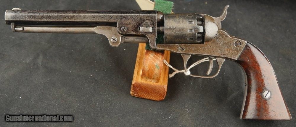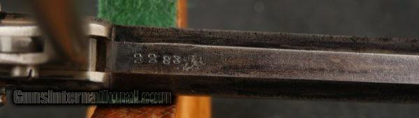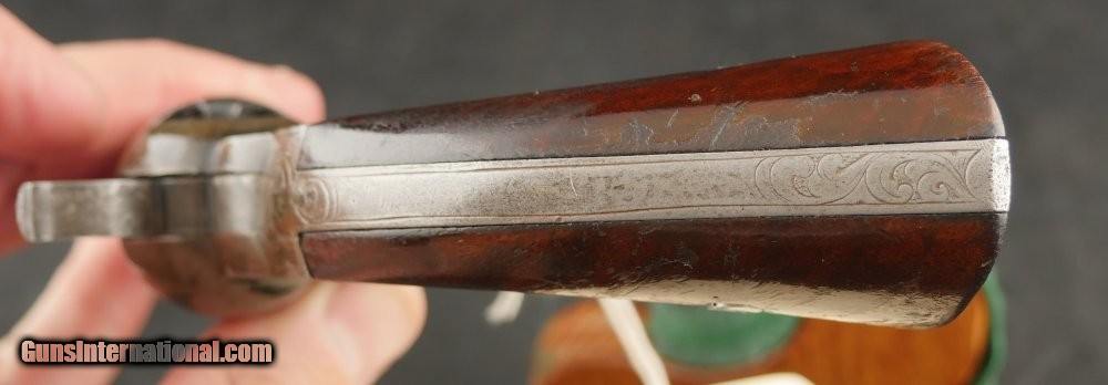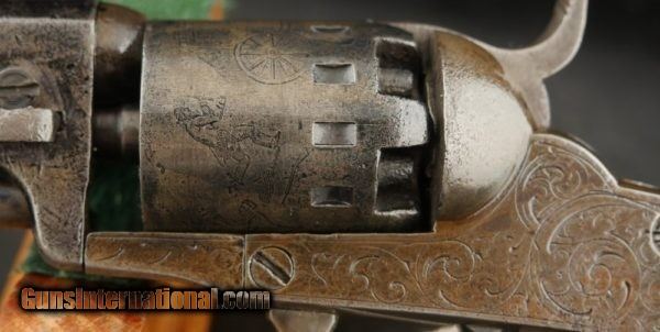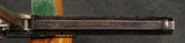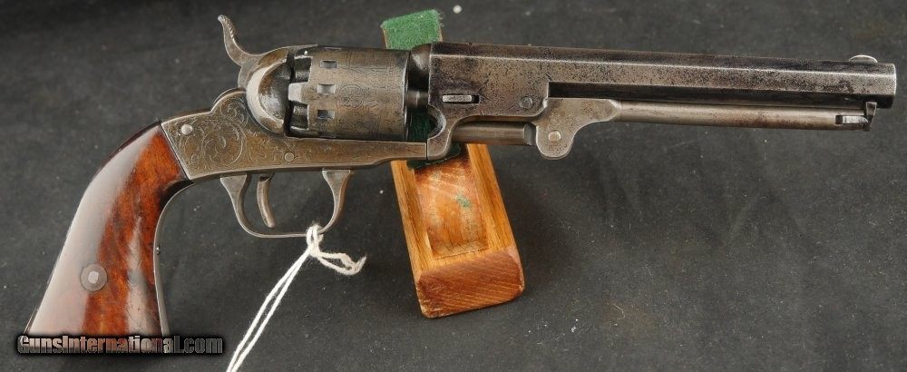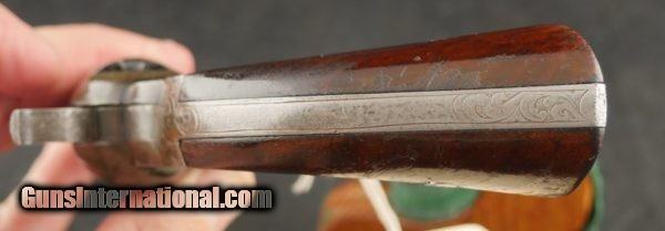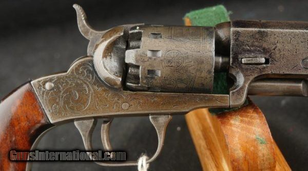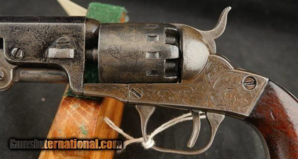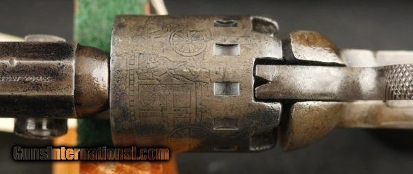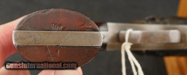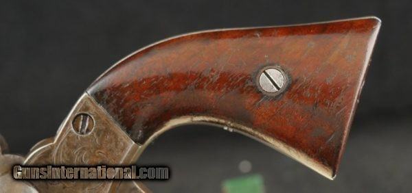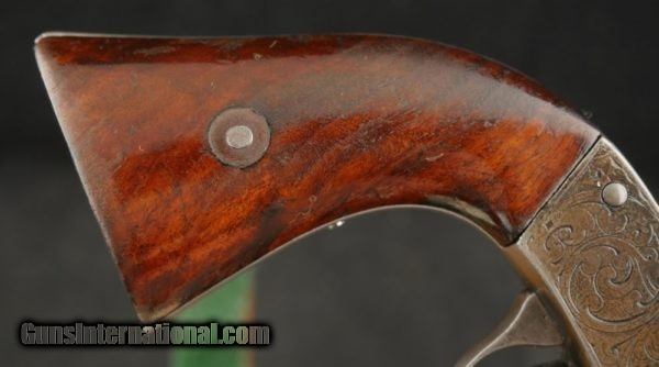 Description: Manhattan Pocket, .31, 6 shot with factory engraved frame. Long 6 inch barrel with burl type grips. The gun shows 90% scene, there has been some light color touchup, no buffing or sanding. Scattered fine bumps and dings with patches of very fine pinpricks. Crisp tight action. Trace of original blue on bottom of barrel. #22xx very good overall. SOLD Antique: Yes |