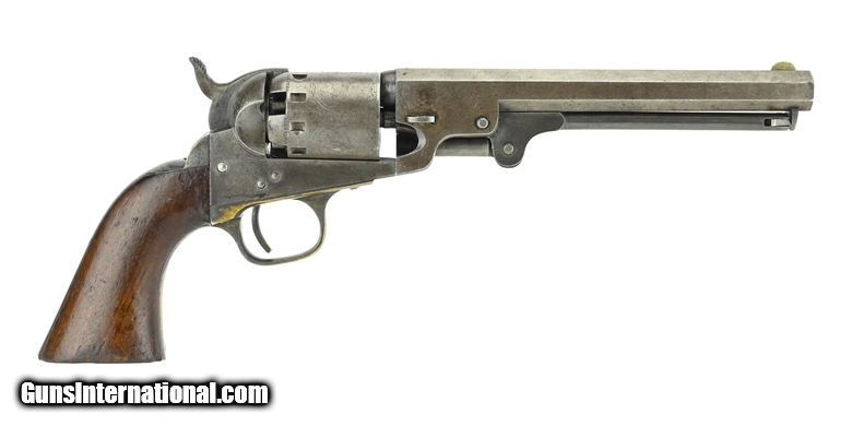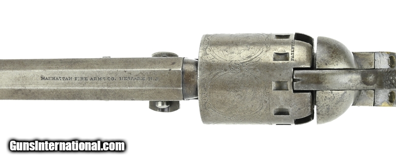Manhattan Series III .36 caliber revolver. 5-Shot cylinder with 1859 patent date cylinder cameo. Scenes are perfect. Bore is mirror bright with excellent rifling. Barrel length 6 ½”. Action works and Indexes. Markings and barrel flats are all sharp. Grips have no chips or cracks. Varnish is somewhat flaked. Overall a fine Manhattan.