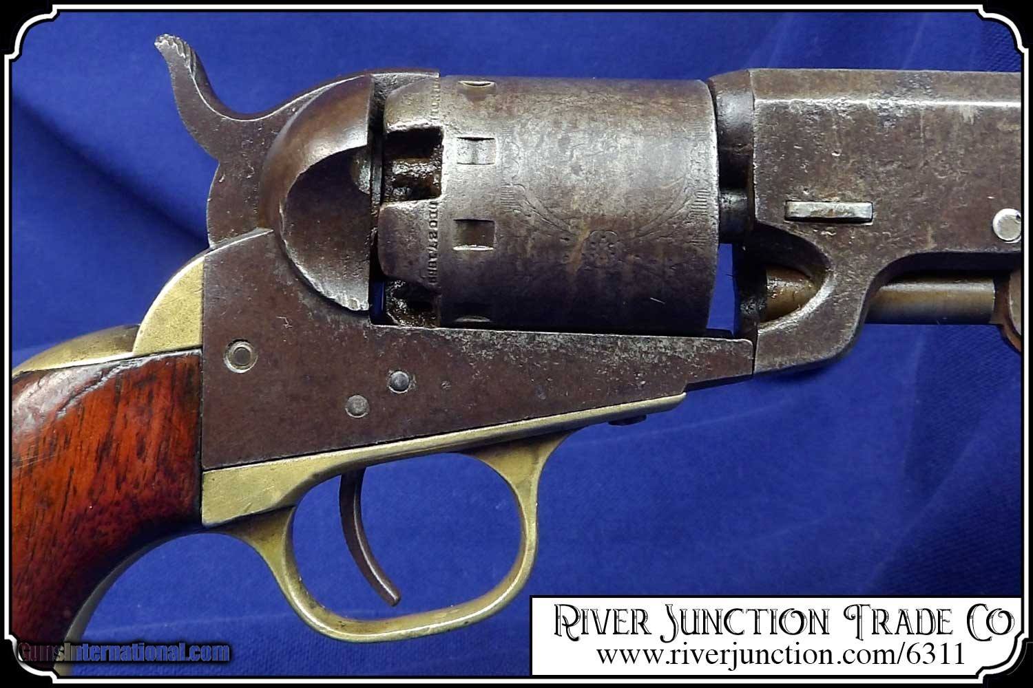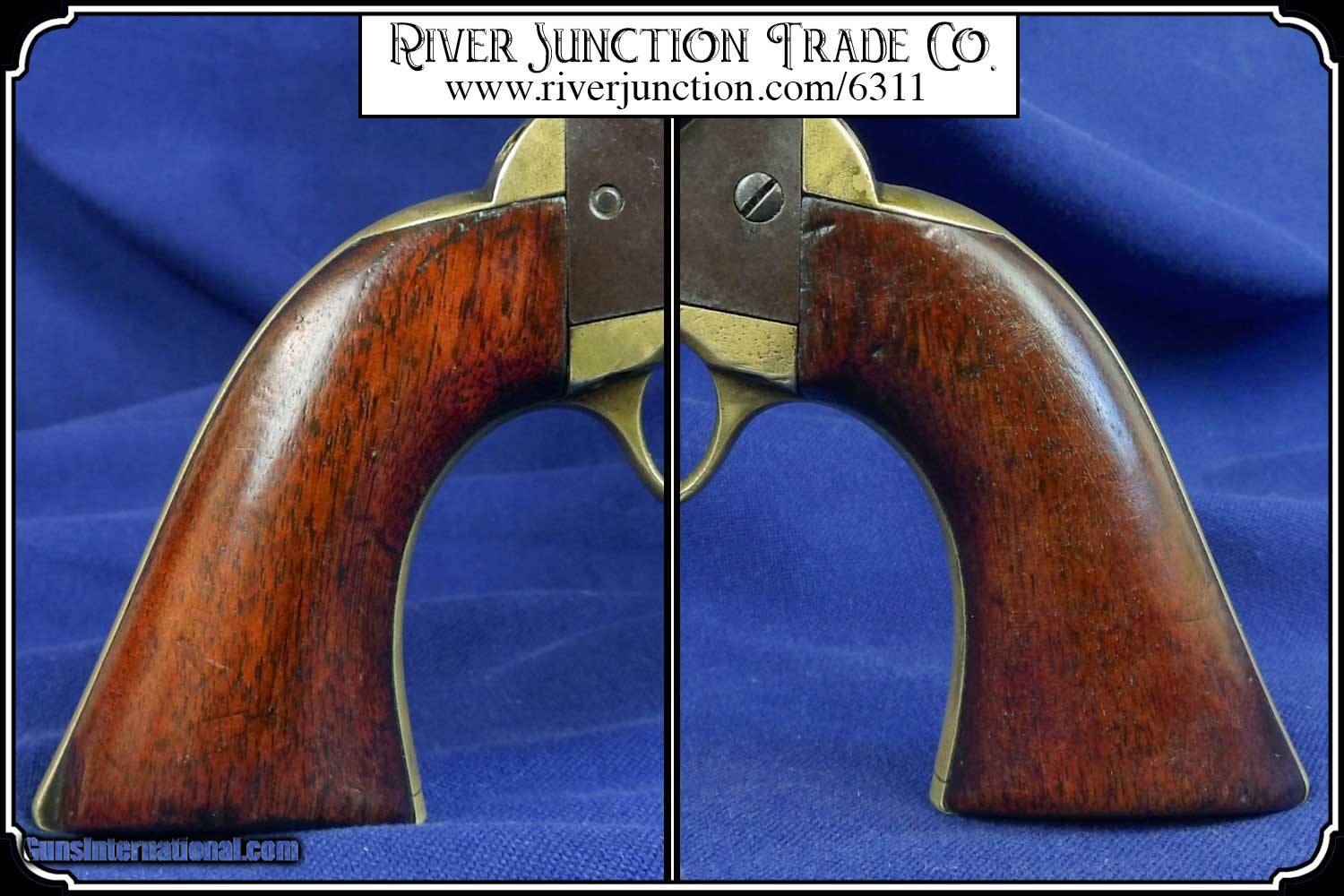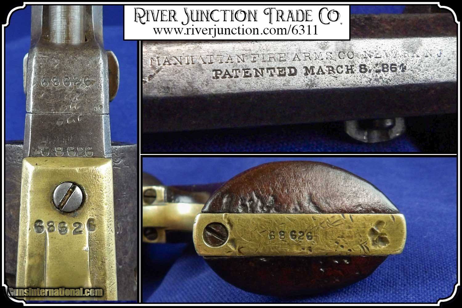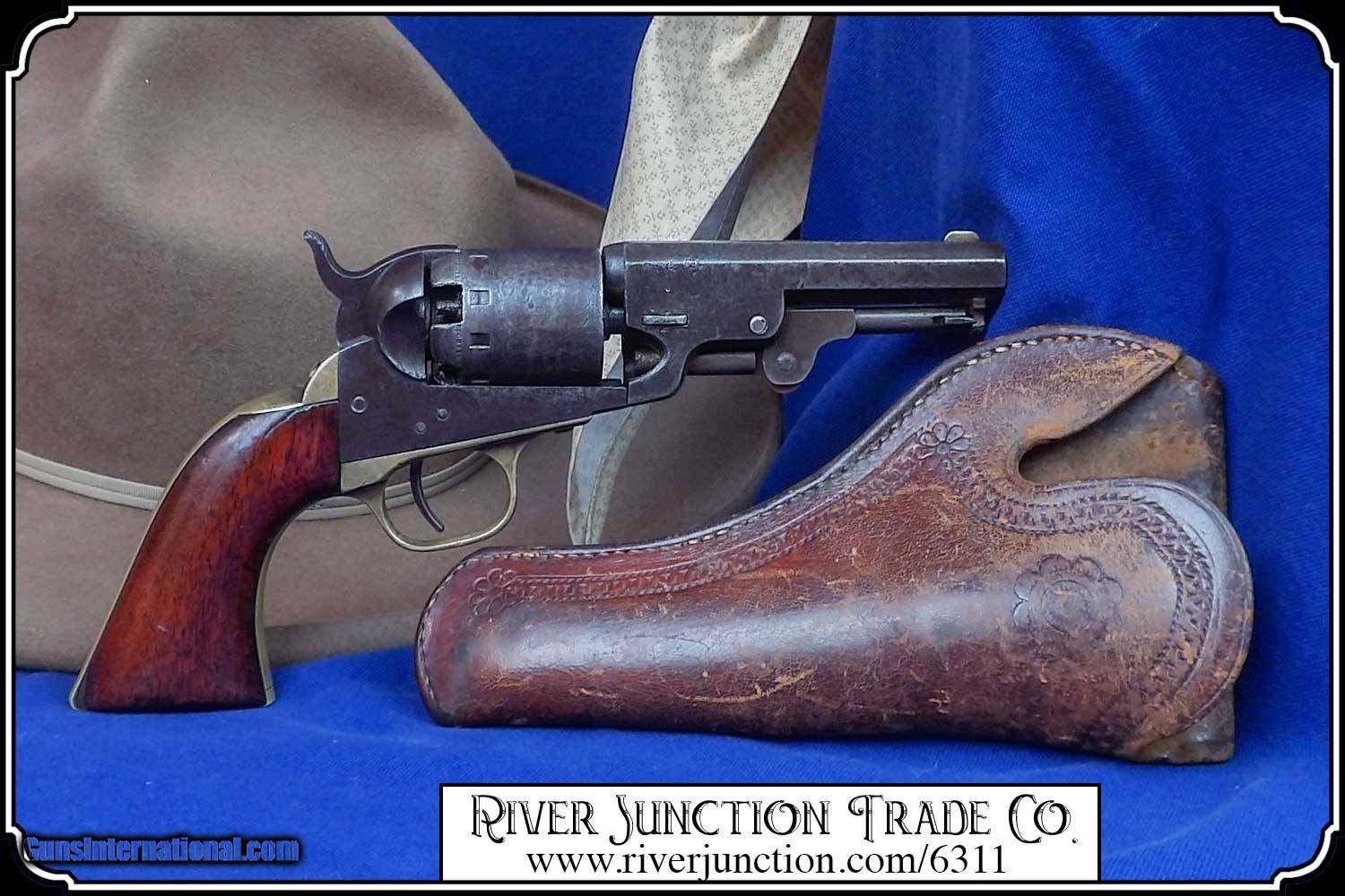 Description: This is very nice Manhattan Series lll, four-inch barrel Pocket Navy revolver with serial number 68626 and has all matching numbers. It has blue faded to a dark blue brown patina., 80% cylinder scene, with no case colors remaining and the trigger guard and back strap shows all brass. The grip has a few handling marks, no chips. The mechanical function is very good crisp and tight with very strong rifled bore. All of the markings and numbers are readable. These were nearly an exact copy of a Colt Pocket Navy. The original antique, perfect fit holster is included. Payment: Item, can be ordered on line with a credit card or paypal on our sight. Just Google (riverjunction) and type in the River Junction Trade Co. item number (6311) in the search box. Before you checkout you will see shipping cost and total. OR If you prefer: Pay by cash, postal money order, cashiers check, personal & business checks. We wait for checks to clear. We always answer questions and entertain offers. Have questions? Call me 563-880-4588. Jim SOLD |