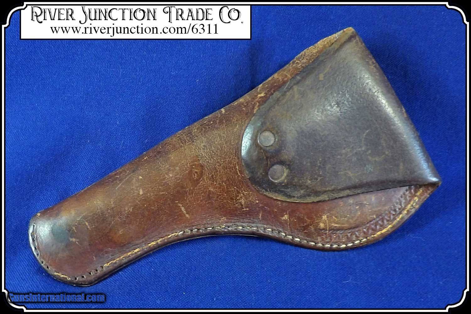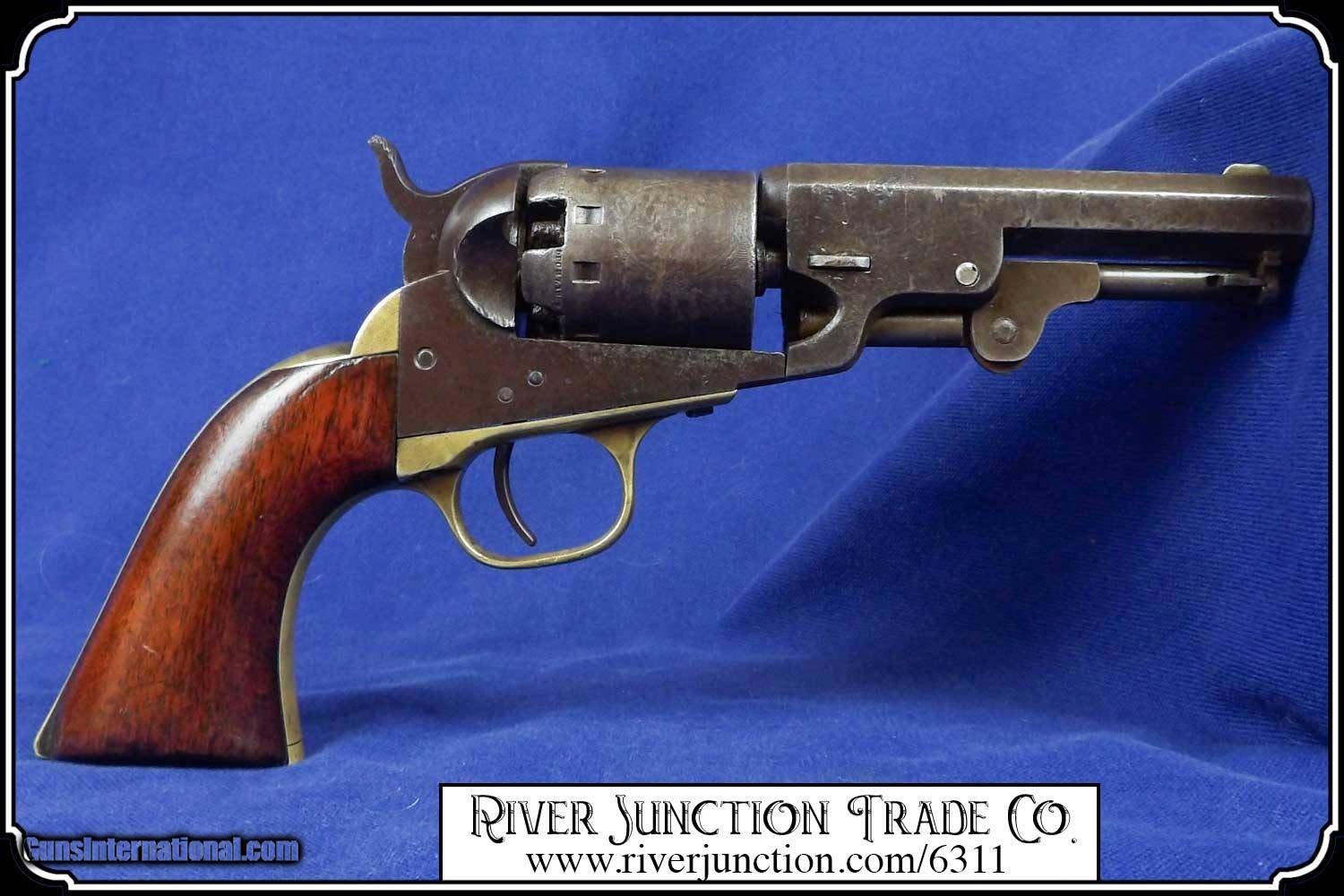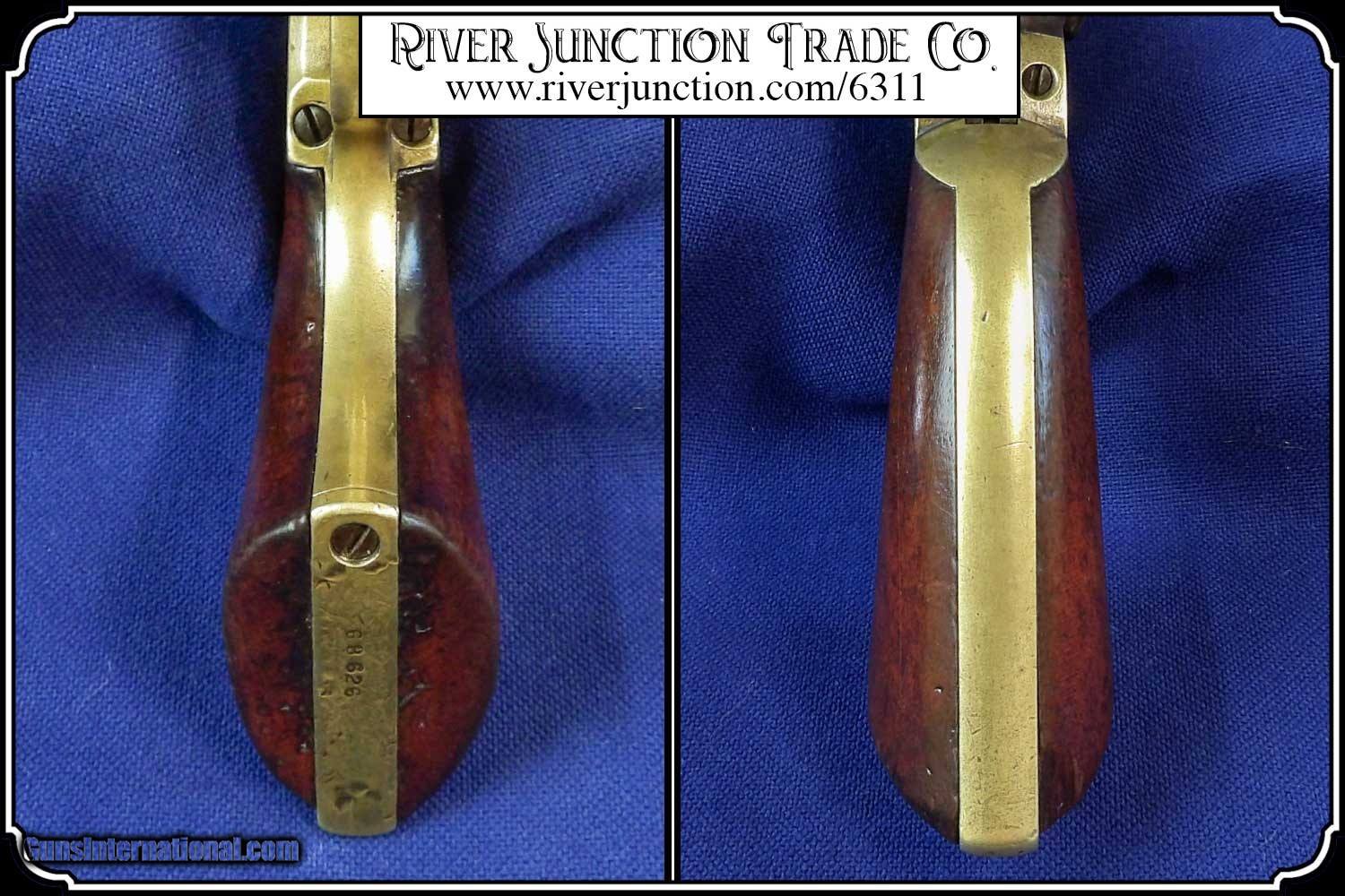 Description: This is very nice Manhattan Series lll, four-inch barrel Pocket Navy revolver with serial number 68626 and has all matching numbers. It has blue faded to a dark blue brown patina., 80% cylinder scene, with no case colors remaining and the trigger guard and back strap shows all brass. The grip has a few handling marks, no chips. The mechanical function is very good crisp and tight with very strong rifled bore. All of the markings and numbers are readable. These were nearly an exact copy of a Colt Pocket Navy. The original antique, perfect fit holster is included. Payment: Item, can be ordered on line with a credit card or paypal on our sight. Just Google (riverjunction) and type in the River Junction Trade Co. item number (6311) in the search box. Before you checkout you will see shipping cost and total. OR If you prefer: Pay by cash, postal money order, cashiers check, personal & business checks. We wait for checks to clear. We always answer questions and entertain offers. Have questions? Call me 563-880-4588. Jim SOLD |