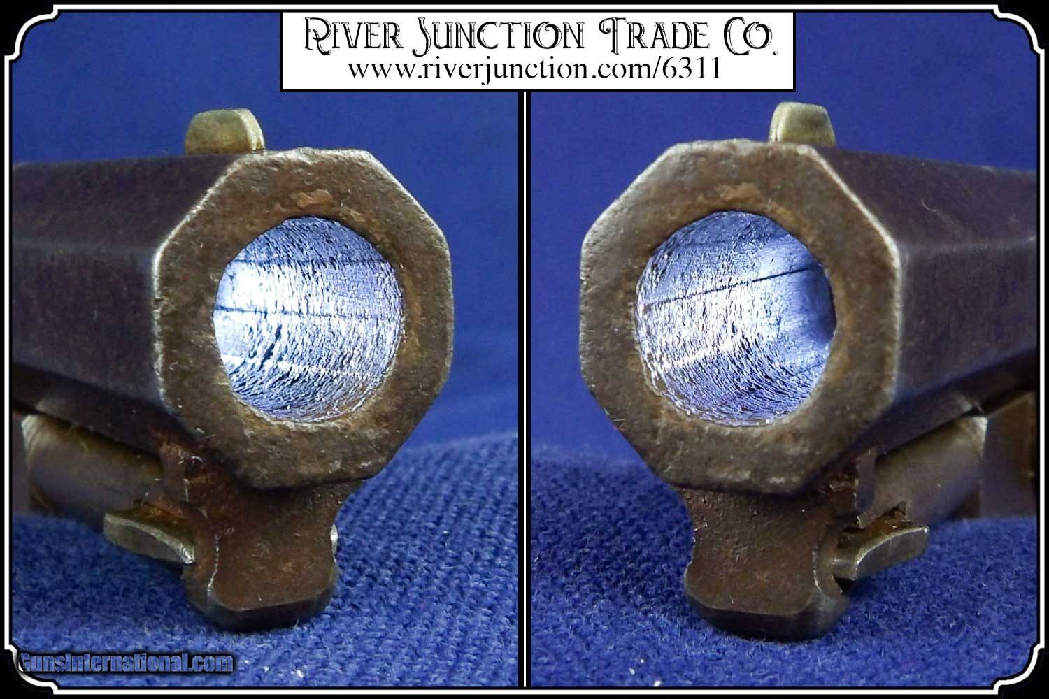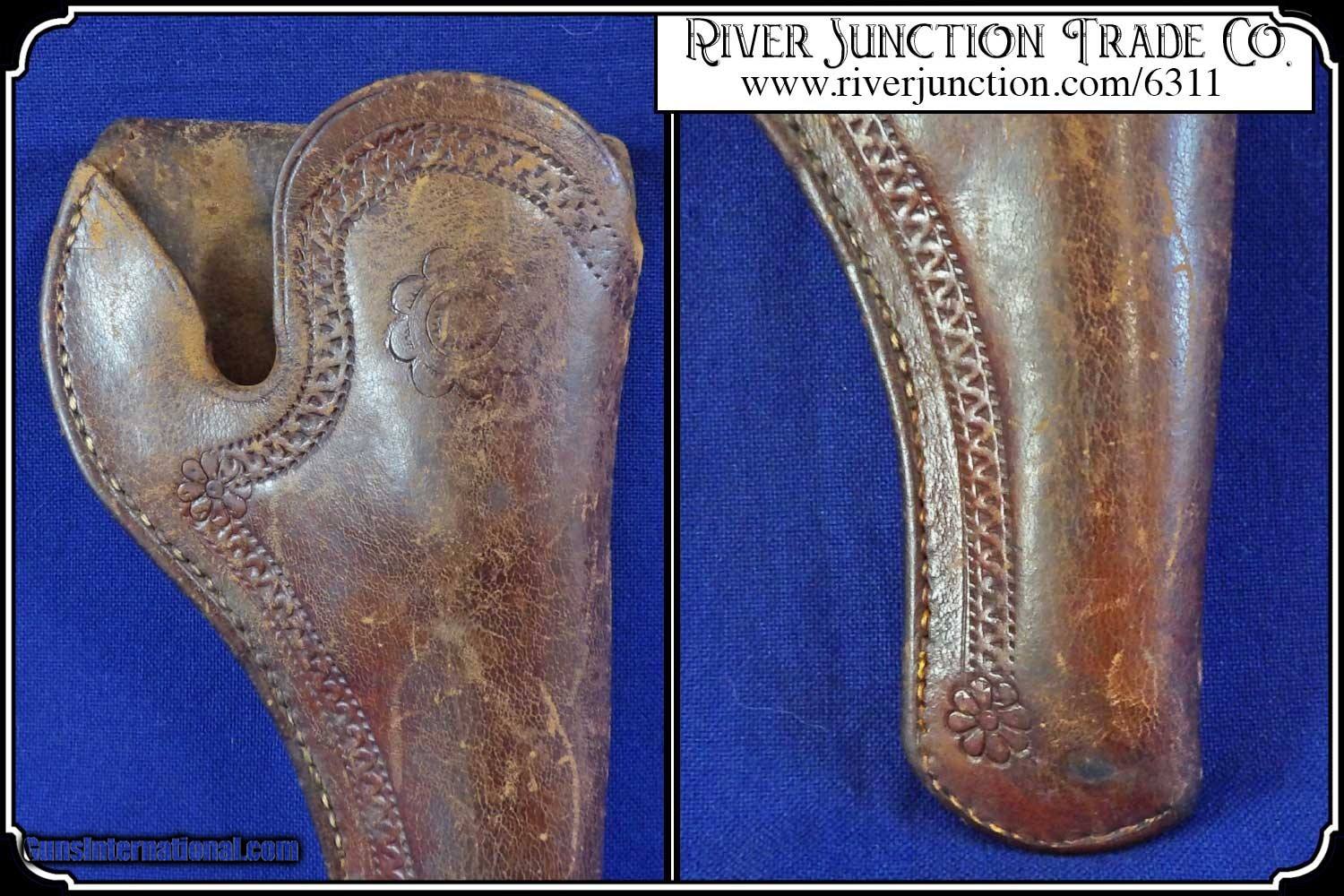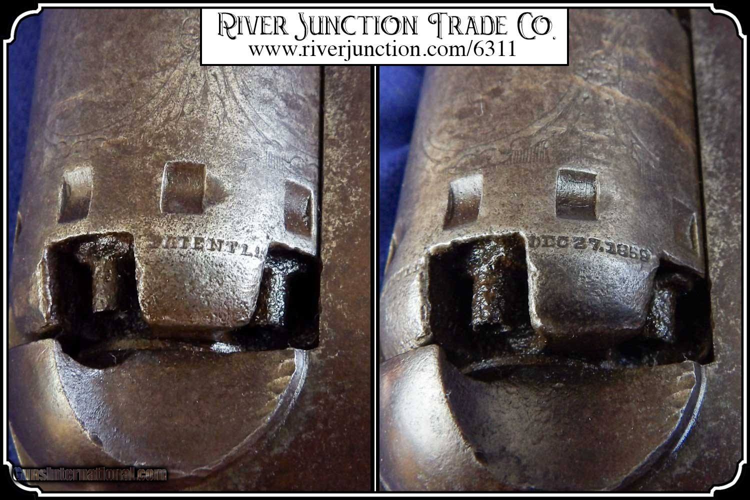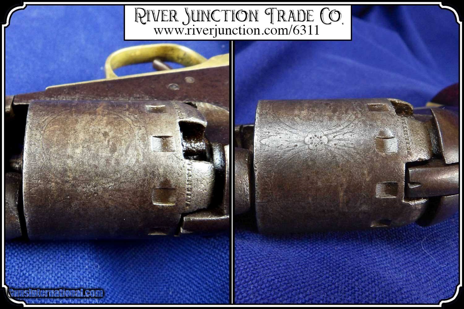 Description: This is very nice Manhattan Series lll, four-inch barrel Pocket Navy revolver with serial number 68626 and has all matching numbers. It has blue faded to a dark blue brown patina., 80% cylinder scene, with no case colors remaining and the trigger guard and back strap shows all brass. The grip has a few handling marks, no chips. The mechanical function is very good crisp and tight with very strong rifled bore. All of the markings and numbers are readable. These were nearly an exact copy of a Colt Pocket Navy. The original antique, perfect fit holster is included. Payment: Item, can be ordered on line with a credit card or paypal on our sight. Just Google (riverjunction) and type in the River Junction Trade Co. item number (6311) in the search box. Before you checkout you will see shipping cost and total. OR If you prefer: Pay by cash, postal money order, cashiers check, personal & business checks. We wait for checks to clear. We always answer questions and entertain offers. Have questions? Call me 563-880-4588. Jim SOLD |