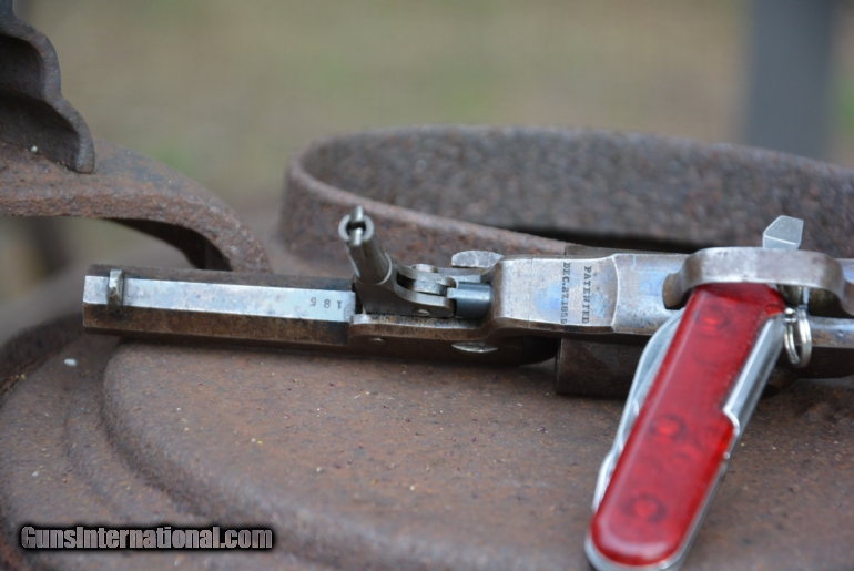 Description: The action is crisp timming is correct on the 5 shot pocket 31 Manhattan i would think this is the rarest of all the manhattans with less than3 doz in existance.the finish is a mottled brown patina mixed with blue and most blue in the protected areas. the wood grips show lightly rubbed varnish of 90 % with no chips cracks or missing peices. All markings are clear and sharp as well as cylinder scean is 95% . After carefuk research I have ascertained that Manhattan arms co made these from left over parts and that they were 2nds with may be a mistake in engraving .You can do some research and check the net and see ive yet to find another thats available....what i like about this one is its origininal and has not been played with or cleaned. All the marking are sharp and clear as are the patent dates on the trigger guard. The serial # is 18x.........circa about 1860 i ship to the world.............i accept bank wire transfer or US postal money order SOLD Antique: Yes |