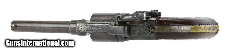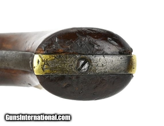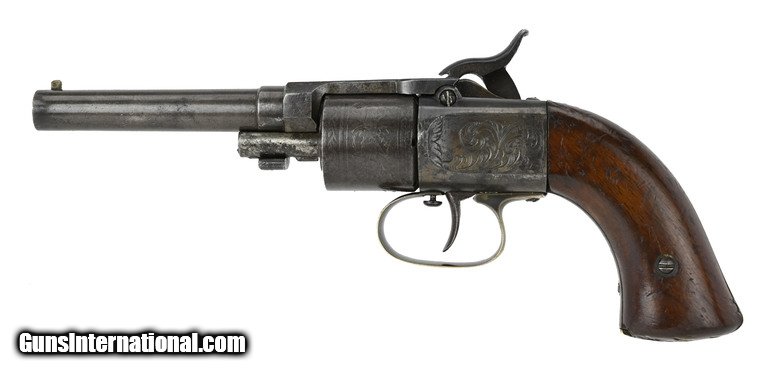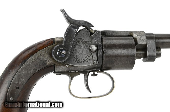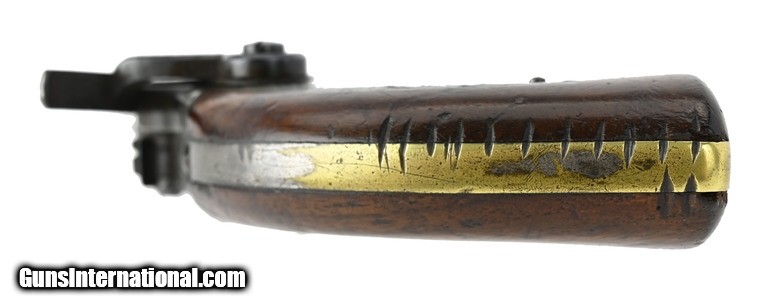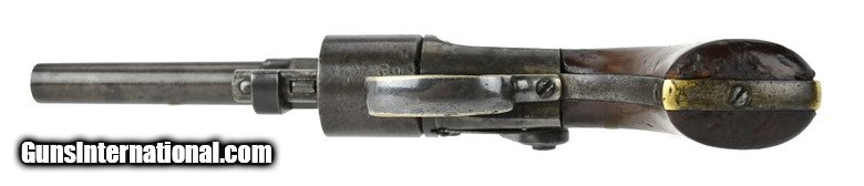Description: Mass. Arms Co. Maynard Tape Primed Pocket Revolver .31 Caliber Unusual example with a 4” barrel, instead of the 3.5” that is believed to be the maximum length. Bore has strong rifling. Frame is engraved. Etched cylinder scene is mostly visible. Side plate has a very clear eagle and Maynard patent markings. Trigger guard has 98% of its original tarnished silver, as does the front grip strap. Grips has no chips or cracks but has dents on the underside of the grip. The backstrap has 13 notches, presumably for 13 kills or bullseyes or broken bottles. Normally we do not like notches on grips but these have a look of credibility. Upon opening the side door for the Maynard metal tape primer we found the normally missing tape primer in place and intact. If you buy this revolver, do not lose the tape primer. They sell for $100 or more and are very scarce. Presently, the tape does not advance when cocking the hammer. The mechanism works and would advance by resetting the tape. We recommend you do not do that as you will likely fire a cap if you let the hammer fall on the cap. Overall a verynice example with some interesting features (4” barrel). Has an even good looking patina overall. SOLD Antique: Yes |