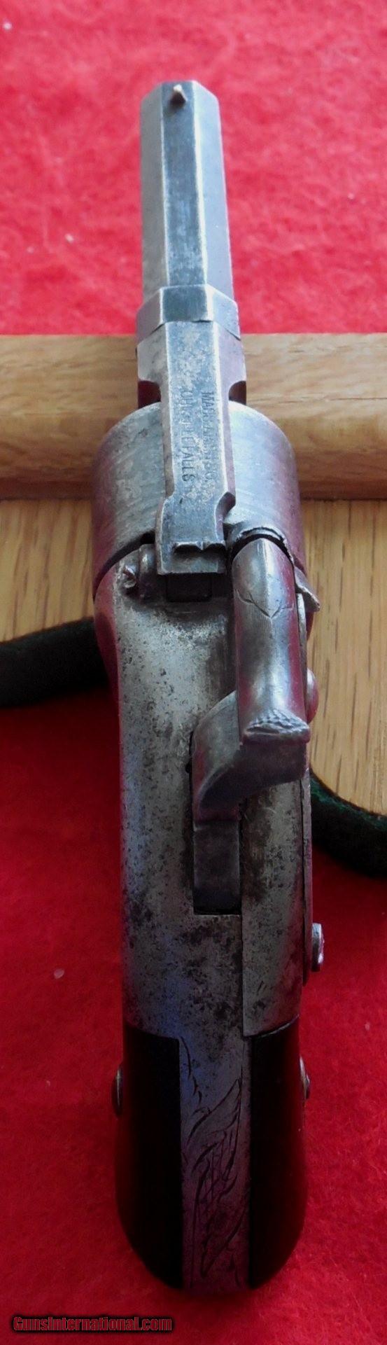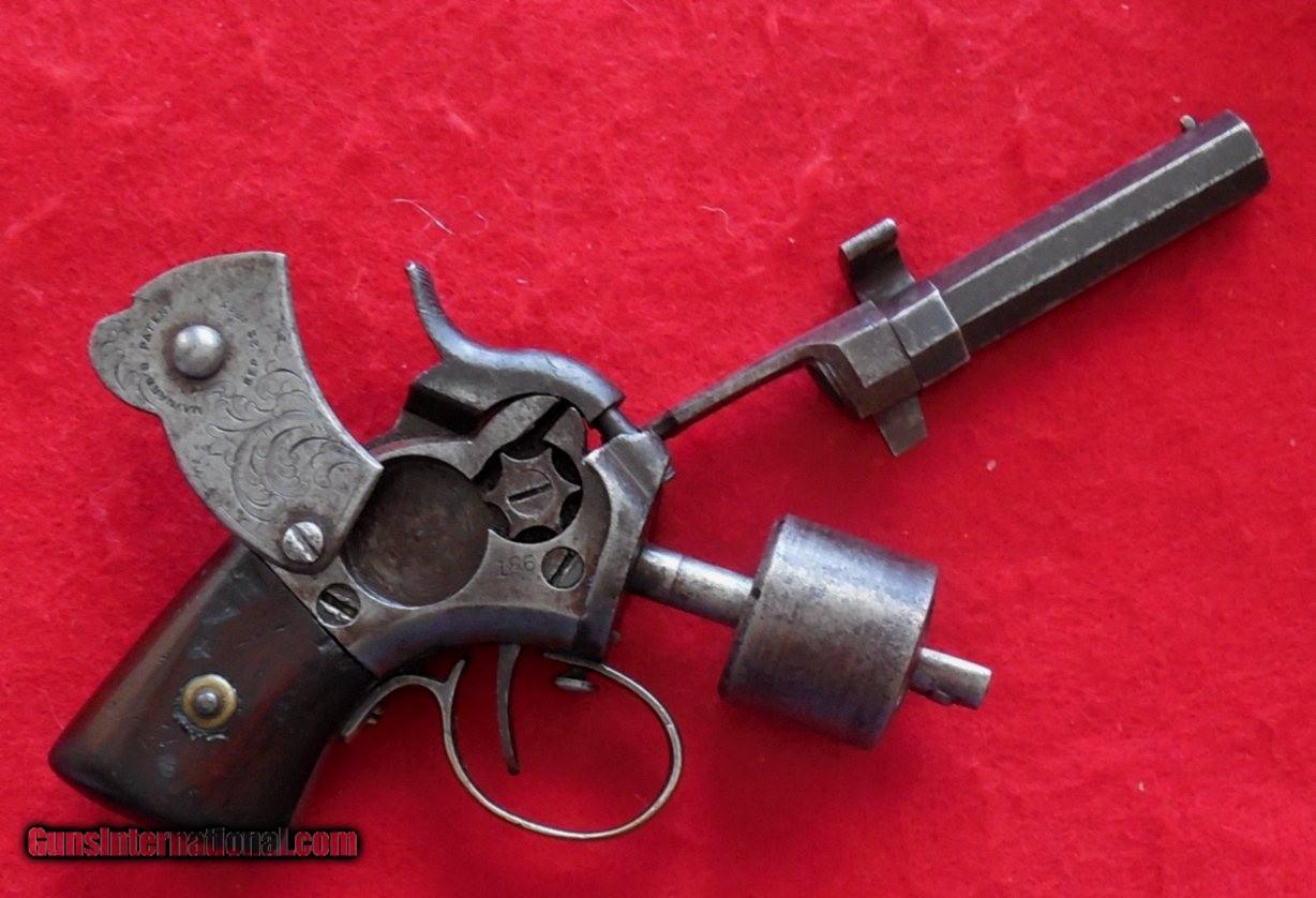 Description: SOLD Pending Funds / Massachusetts Arms Company Maynard-Primed Manually-Rotated Pocket Revolver, serial #186, cal. 28, has a 2 5/8" octagon barrel with a lightly pitted bore and strong rifling. This is a scarce and interesting little pocket revolver utilizing the Maynard tape priming system, manual indexing of the cylinder and was built in limited numbers, many converted to automatic rotating cylinder. The frame has light floral engraving on the primer cover and left side, the metal surfaces having been cleaned to pewter with remnants of some old peppery pitting and oxidation staining. The cylinder is toned to brown showing scattered peppery pitting with subdued floral etching still visible. The barrel is mostly brown with a few stray patches of original blue in the protected areas in addition to signs of light cleaning, and handling marks. The brass triggerguard has about 97% original silver plate that has tarnished and shows edge wear. The smooth walnut factory grips rate about good with moderate soiling and handling marks on the back of the right panel. The barrel is numbered "396", and the remaining numbered parts are “186”, no numbers are visible on the cylinder. The topstrap is marked "MASS ARMS CO. / CHICOPEE FALLS" and "MAYNARDS PATENT SEP. 22, 1845" around the tape cover stud. The barrel lock is a little loose and the action is functional. Besides being scarce, it is an interesting development in firearms technology. The overall condition on this scarce revolver as described and photographed is good plus - very good condition. Inv. : # 12-160 SOLD Antique: Yes |