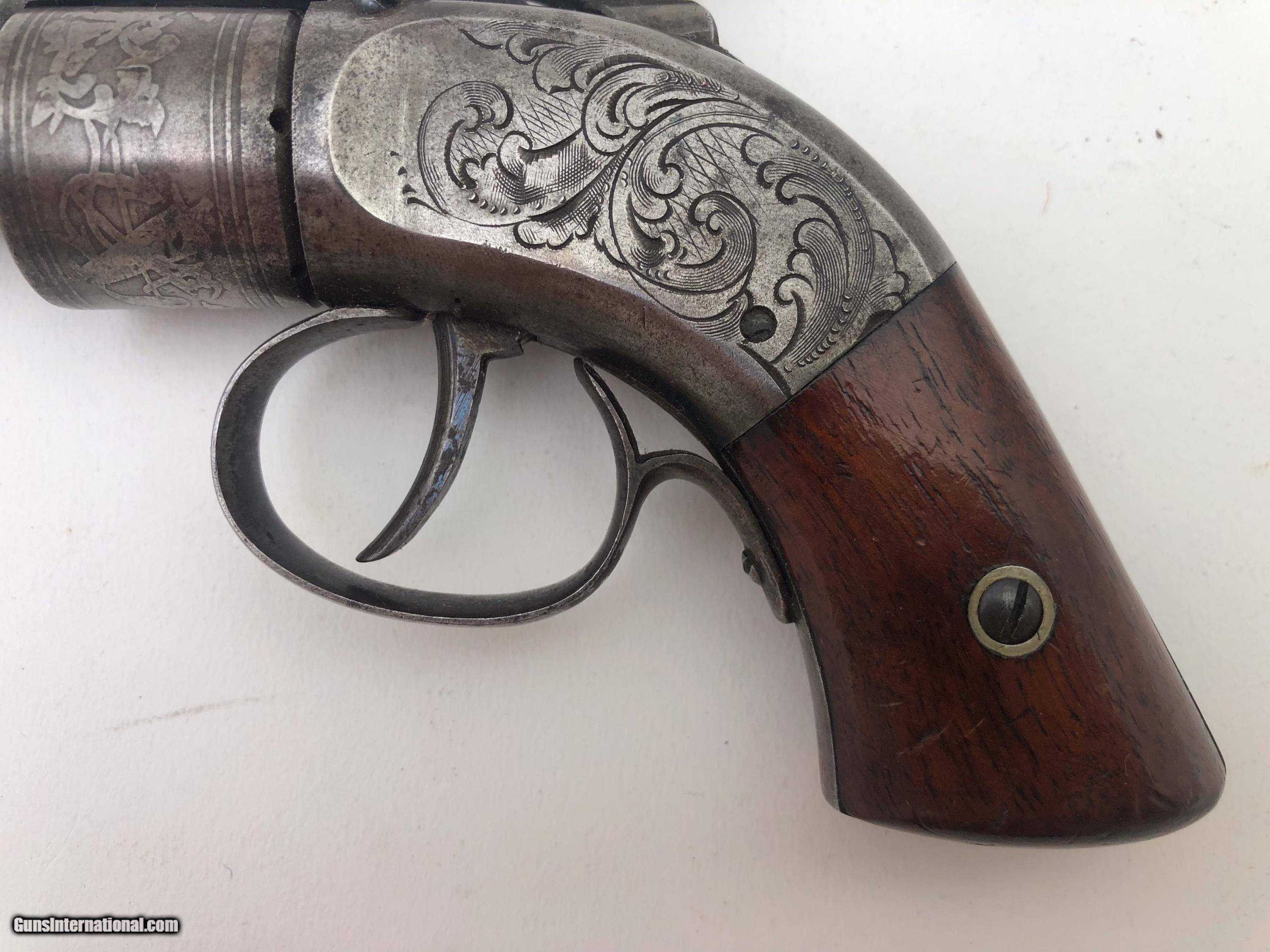 Description: A Mass Arms 28 caliber 6 shot Maynard primed pocket revolver with 3.5" barrel. From the Frank Sellers collection. Gun retains much original bright blue finish. The walnut grips are excellent with only very minor marks. The action works perfectly and the mainspring is very strong. SOLD Antique: Yes Manufacturer: Mass. Arms Model: Pocket Revolver Serial Number: 309 Barrel Length: 3.5 |