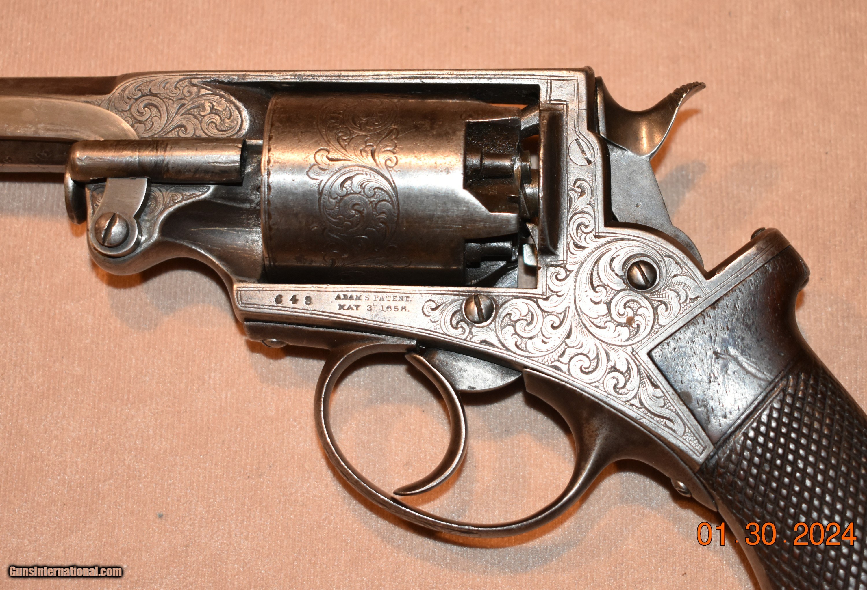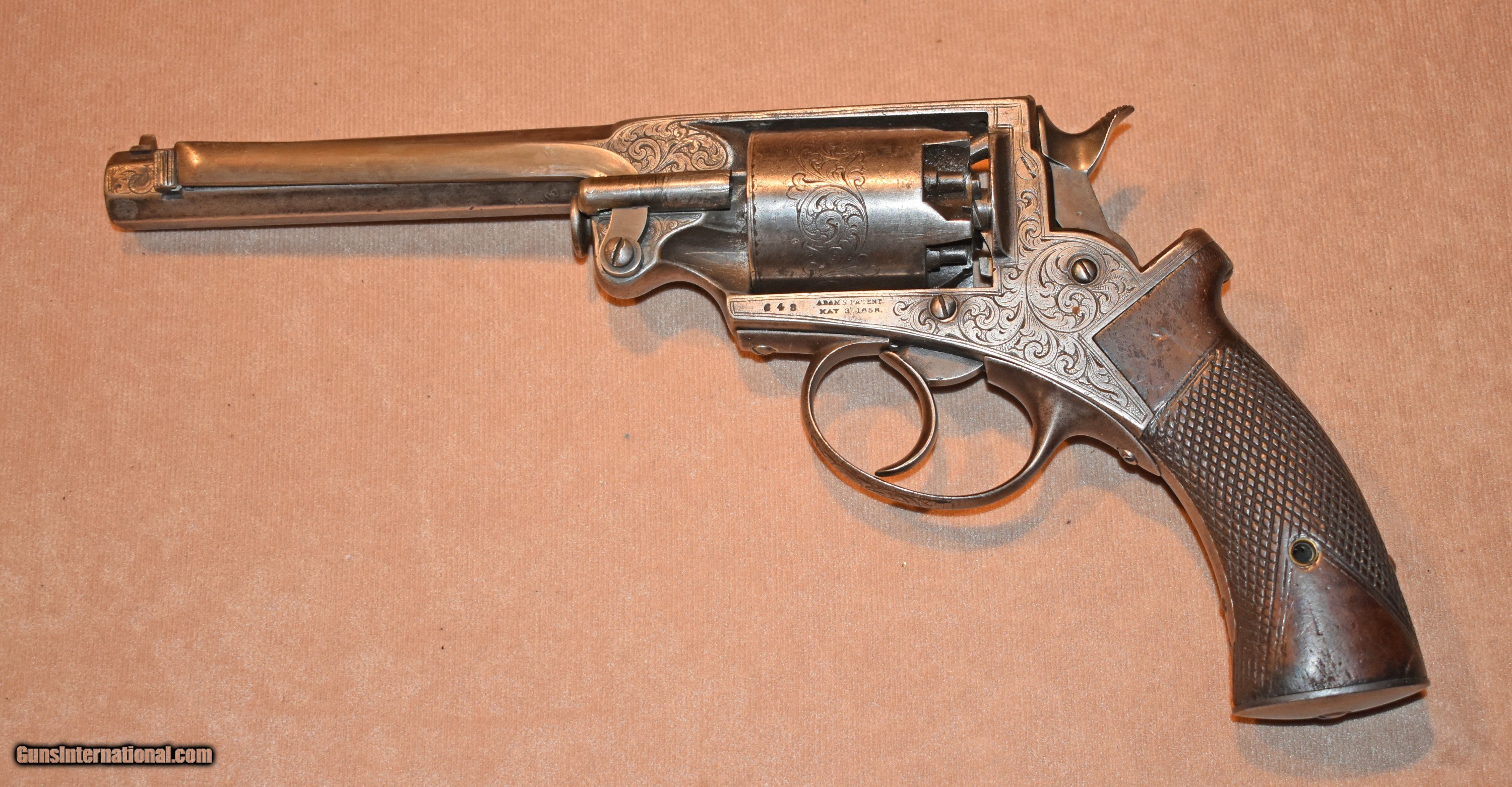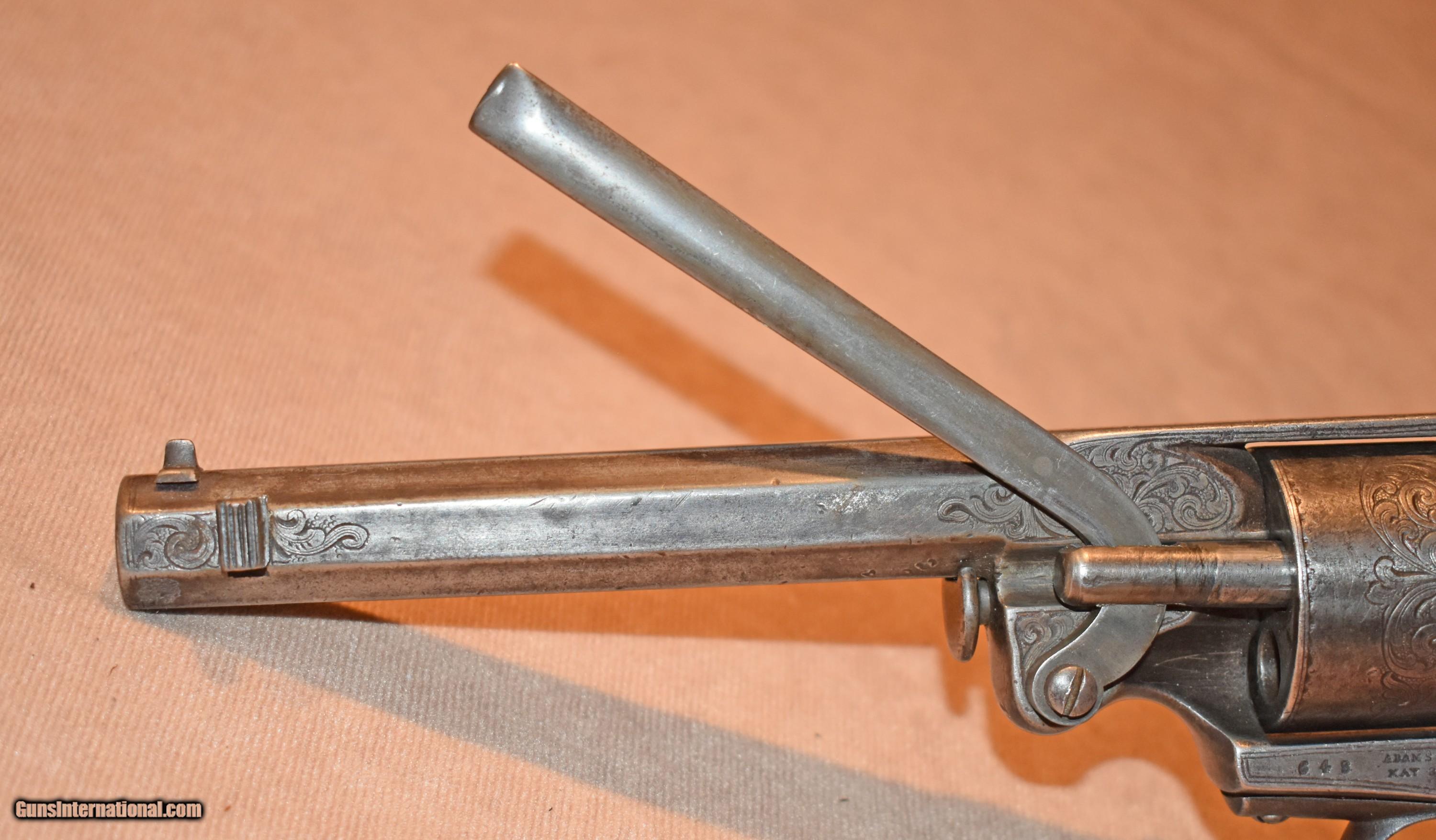 Description: Massachusetts Arms Company, Chicopee Falls, MA, Factory Cased and Engraved, Adams Patent, 5 Shot Navy Revolver, 6" octagon Barrel, SN 648, c. late 1850's early 1860's Total production estimated at 1,000 of which approximately 600 were purchased by the US Military for the Civil War SOLD Antique: Yes Handgun Caliber: .36 |