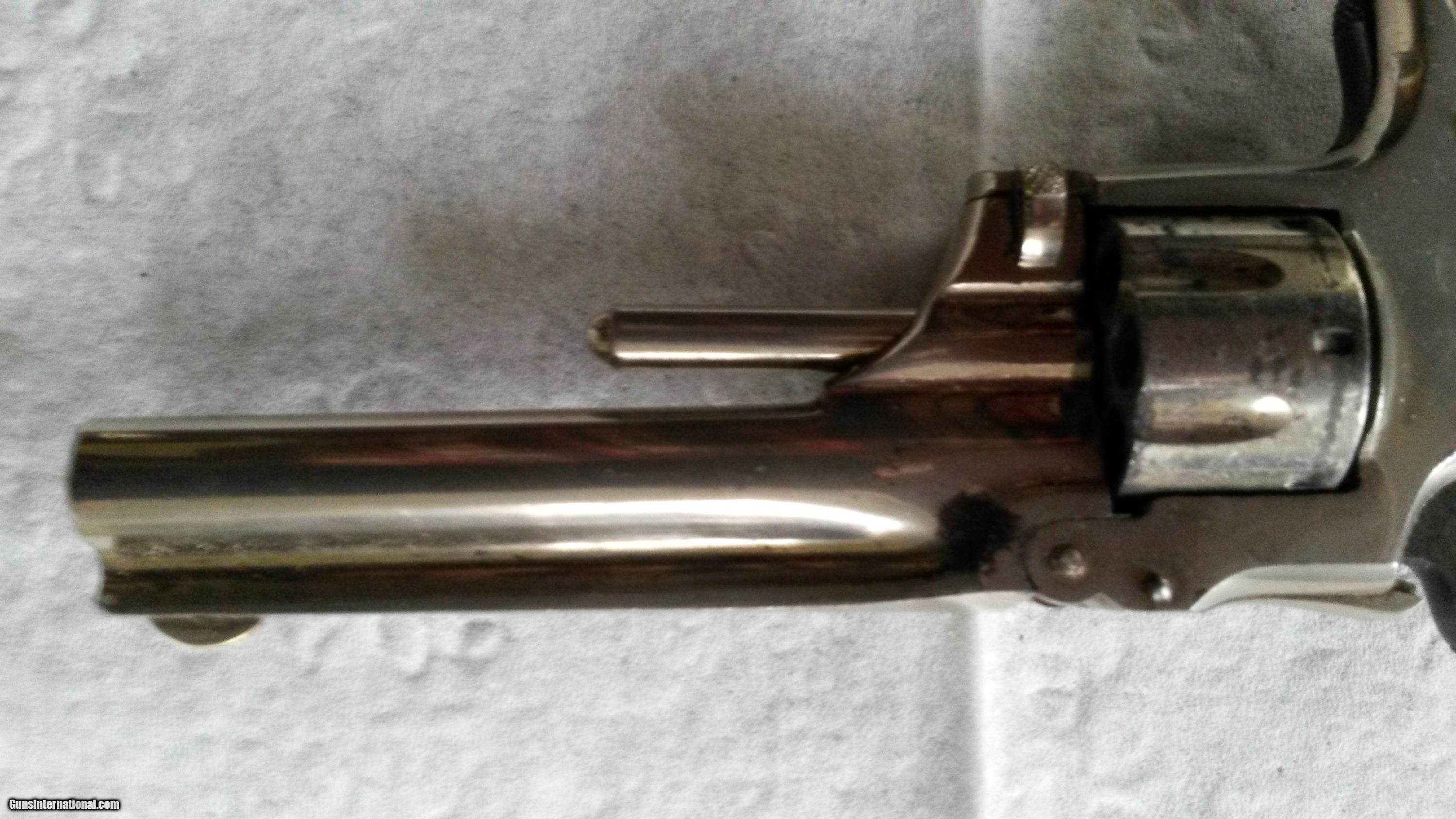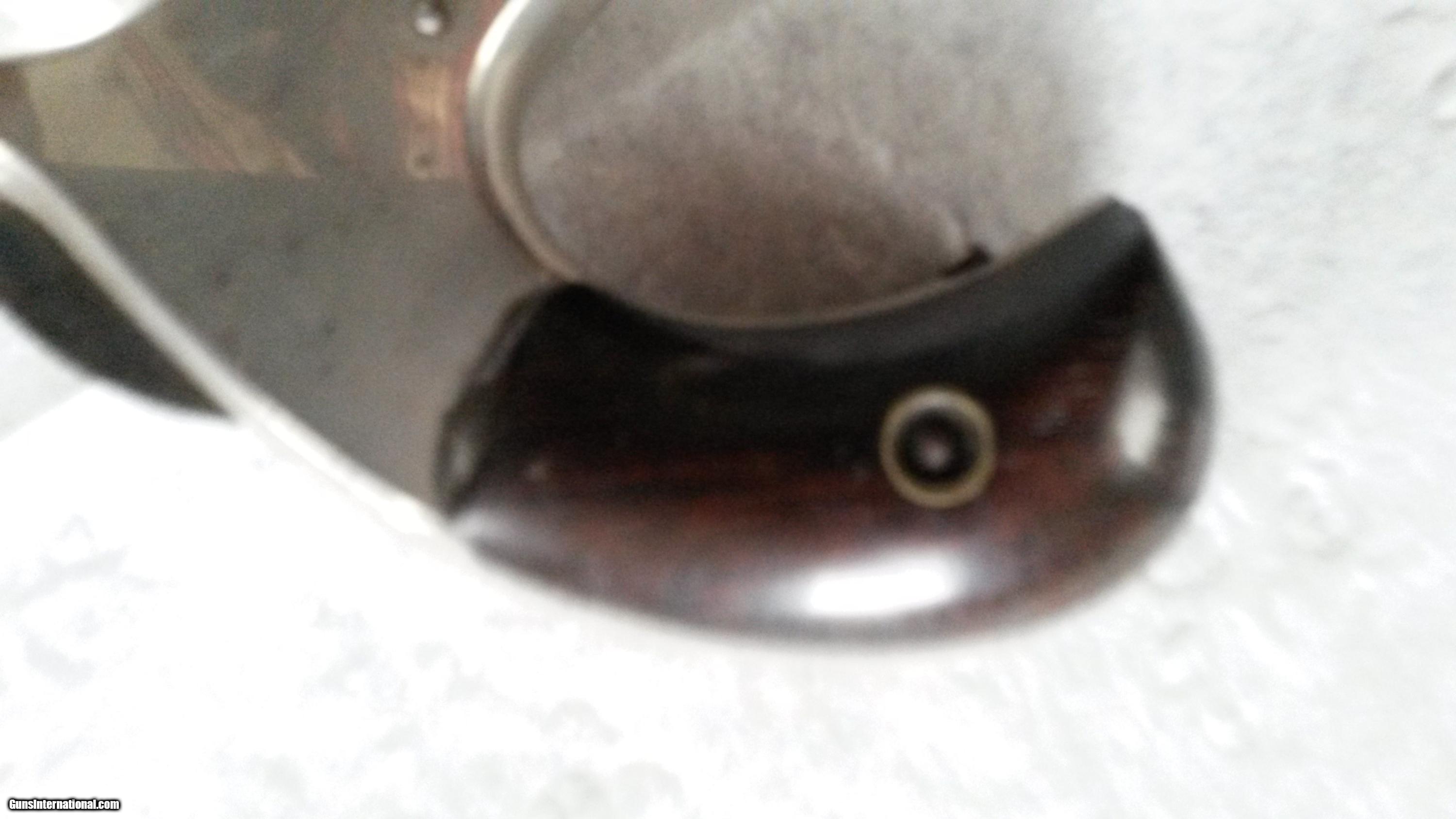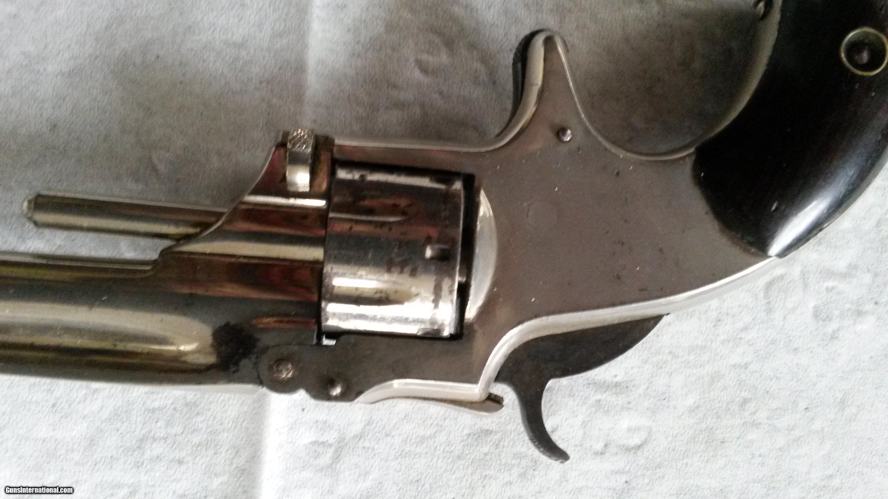 Description: This is a Merwin Hulbert & Co., NY .22 caliber tip up revolver. Model #1, 3rd issue. Identical to the Smith & Wesson. S & W sued MH & Co for patent infringement and won the case. As a result all Merwin stamped .22 caliber tip ups in production or storage had to have manufacturers name over stamped with a series of XXXX's. This revolver is in very good condition. Action works fine as it should. Approximately 95% original nickel finish. Approximately 60% original varnish on Rosewood grips. Barrel and cylinder have matching "L7" stamped. Unsure where to locate numbers on the frame. Very nice, rare collectors piece $850.00 firm plus shipping. No trades SOLD Antique: Yes |