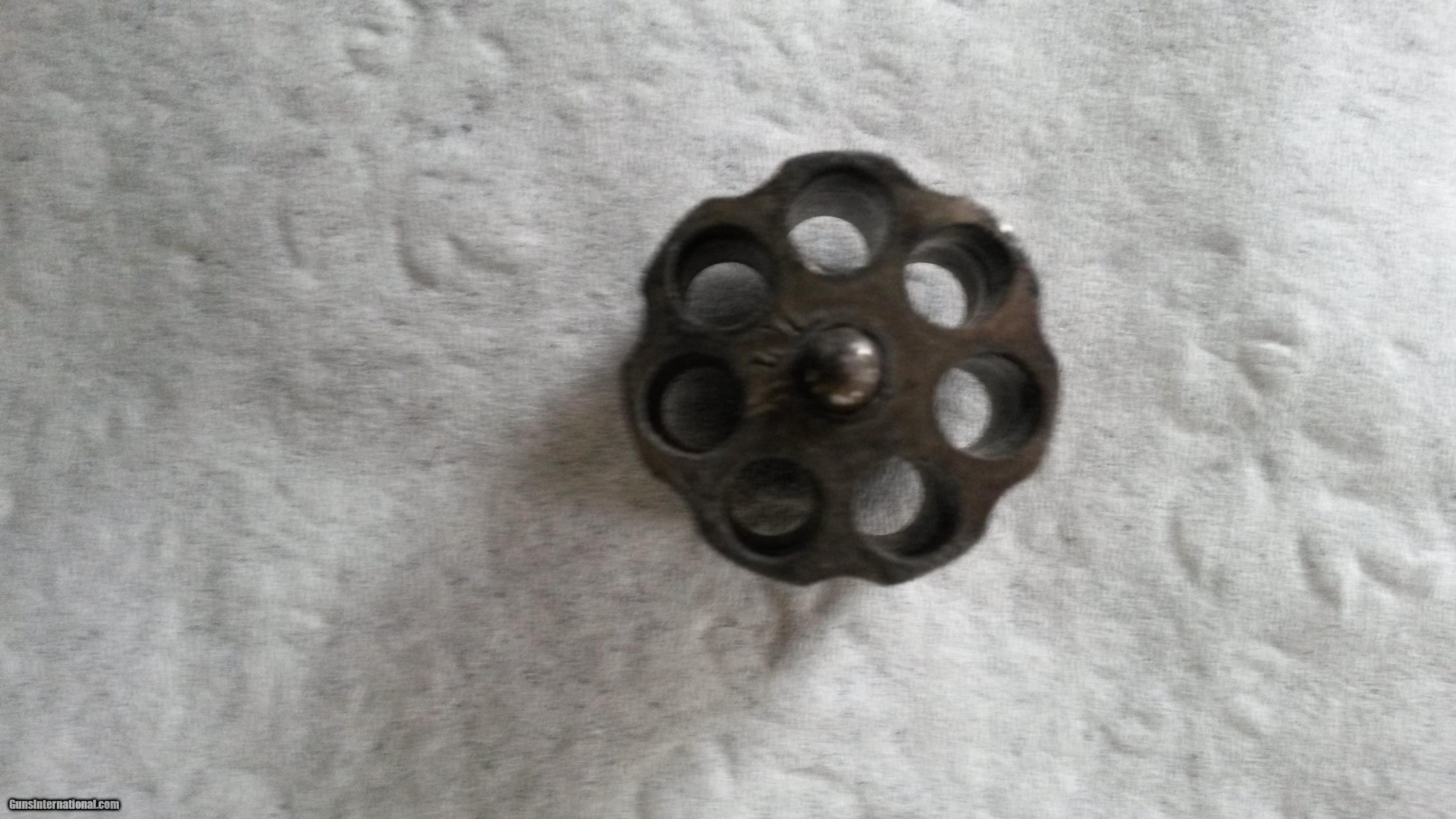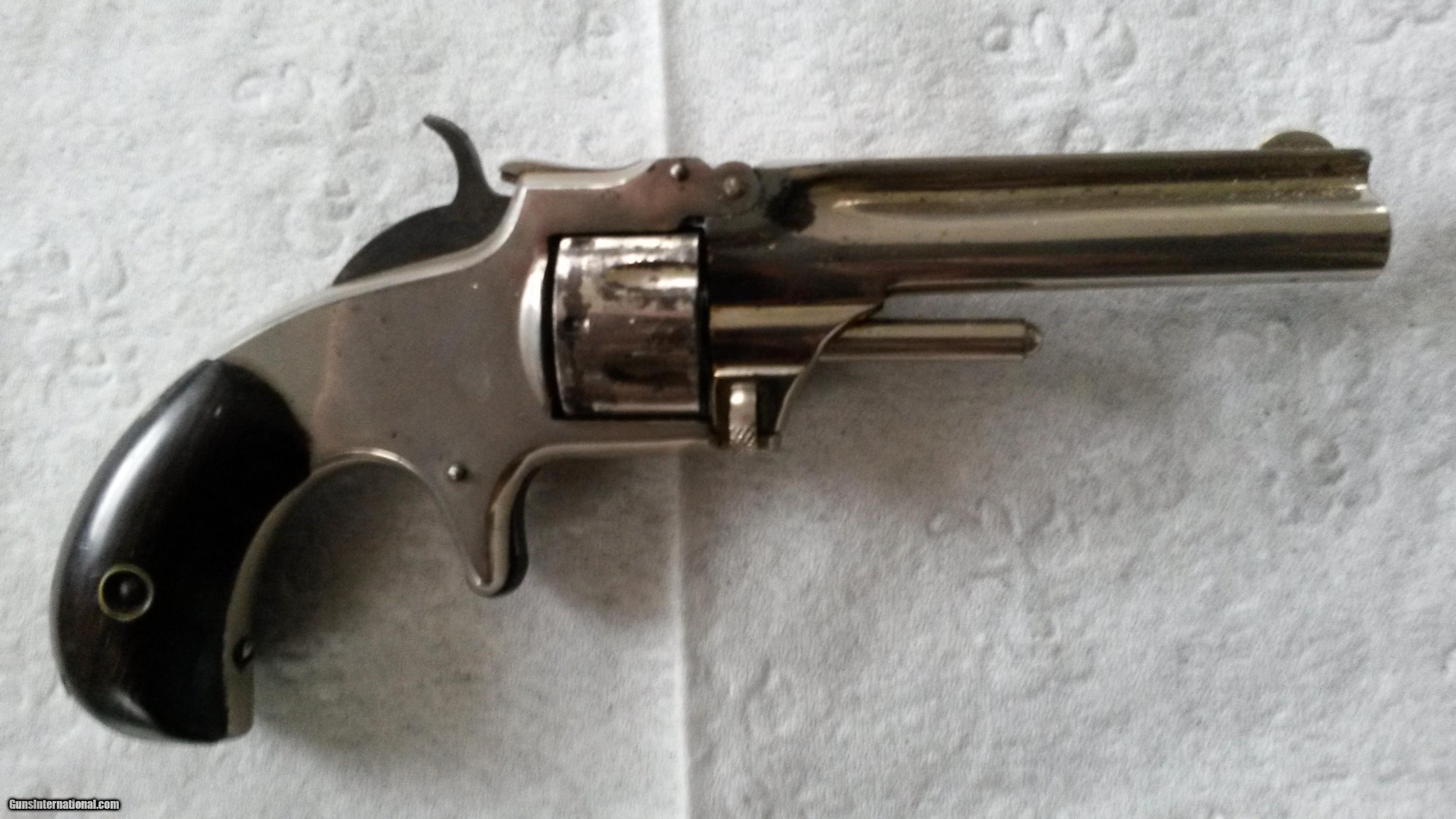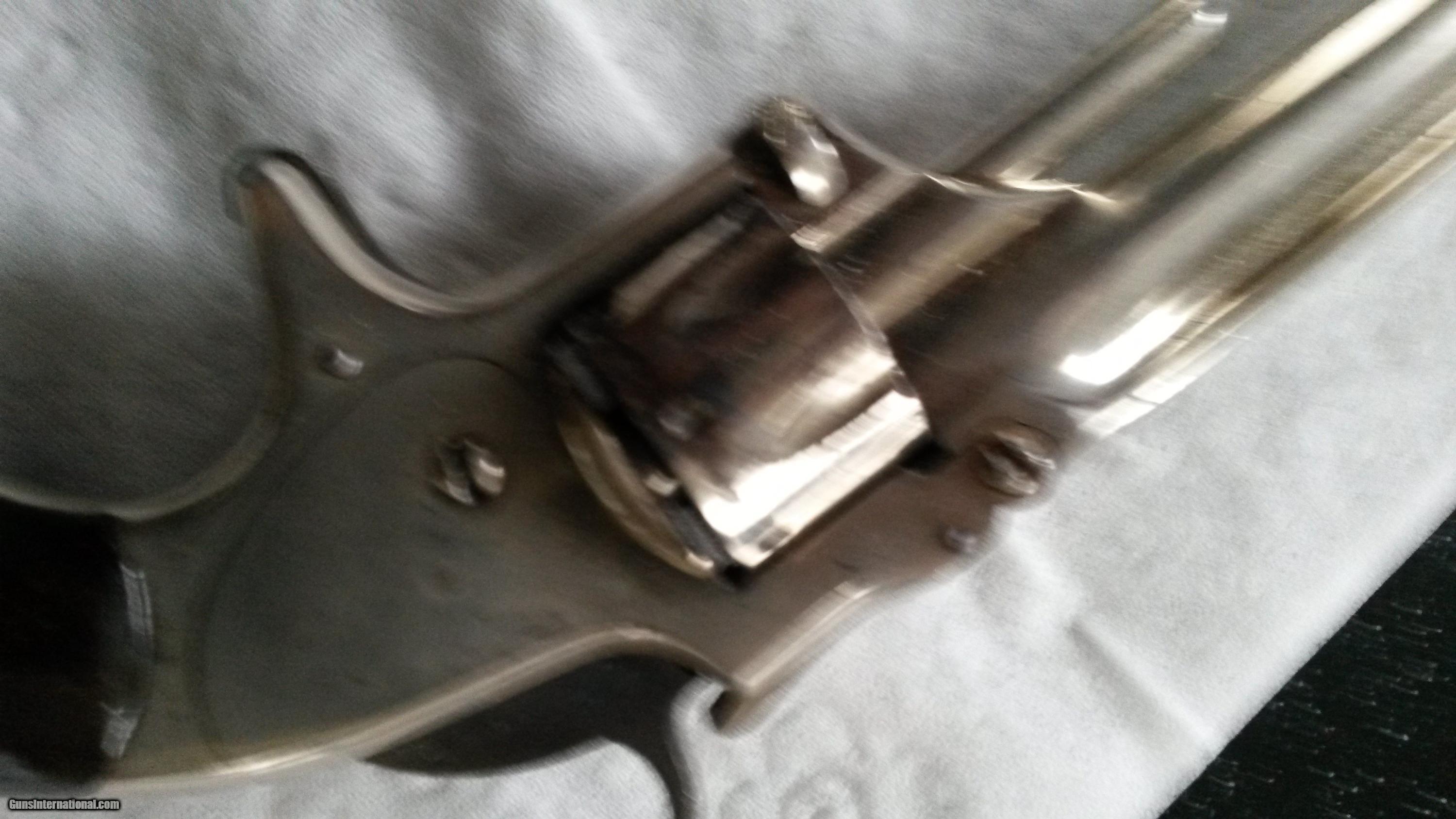 Description: This is a Merwin Hulbert & Co., NY .22 caliber tip up revolver. Model #1, 3rd issue. Identical to the Smith & Wesson. S & W sued MH & Co for patent infringement and won the case. As a result all Merwin stamped .22 caliber tip ups in production or storage had to have manufacturers name over stamped with a series of XXXX's. This revolver is in very good condition. Action works fine as it should. Approximately 95% original nickel finish. Approximately 60% original varnish on Rosewood grips. Barrel and cylinder have matching "L7" stamped. Unsure where to locate numbers on the frame. Very nice, rare collectors piece $850.00 firm plus shipping. No trades SOLD Antique: Yes |