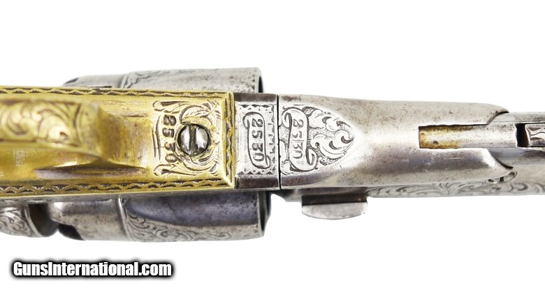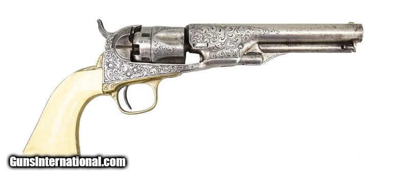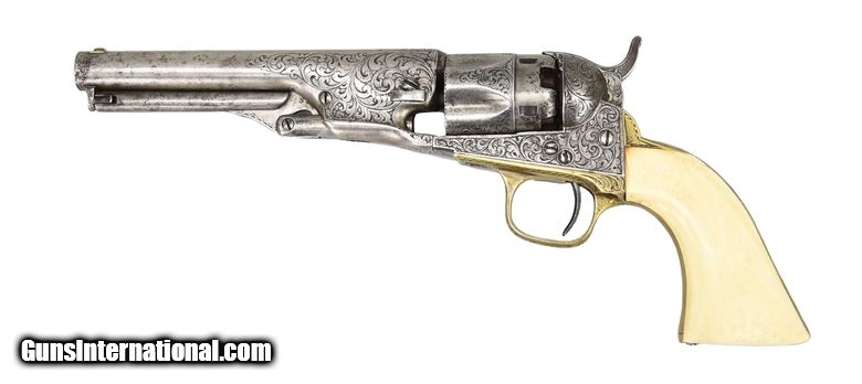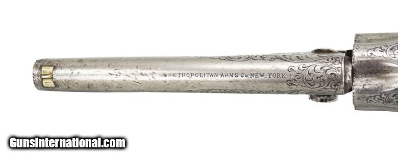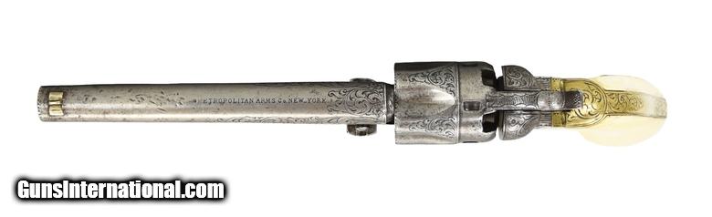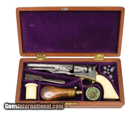 Metropolitan Police Factory Engraved .36 caliber revolver. Gun cased with flask, mold, Colt cap can, and extra container of percussion caps. Gun is very sharp with excellent original factory engraving. The case is beautifully made and, in our opinion, may be a modern case made by Klay who is very adept in making high quality percussion revolver cases. Very handsome cased set!