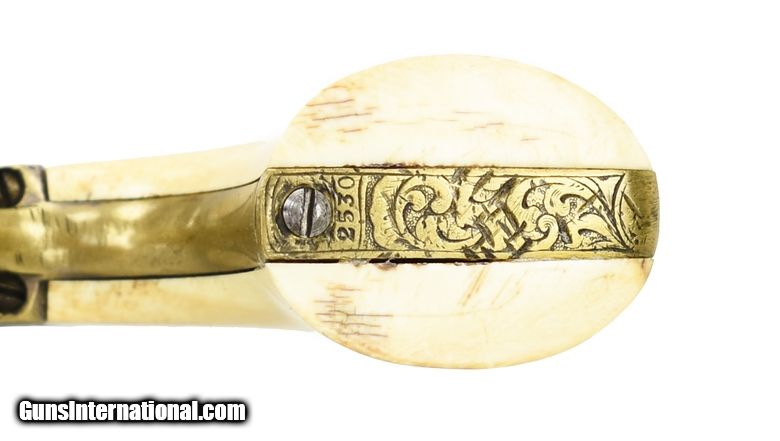 Description: Metropolitan Police Factory Engraved .36 caliber revolver. Gun cased with flask, mold, Colt cap can, and extra container of percussion caps. Gun is very sharp with excellent original factory engraving. The case is beautifully made and, in our opinion, may be a modern case made by Klay who is very adept in making high quality percussion revolver cases. Very handsome cased set! SOLD |