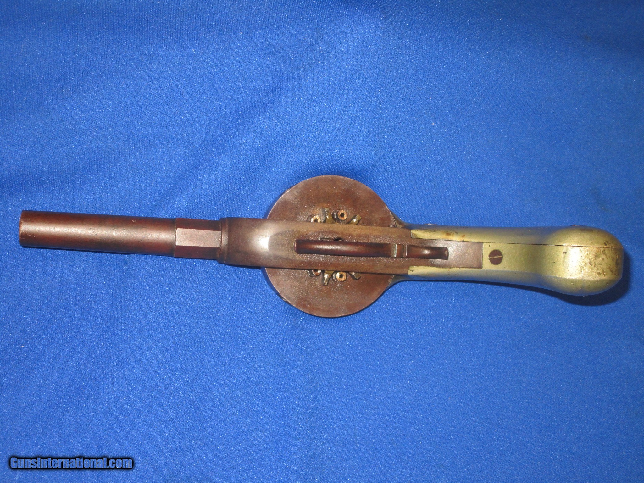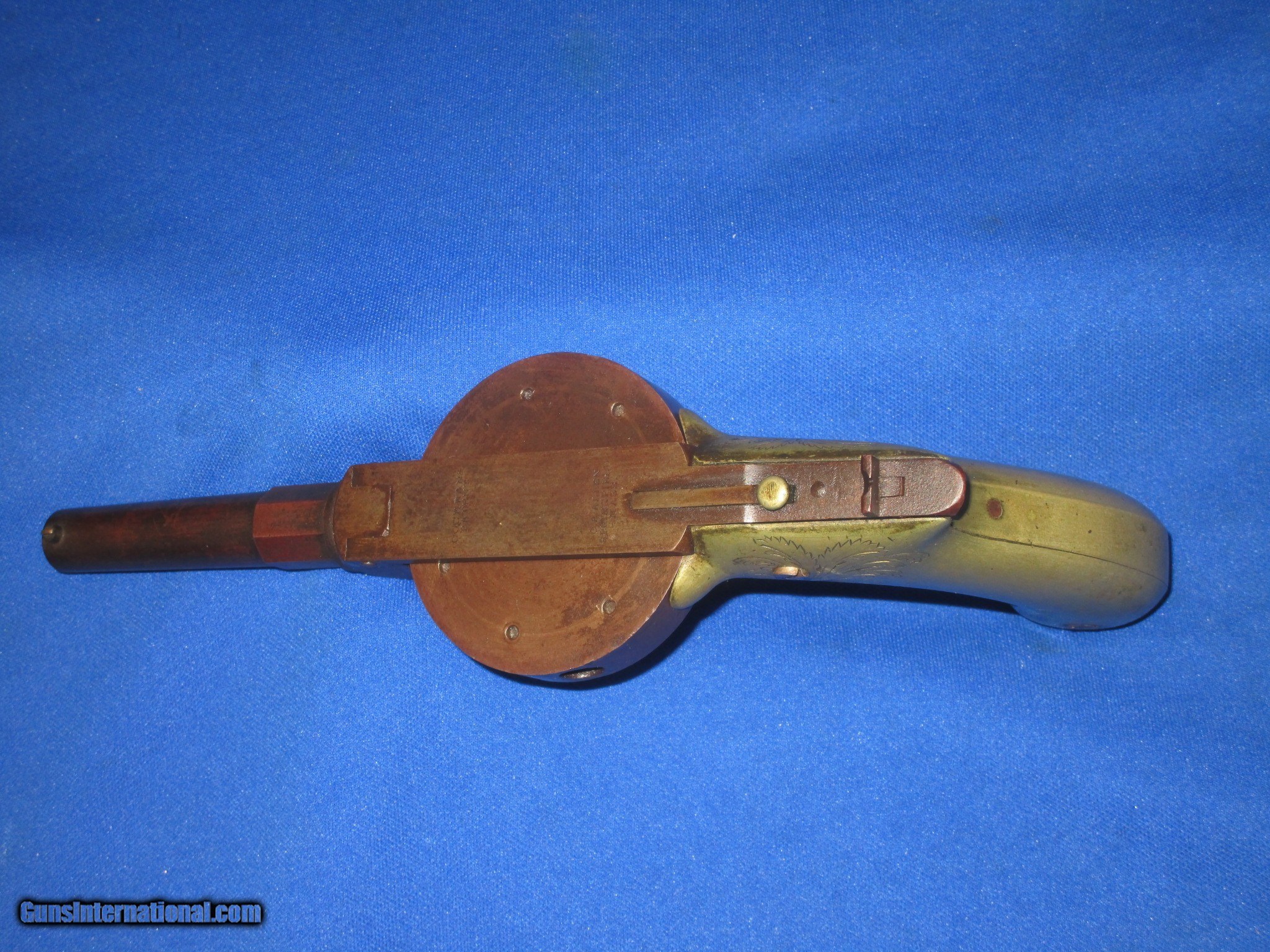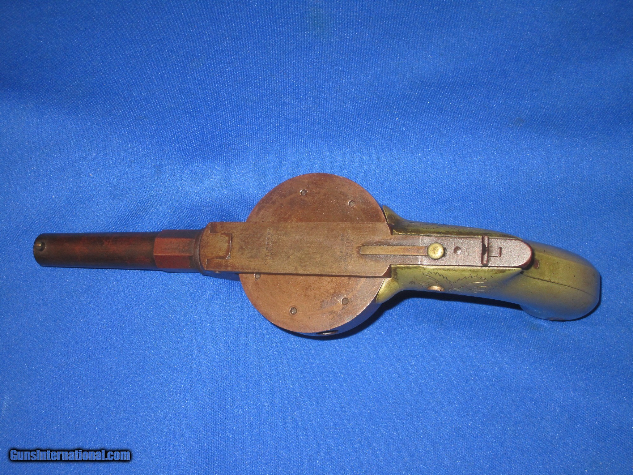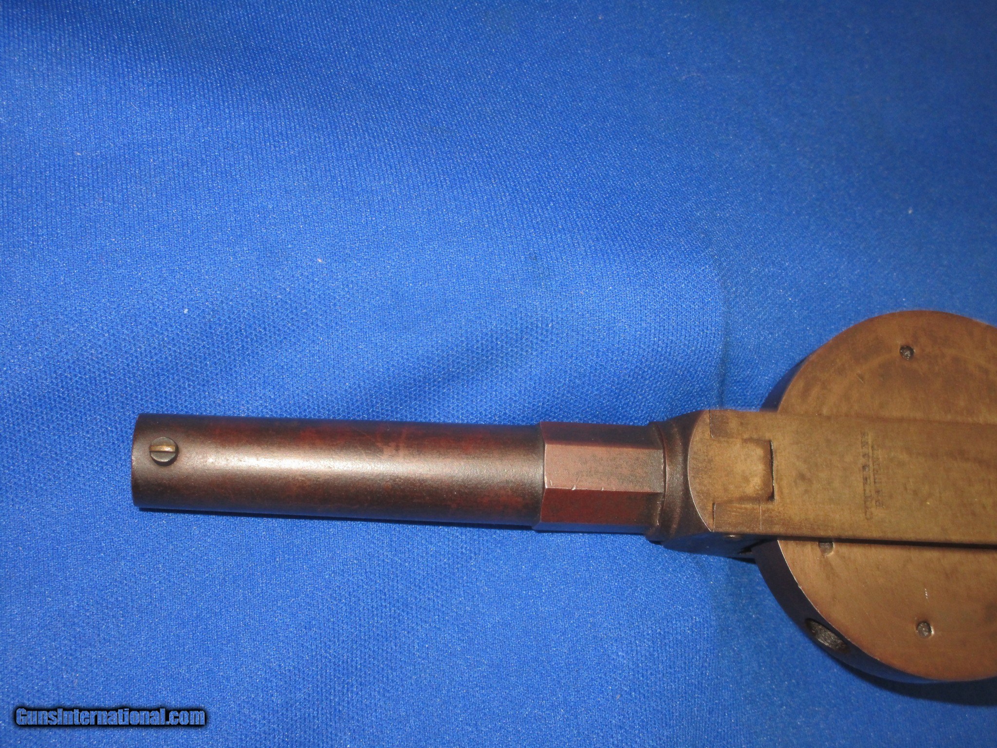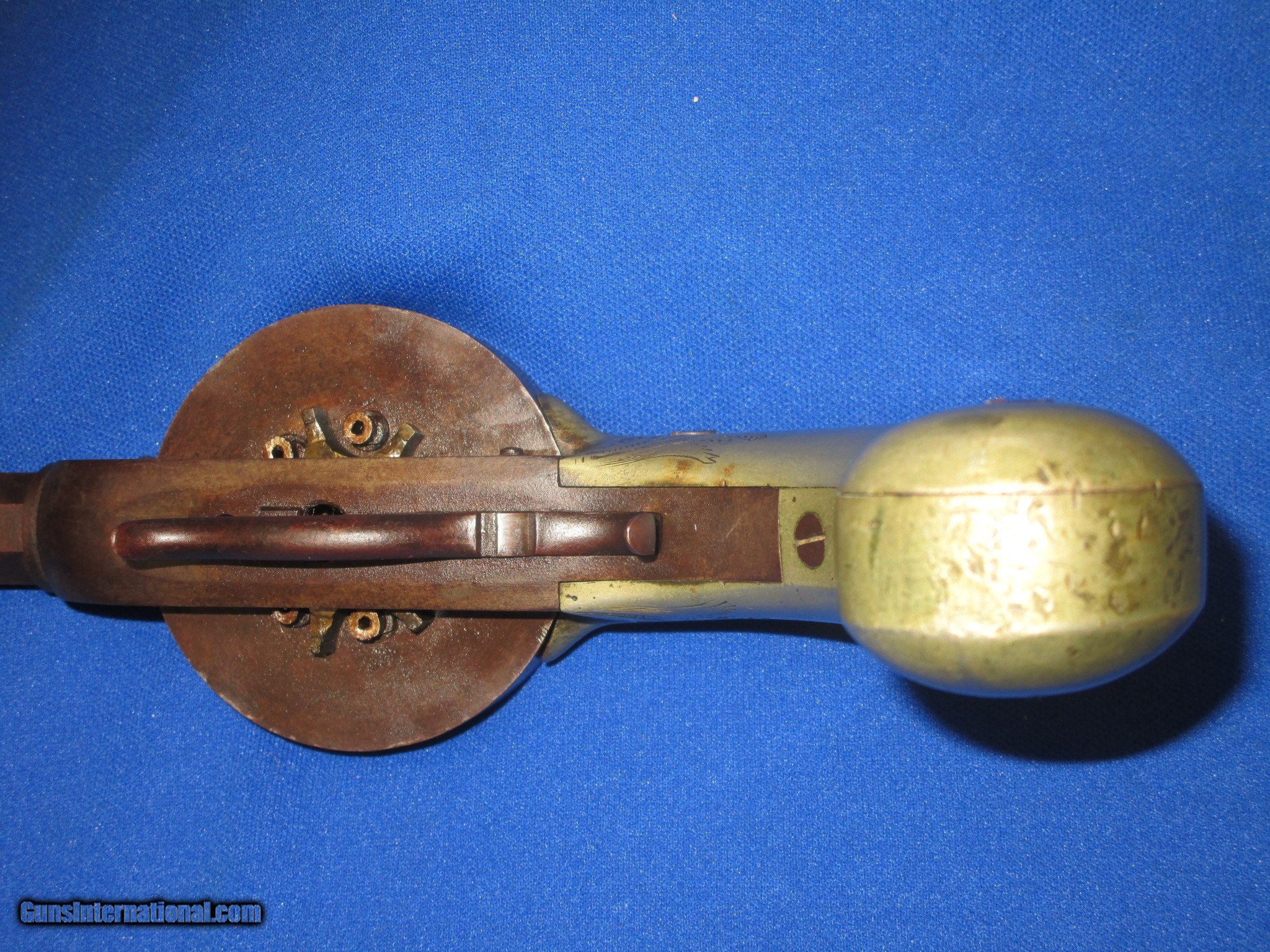 Description: A Very Early And rare First Type Cochran Percussion Turret Revolver With Engraved German Silver Grips In Fine And Untouched Condition. Serial #9, all matching numbers. All original & complete. It is in .36 caliber, and has a 7 shot turret. Less than 150 were made in the 1830's by "C.B. Allen, Springfield, Mass". The Revolver has fine untouched metal with very crisp markings and edges. It is clearly marked on the top of the frame: "COCHRAN'S PATENT & C.B. ALLEN/SPRINGFIELD/MASS". The barrel, frame, and turret all have a beautiful mix of original brown finish turning to a natural chocolate brown patina in areas. The fine german silver grips are factory engraved on both sides with a wonderful untouched look to them. All screws are original. The revolver has a good bore and action. These early and unusual revolvers are recognized by collectors as one of the distinct oddities in American Arms Development. This Is A Wonderful Example Of A Very Rare & Early 1830's Cochran Percussion Turret Revolver That Is Fresh Out Of An Old New England Estate And Is New to The Market! DISCLAIMER: All firearms are sold as collector’s items only – we did not accept responsibility as to the shooting safety or reliability of any antique firearm. All firearms as described as accurately as possible, given the restraints of a catalog listing length. We want satisfied customers and often under describe the weapons. Any city or state regulations regarding owning antique firearms are the responsibility of the purchaser. All firearms are mechanically perfect unless noted, but again are NOT warranted as safe to fire. SOLD Antique: Yes Handgun Caliber: .36 Manufacturer: Cochran Model: Turret Revolver Serial Number: #9 Condition: FINE & UNTOUCHED Metal Condition: FINE Bore Condition: VERY GOOD |