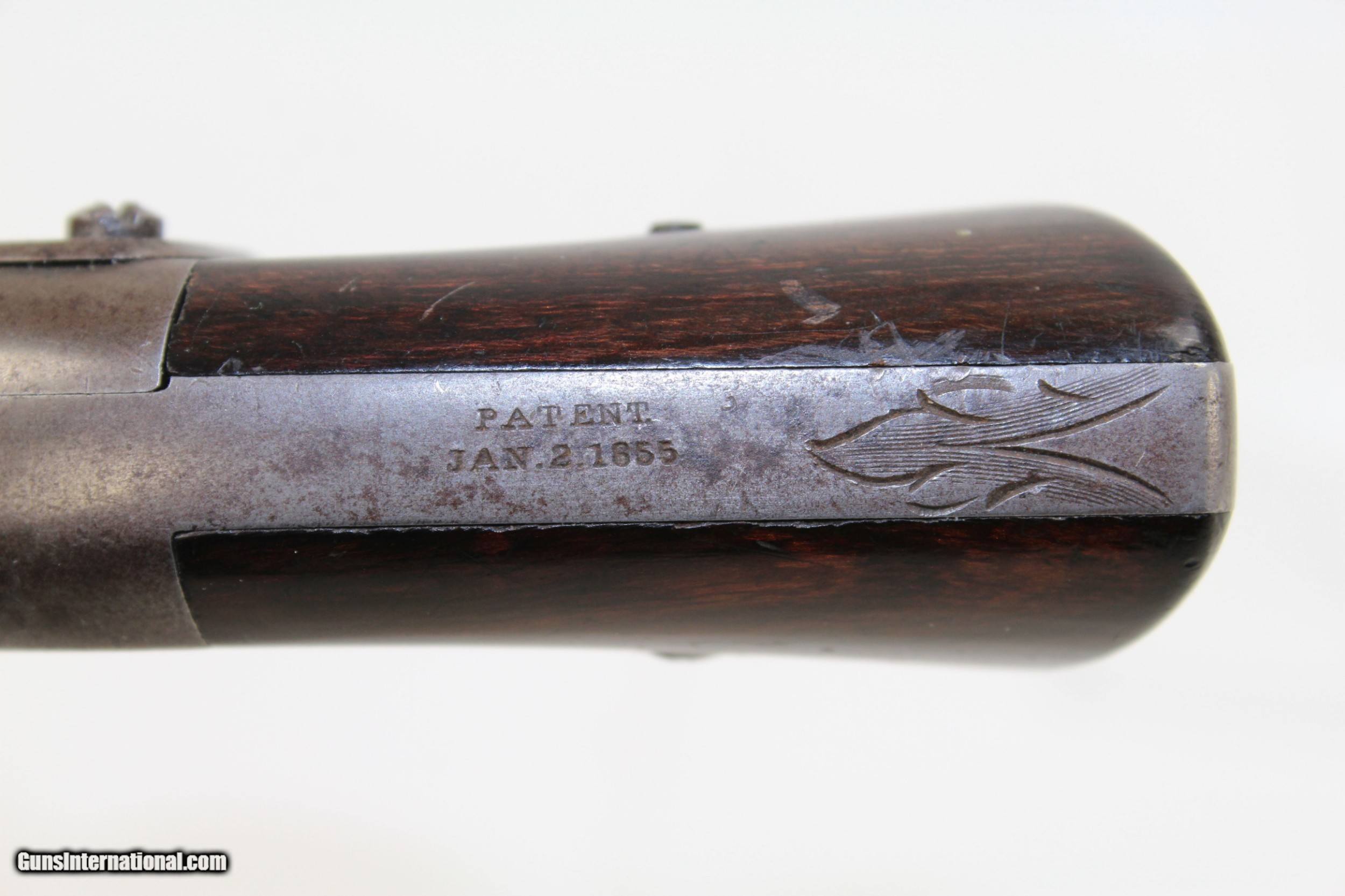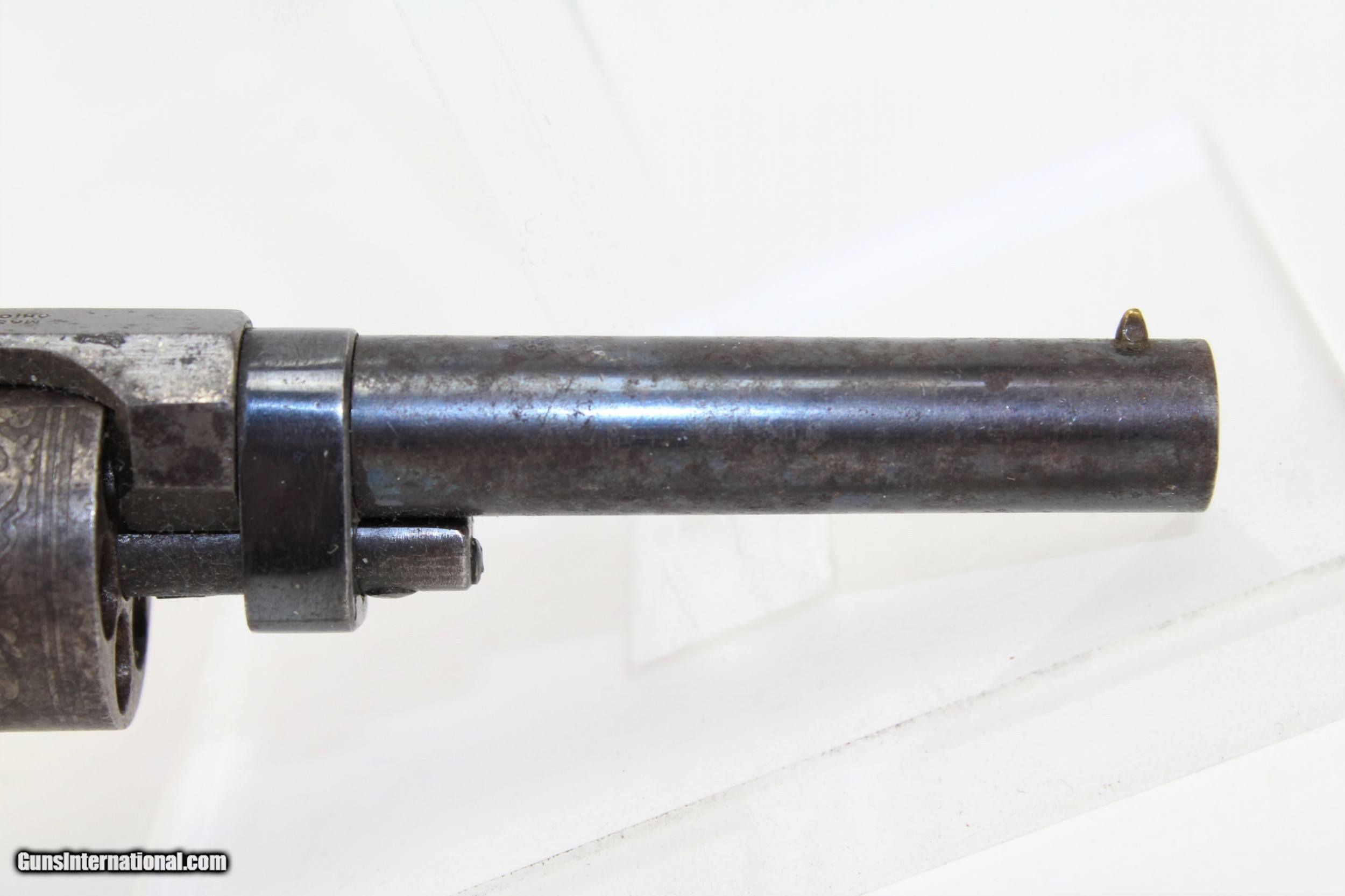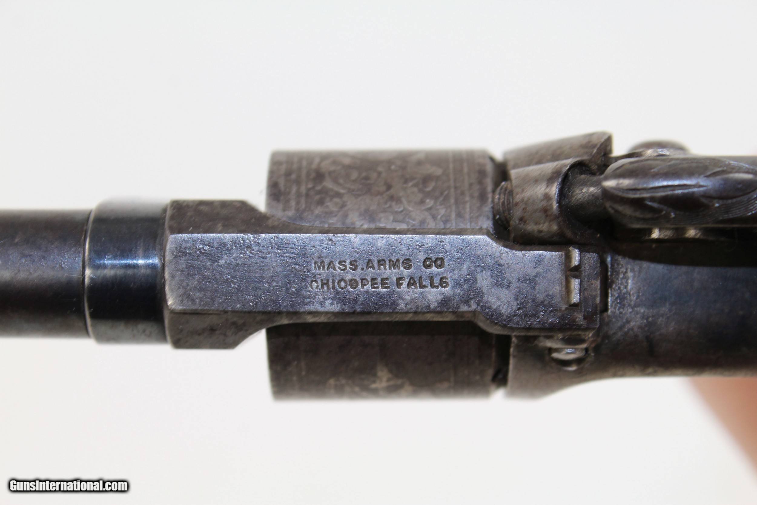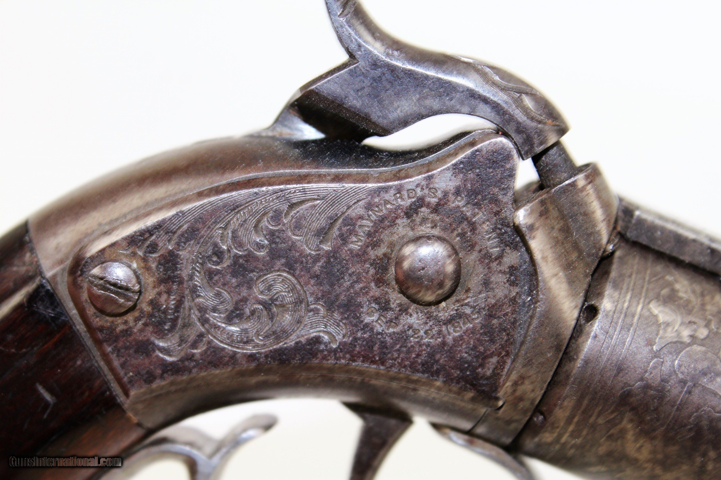 Description: RARE Pre-CIVIL WAR Antique MASSACHUSETTS Revolver 1 of Only 900! COLT PATENT Dispute, UNIQUE Design Here we present an antique Massachusetts Arms Co. Maynard Primed Percussion Pocket Revolver, made circa 1852. In 1847 Colt received a contract for his Colt-Walker Revolver, but lacking any manufacturing capability himself, had to outsource to the Whitney Firearms Co. Once complete, Samuel Colt was able to take over production himself, and while he was at it, he lured several Whitney employees away with him to Hartford. Among those were William Miller and Joshua Stevens. They were secretly working on their own revolver, and when Colt found them out he fired them. They went on to continue their work on the design, first with Edwin Wesson, and then the Massachusetts Arms Co. upon Wesson’s death. The initial design was one in which the hammer also revolved the cylinder. It was immediately attacked by Colt in a patent infringement lawsuit, which Colt won, effectively quashing the success of the revolvers, though they changed the infringing elements and continued to manufacture revolvers. This was why overall production was so low and examples today are both rare and vary mechanically from each other. Massachusetts was forced to unlink the revolution of the cylinder from the cocking of the hammer, which happened to some at the factory. Instead, the company put out a variation on which the cylinder had to be turned by hand. To make up for this inconvenience, they licensed the Maynard tape priming system to add to their revolvers. This allowed there to be one percussion nipple, and with every cock of the hammer a single cap was exposed, and with every pull of the trigger that cap was severed from the rest of the roll and carried down onto the nipple, igniting and firing the gun. The hinged door on the left side of the gun opens to reveal the compartment and a gear that fed the caps. This was a unique system for a revolver that adds a lot interest to this early revolver. Only 900 of this variant and only 2250 made total! This specimen is in very good condition. There is still significant original blue on the barrel latch and barrel with an even gray patina throughout. The back-strap and the cylinder are both florally engraved. All markings are clear and legible. The grips and bore are in very good condition. The trigger/hammer part of the action is functional with the cylinder not currently revolving completely. Own the original! This is a legitimate antique and not a reproduction. Barrel is 2-1/2 inches in length. Caliber: .28 percussion Overall condition as seen in photos. Very Fast. Very Safe. FREE SHIPPING WORLDWIDE. Delivered directly to your door by express mail! Guaranteed AUTHENTIC & Includes CERTIFICATE OF AUTHENTICITY. ancestryguns $1850 #21820 SOLD Antique: Yes |