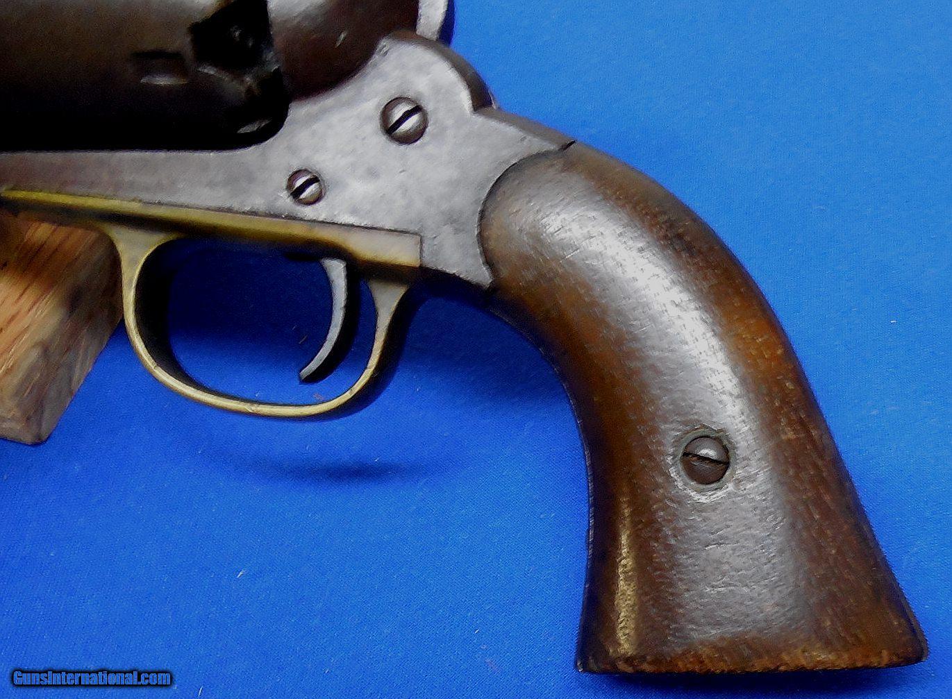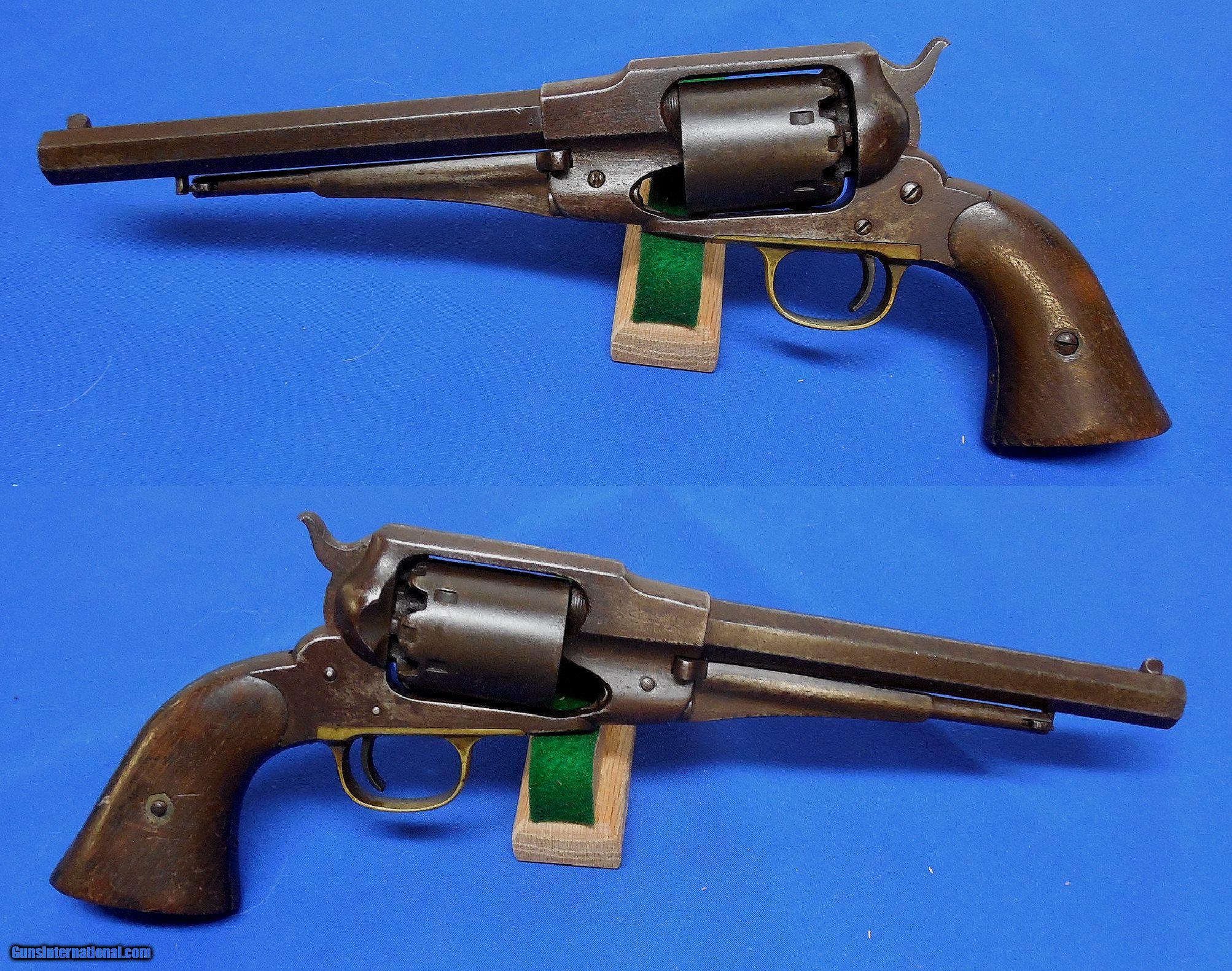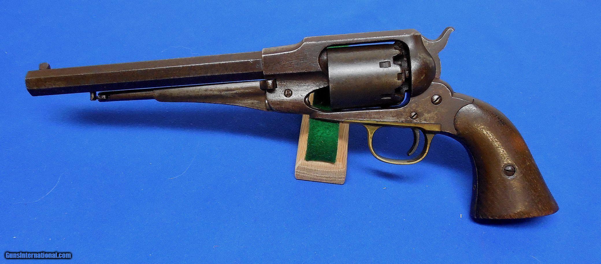 Description: ON HOLD / Remington Model 1858 Army Revolver. serial # 48247, cal. 44, has a 8" barrel showing light pitting throughout with good rifling. The metal has a nice smooth brown patina, the barrel is marked part of which is a light but readable. The back strap is drilled possibly for mounting some sort of shoulder stock. Note, the revolver functions but needs a hand spring. The left grip has a faint cartouche, overall the grips are fine. Overall as photographed and described condition is good - good plus. Inv.: # 12-147 SOLD Antique: Yes |