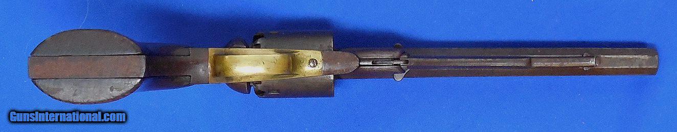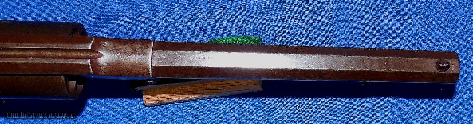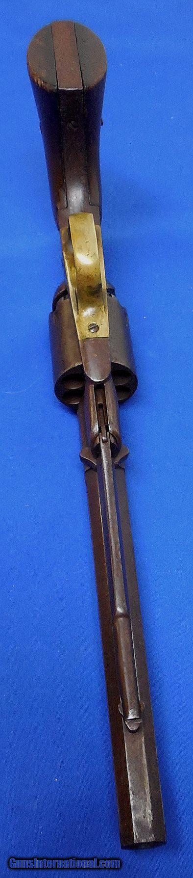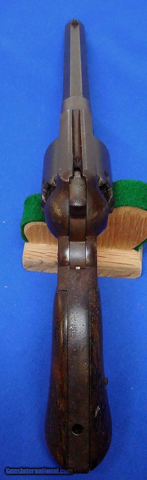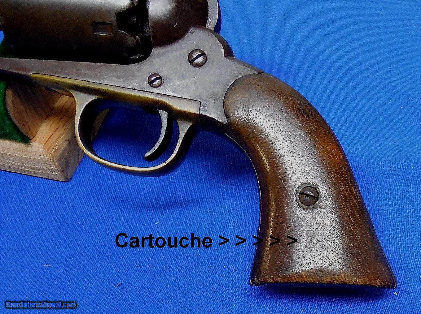 Description: ON HOLD / Remington Model 1858 Army Revolver. serial # 48247, cal. 44, has a 8" barrel showing light pitting throughout with good rifling. The metal has a nice smooth brown patina, the barrel is marked part of which is a light but readable. The back strap is drilled possibly for mounting some sort of shoulder stock. Note, the revolver functions but needs a hand spring. The left grip has a faint cartouche, overall the grips are fine. Overall as photographed and described condition is good - good plus. Inv.: # 12-147 SOLD Antique: Yes |
