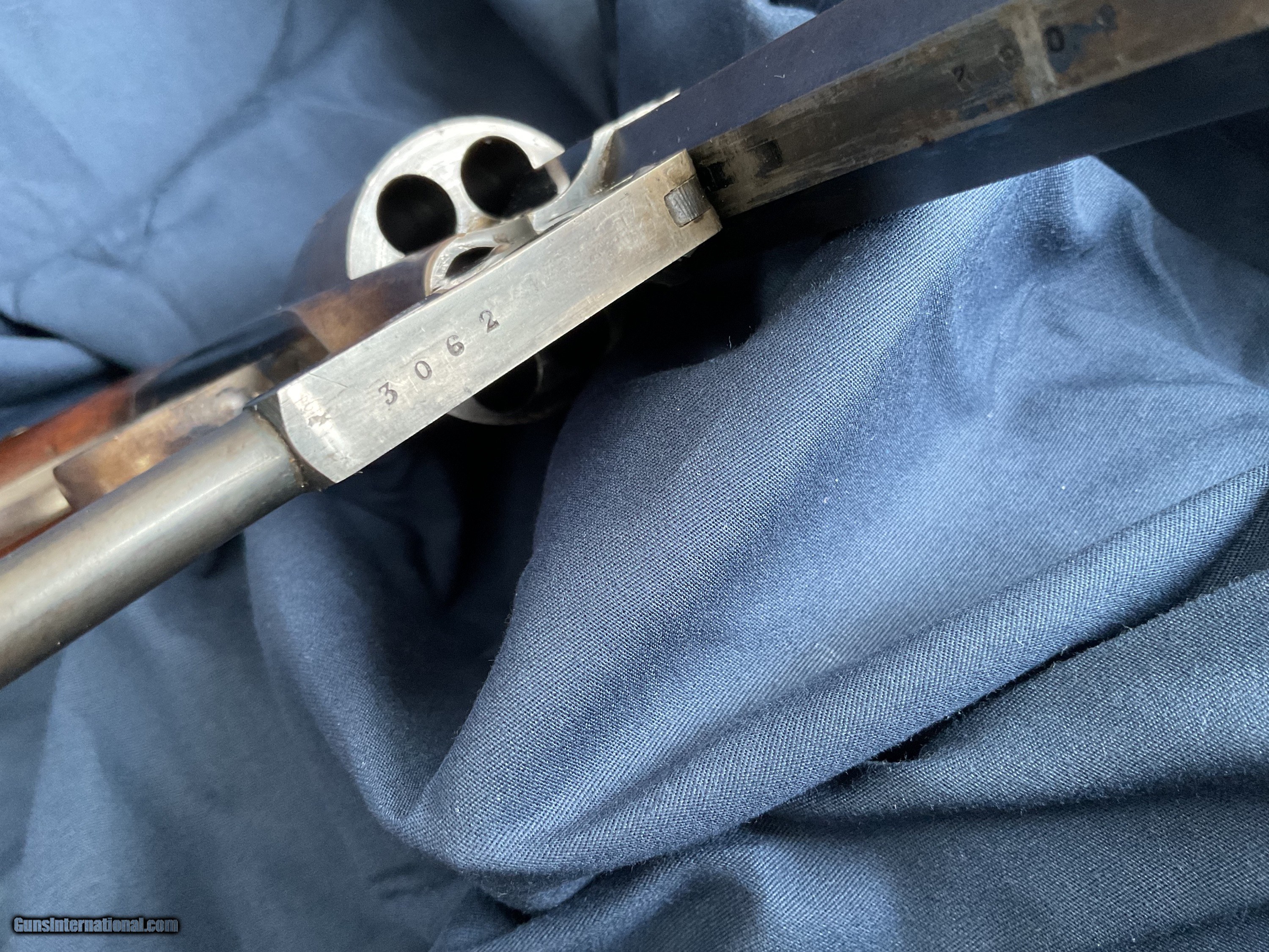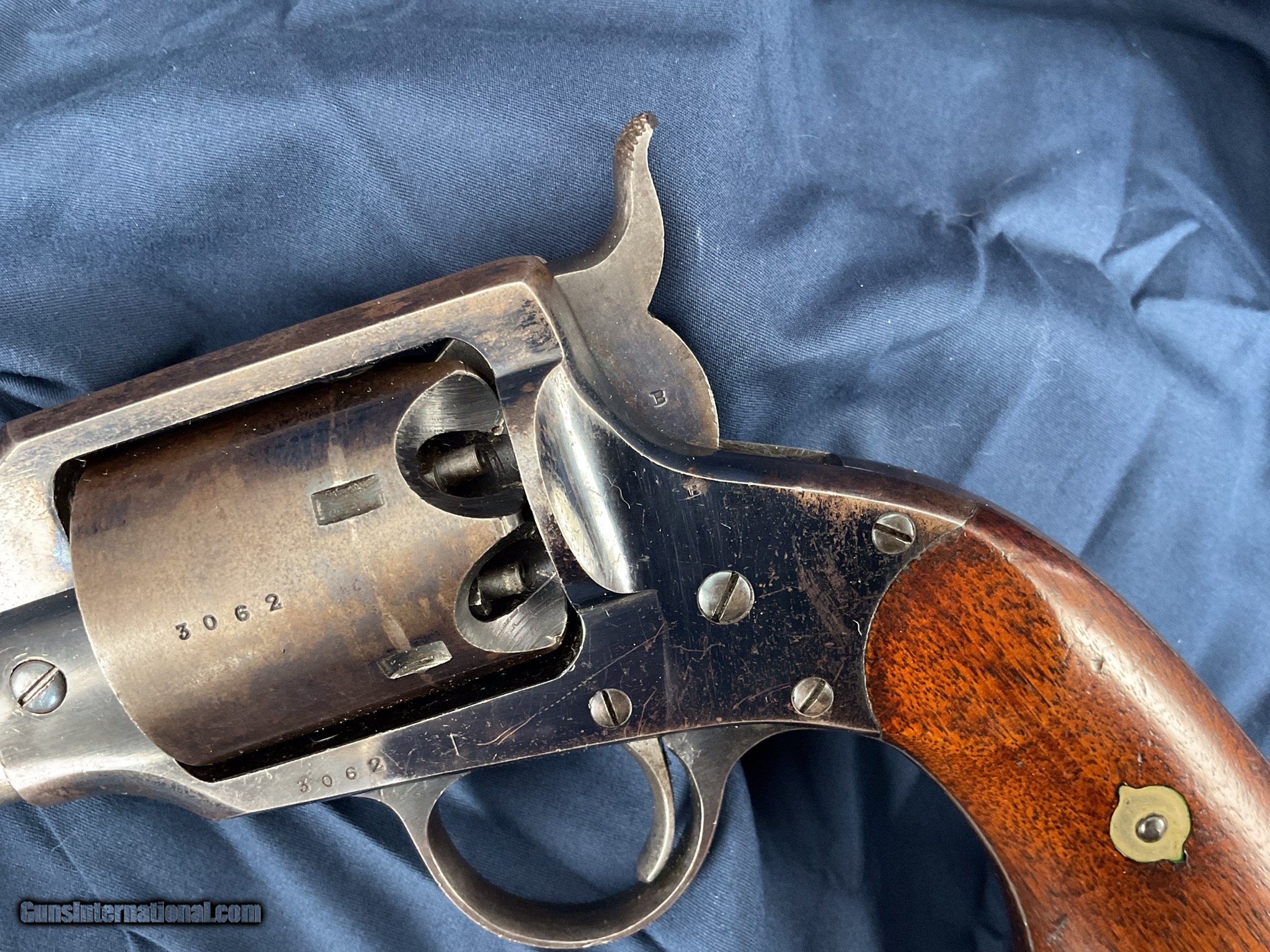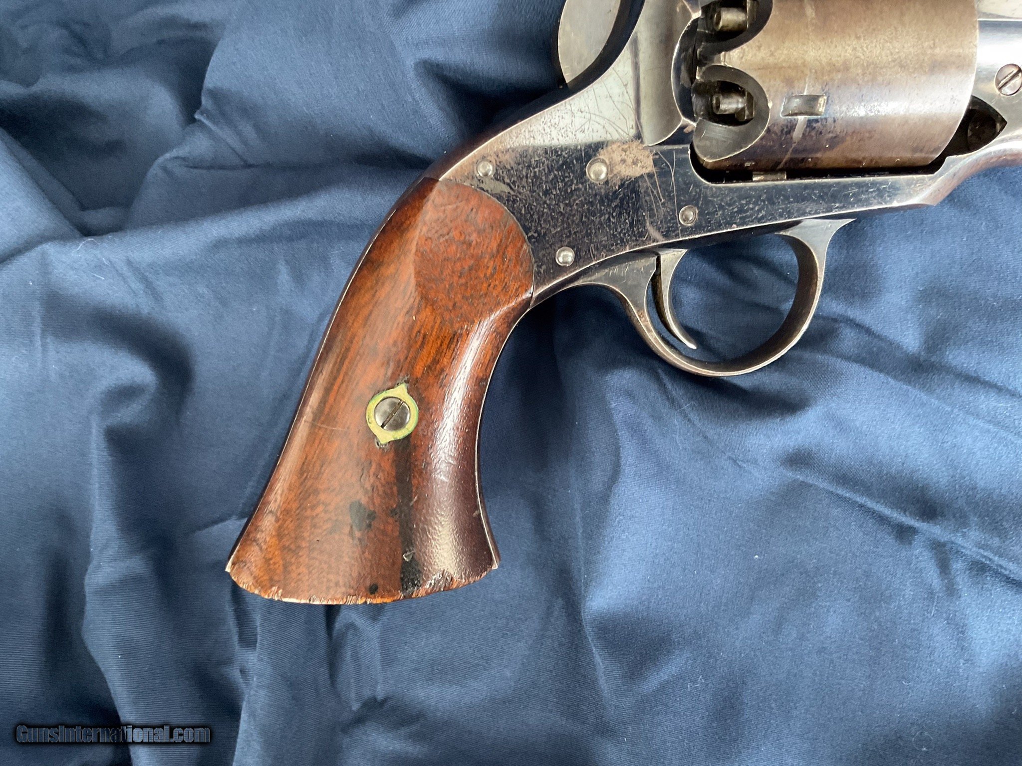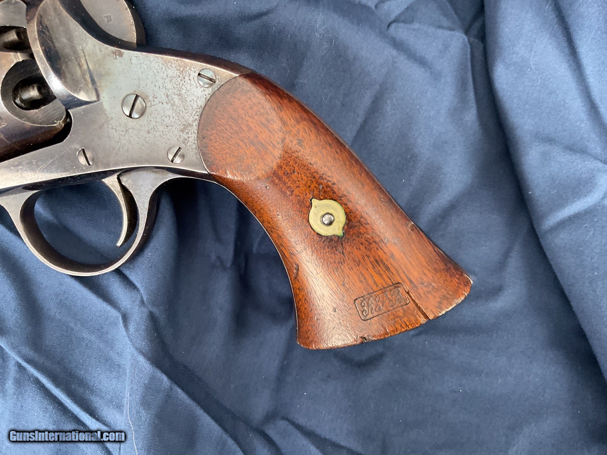 Description: This six-shot .44 caliber percussion single action revolver was manufactured by the Rogers & Spencer Co. of Willow Dale, New York, and was part of a 1864 Ordnance Department contract for 5,000 revolvers. Most of these Rodges & Spencer revolvers were delivered after the conclusion of hostilities in April 1865 and were never issued. The top strap is marked "ROGERS & SPENCER /UTICA N-Y". The matching serial number is located on the bottom of the grip strap, the cylinder, the underside of the barrel, the loading lever, cylinder and the left side of the frame. Ordnance "B" sub-inspection marks are stamped on the barrel, frame, loading lever, cylinder, trigger guard, and grips. Cone front and frame notch rear sights, blue finish with casehardened hammer and loading lever. Fitted with smooth walnut grips with a sharp boxed "RPB" cartouche on the lower left side and each panel is numbered to the gun on the inside. The revolver retains 45 to 50% of the bright original blue finish, showing scattered patches of smooth brown patina with some bright edge wear and handling marks. The grips are in good condition, showing normal handling marks and a few scattered minor dings and scratches. The cartouche on the left panel remains sharp. The markings are sharp. The action is excellent. This is a well above average conditioned Civil War Rodgers & Spencer revolver offered at a reasonable price. Please feel free to ask questions. I will consider trades and I also offer a layaway (please contact me for full details). SOLD Antique: Yes |