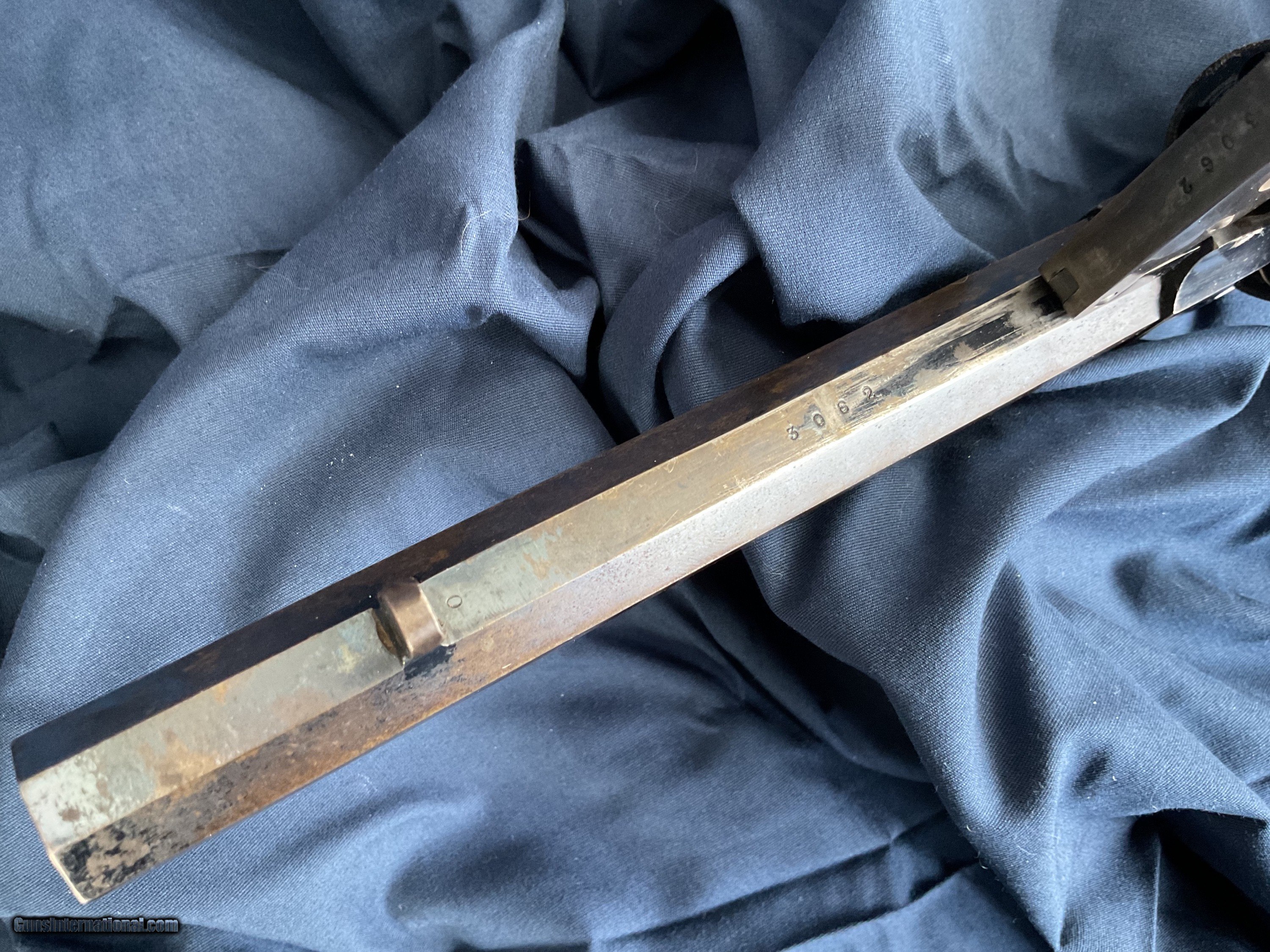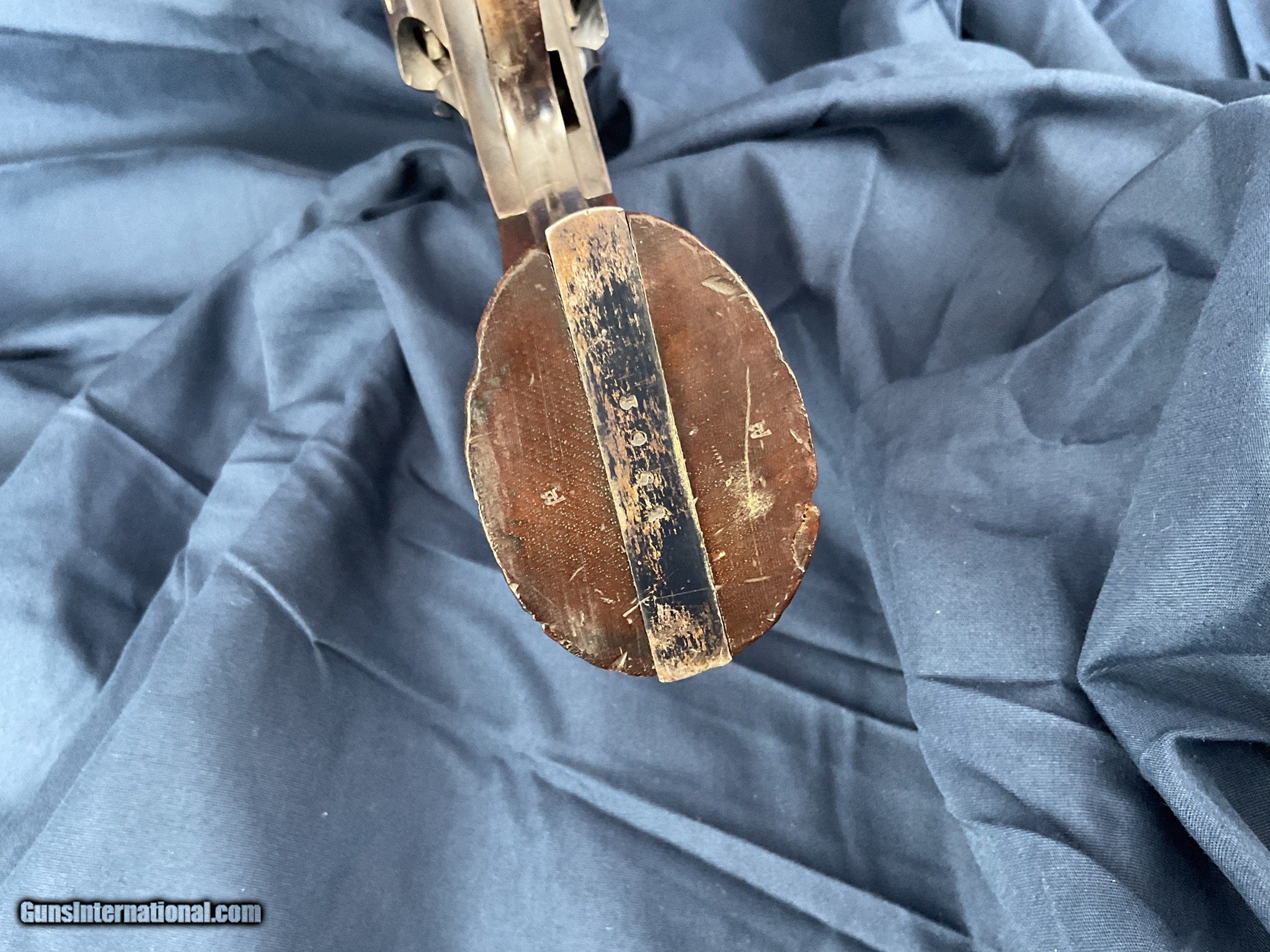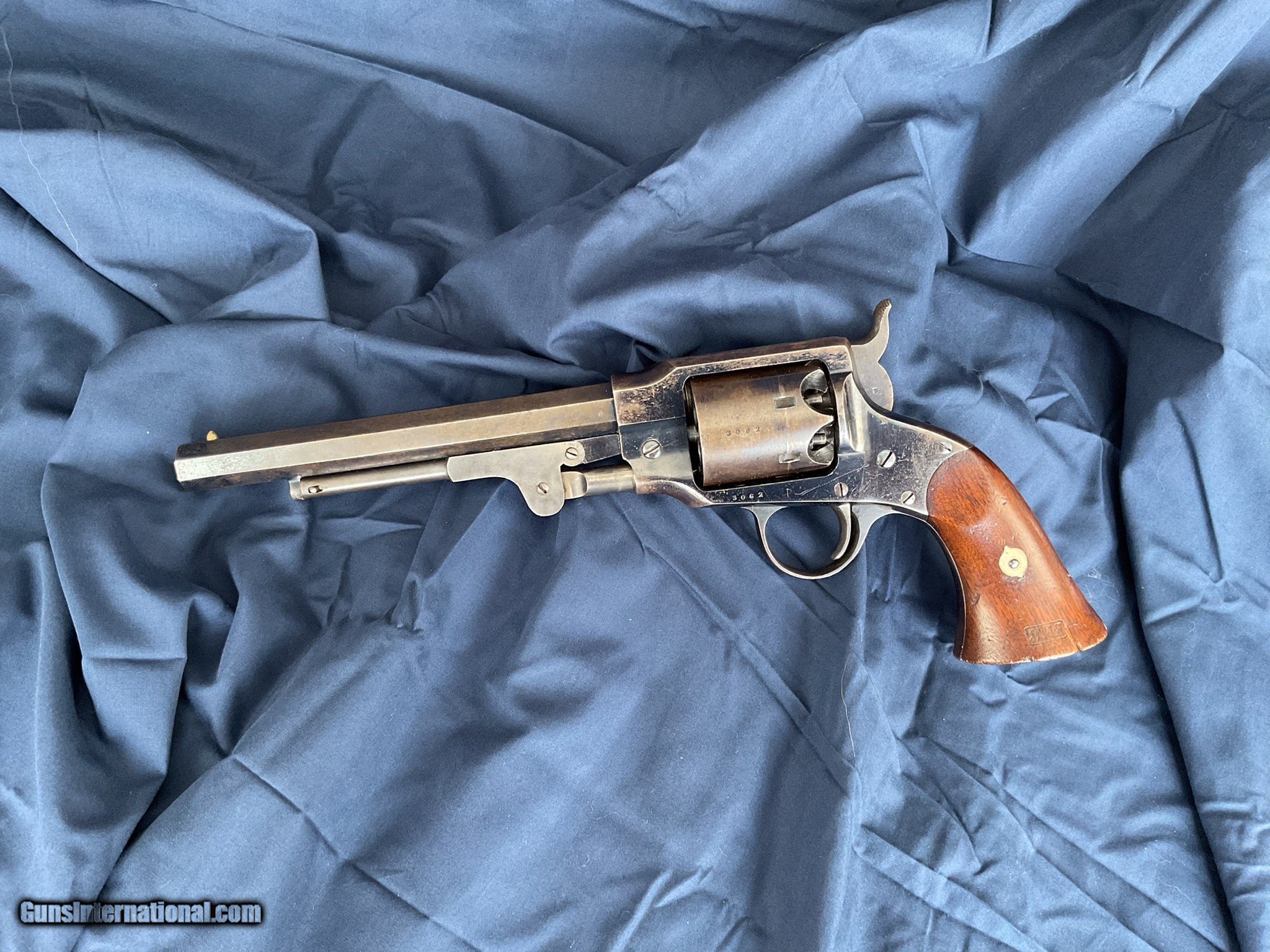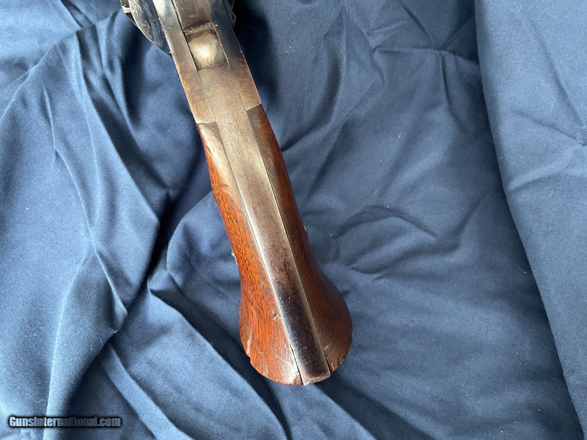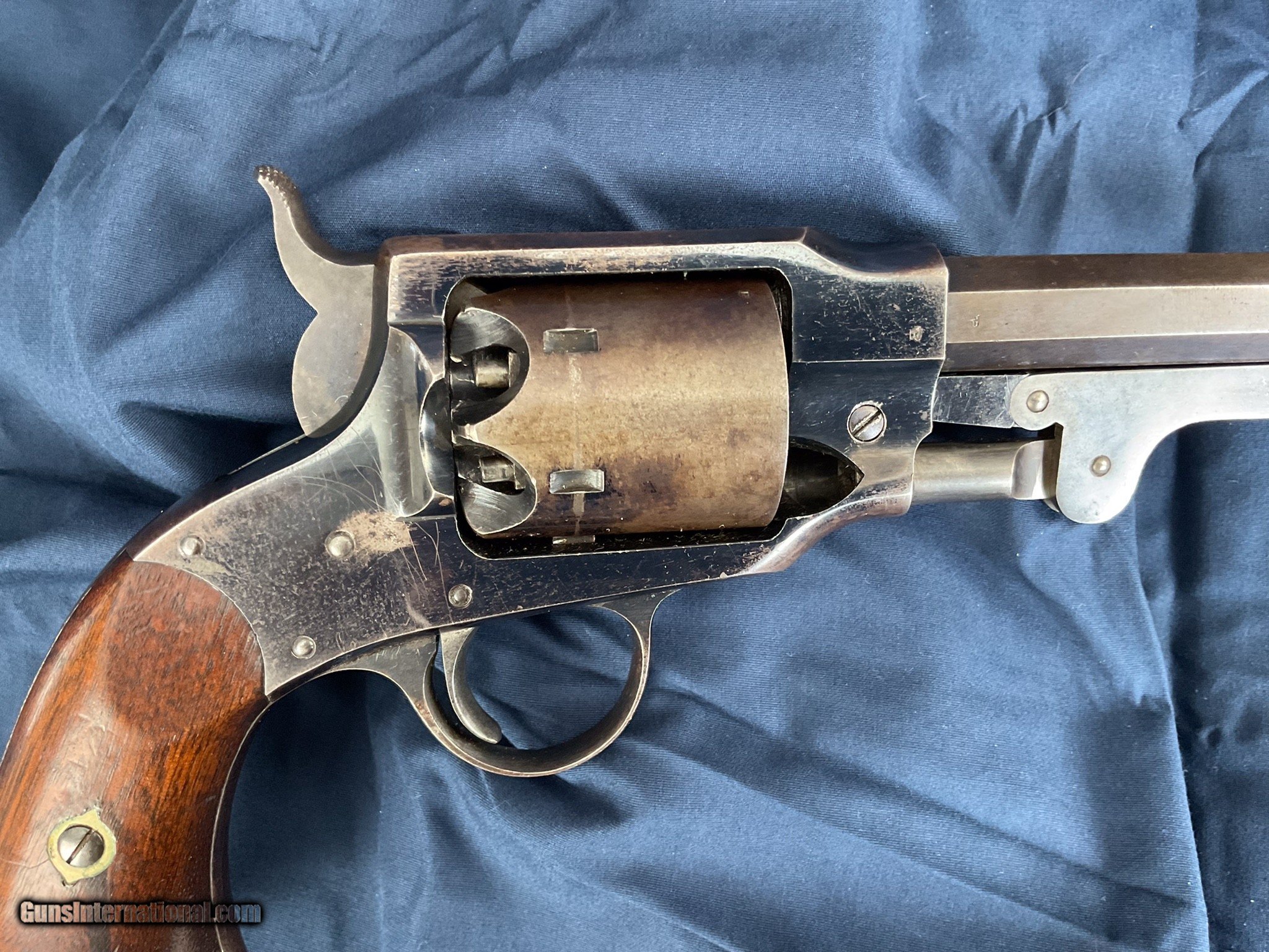 Description: This six-shot .44 caliber percussion single action revolver was manufactured by the Rogers & Spencer Co. of Willow Dale, New York, and was part of a 1864 Ordnance Department contract for 5,000 revolvers. Most of these Rodges & Spencer revolvers were delivered after the conclusion of hostilities in April 1865 and were never issued. The top strap is marked "ROGERS & SPENCER /UTICA N-Y". The matching serial number is located on the bottom of the grip strap, the cylinder, the underside of the barrel, the loading lever, cylinder and the left side of the frame. Ordnance "B" sub-inspection marks are stamped on the barrel, frame, loading lever, cylinder, trigger guard, and grips. Cone front and frame notch rear sights, blue finish with casehardened hammer and loading lever. Fitted with smooth walnut grips with a sharp boxed "RPB" cartouche on the lower left side and each panel is numbered to the gun on the inside. The revolver retains 45 to 50% of the bright original blue finish, showing scattered patches of smooth brown patina with some bright edge wear and handling marks. The grips are in good condition, showing normal handling marks and a few scattered minor dings and scratches. The cartouche on the left panel remains sharp. The markings are sharp. The action is excellent. This is a well above average conditioned Civil War Rodgers & Spencer revolver offered at a reasonable price. Please feel free to ask questions. I will consider trades and I also offer a layaway (please contact me for full details). SOLD Antique: Yes |