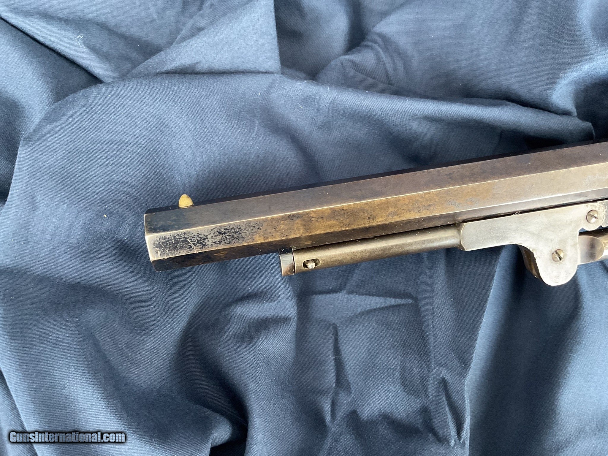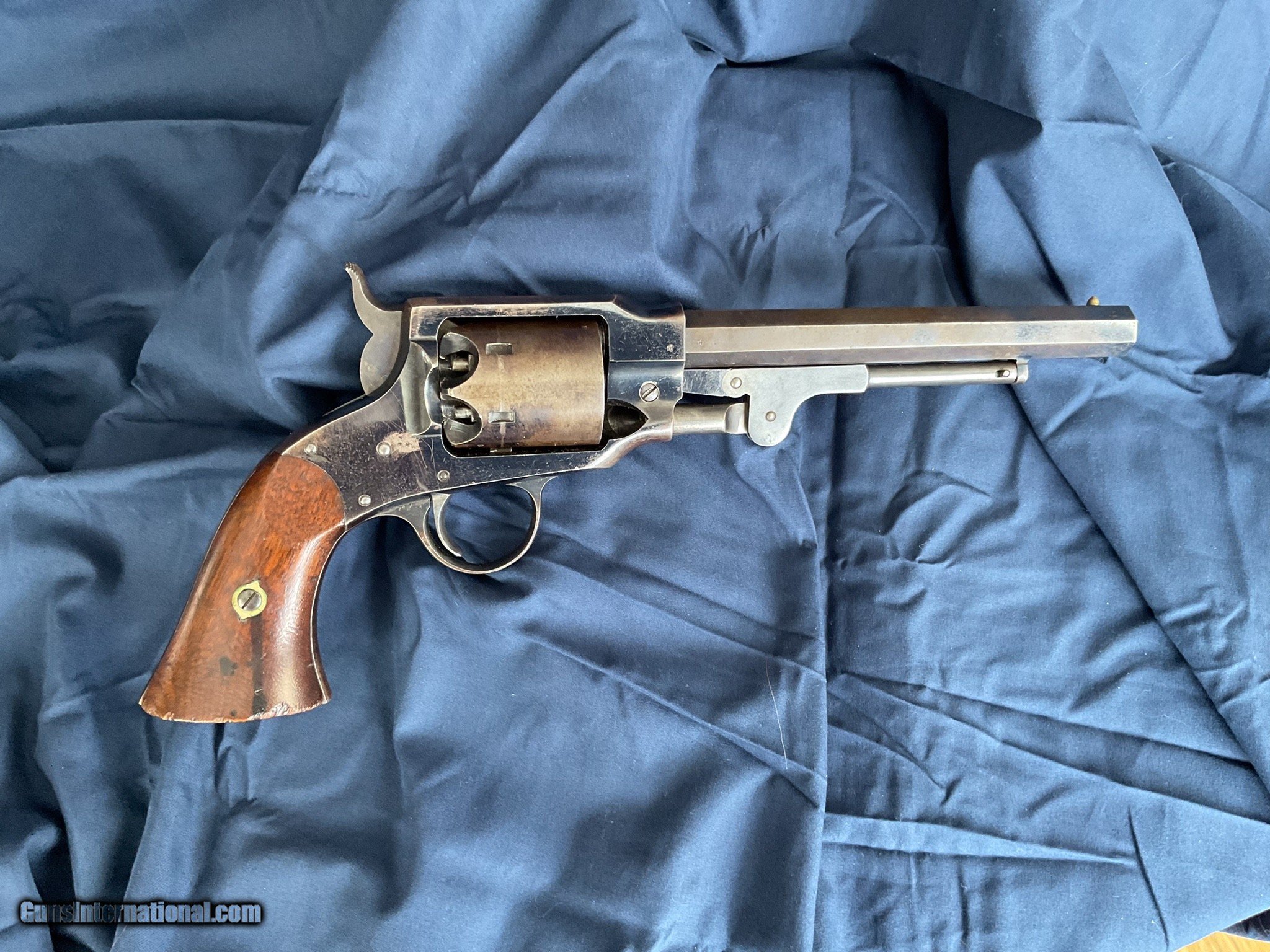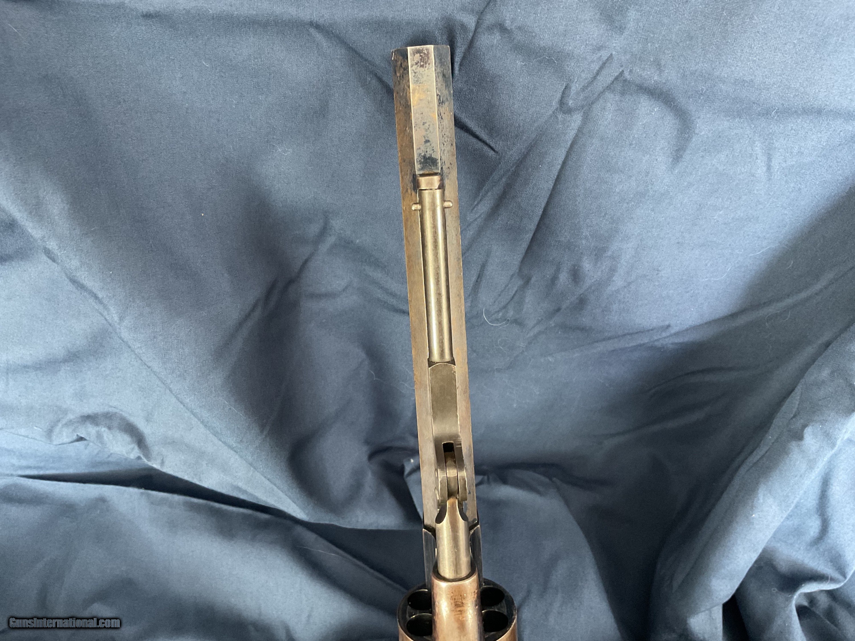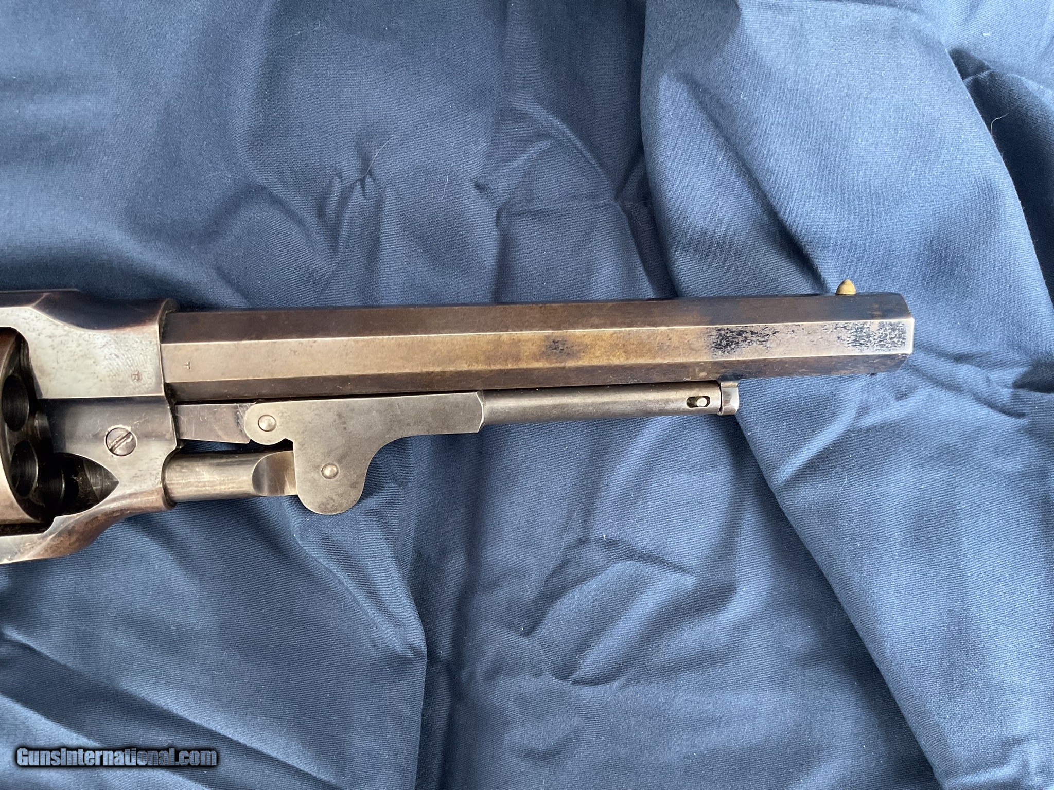 Description: This six-shot .44 caliber percussion single action revolver was manufactured by the Rogers & Spencer Co. of Willow Dale, New York, and was part of a 1864 Ordnance Department contract for 5,000 revolvers. Most of these Rodges & Spencer revolvers were delivered after the conclusion of hostilities in April 1865 and were never issued. The top strap is marked "ROGERS & SPENCER /UTICA N-Y". The matching serial number is located on the bottom of the grip strap, the cylinder, the underside of the barrel, the loading lever, cylinder and the left side of the frame. Ordnance "B" sub-inspection marks are stamped on the barrel, frame, loading lever, cylinder, trigger guard, and grips. Cone front and frame notch rear sights, blue finish with casehardened hammer and loading lever. Fitted with smooth walnut grips with a sharp boxed "RPB" cartouche on the lower left side and each panel is numbered to the gun on the inside. The revolver retains 45 to 50% of the bright original blue finish, showing scattered patches of smooth brown patina with some bright edge wear and handling marks. The grips are in good condition, showing normal handling marks and a few scattered minor dings and scratches. The cartouche on the left panel remains sharp. The markings are sharp. The action is excellent. This is a well above average conditioned Civil War Rodgers & Spencer revolver offered at a reasonable price. Please feel free to ask questions. I will consider trades and I also offer a layaway (please contact me for full details). SOLD Antique: Yes |