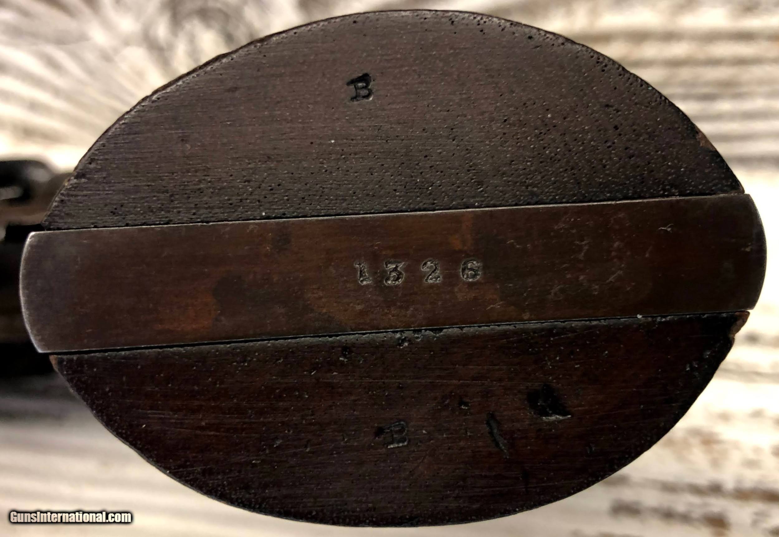 Description: This six-shot .44 caliber percussion single action revolver was manufactured by the Rogers & Spencer Co. of Willow Dale, New York, and was part of a 1864 Ordnance Department contract for 5,000 revolvers. Most of these Rogers & Spencer revolvers were delivered after the conclusion of hostilities in April 1865 and were never issued. The top strap is marked "ROGERS & SPENCER /UTICA N-Y". The matching serial number is located on the bottom of the grip strap, the cylinder, the underside of the barrel, the loading lever, cylinder and the left side of the frame. Ordnance "B" sub-inspection marks are stamped on the barrel, frame, loading lever, cylinder, trigger guard, and grips. Cone front and frame notch rear sights, blue finish with casehardened hammer and loading lever. Fitted with smooth walnut grips with a sharp boxed "RPB" cartouche on the lower left side and each panel is numbered to the gun on the inside. Condition is very good. The revolver retains 90% of the original blue finish, showing scattered patches of smooth brown patina with some bright edge wear and handling marks. The grips are in fine condition. The cartouche on the left panel remains sharp. The markings are sharp. The action is excellent. This is an exceptionally high conditioned Civil War Rogers & Spencer revolver worthy of the finest Civil War collection. SOLD Curio/Relic: Yes Antique: Yes Handgun Caliber: .44 |