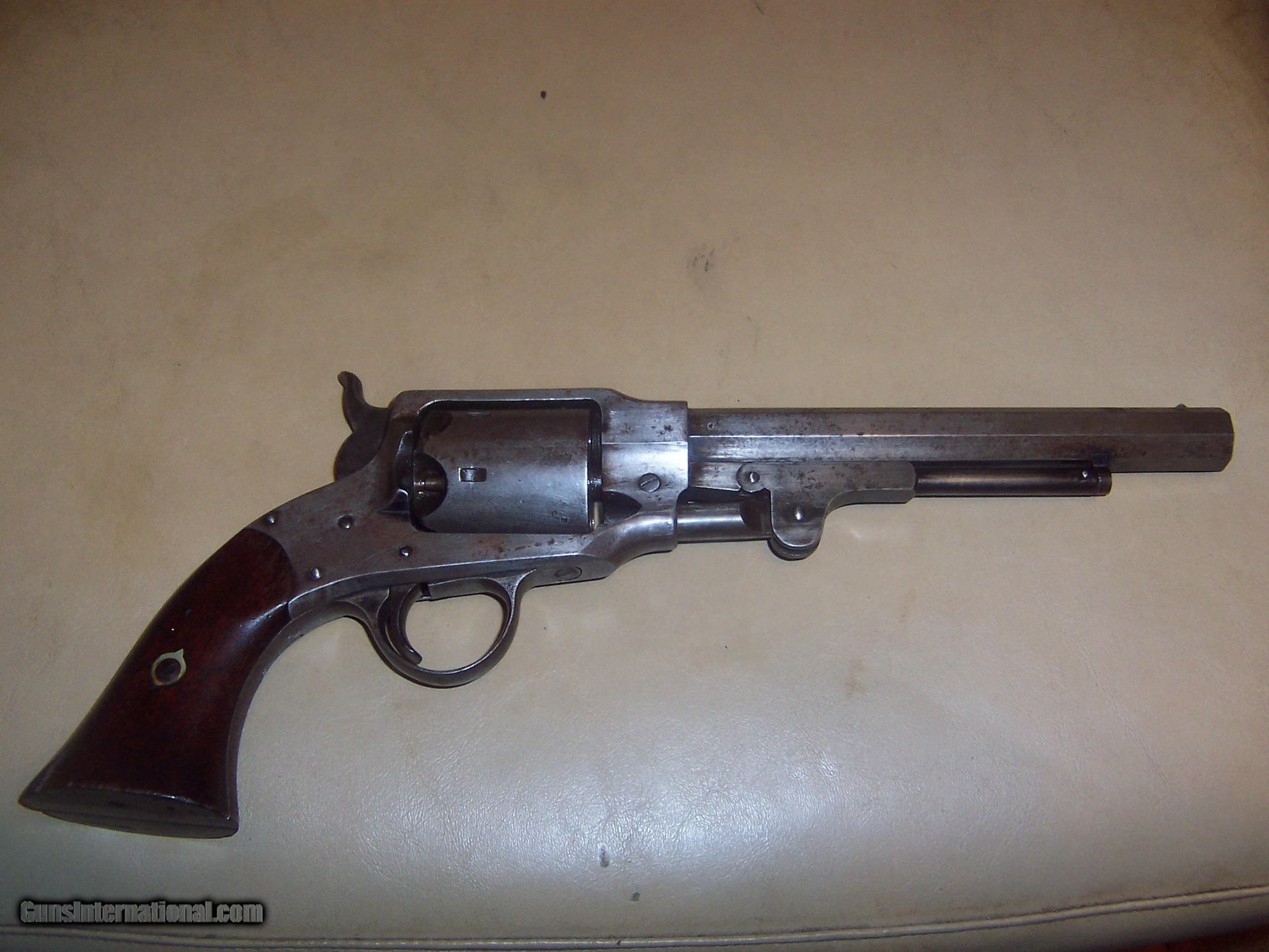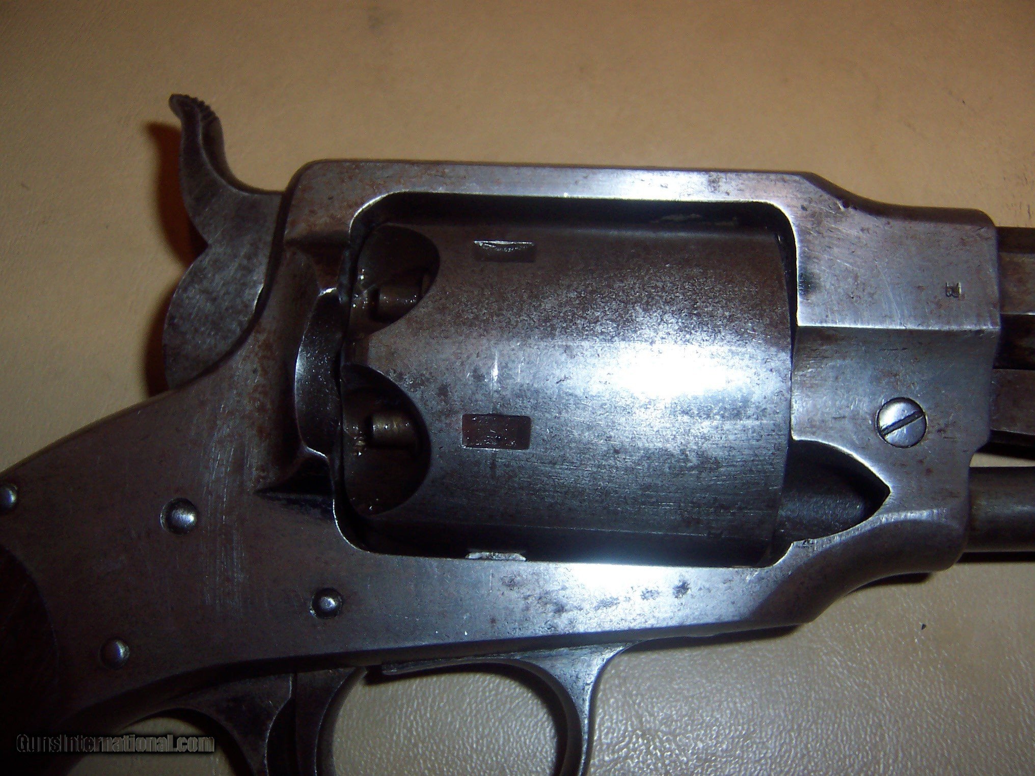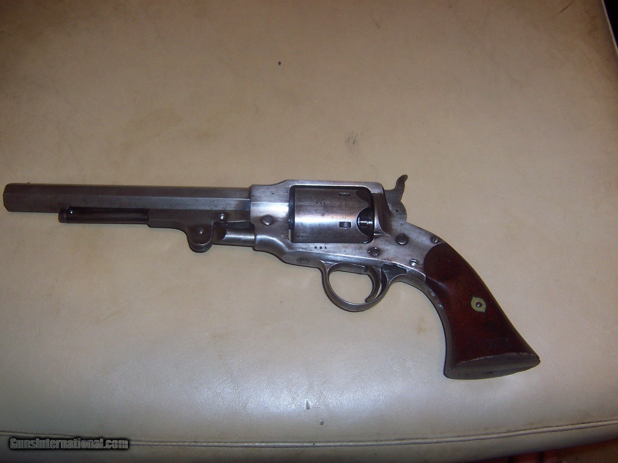 Description: bore looks almost unfired , traces of blue on loading lever grips and gun has military inspectors marks ;;;revolver has no pitting but metal has a gray color ,, needs hand spring buy all parts are there and cocks and clicks a very good crisp revolver showing very littel use,, chip in right grip ,,all screws turn freely so easy to fix 44 caliber marked rogers & spencer utica ny,, 7 1/2 inch barrel SOLD Antique: Yes Manufacturer: rogers & spencer Model: revolver |