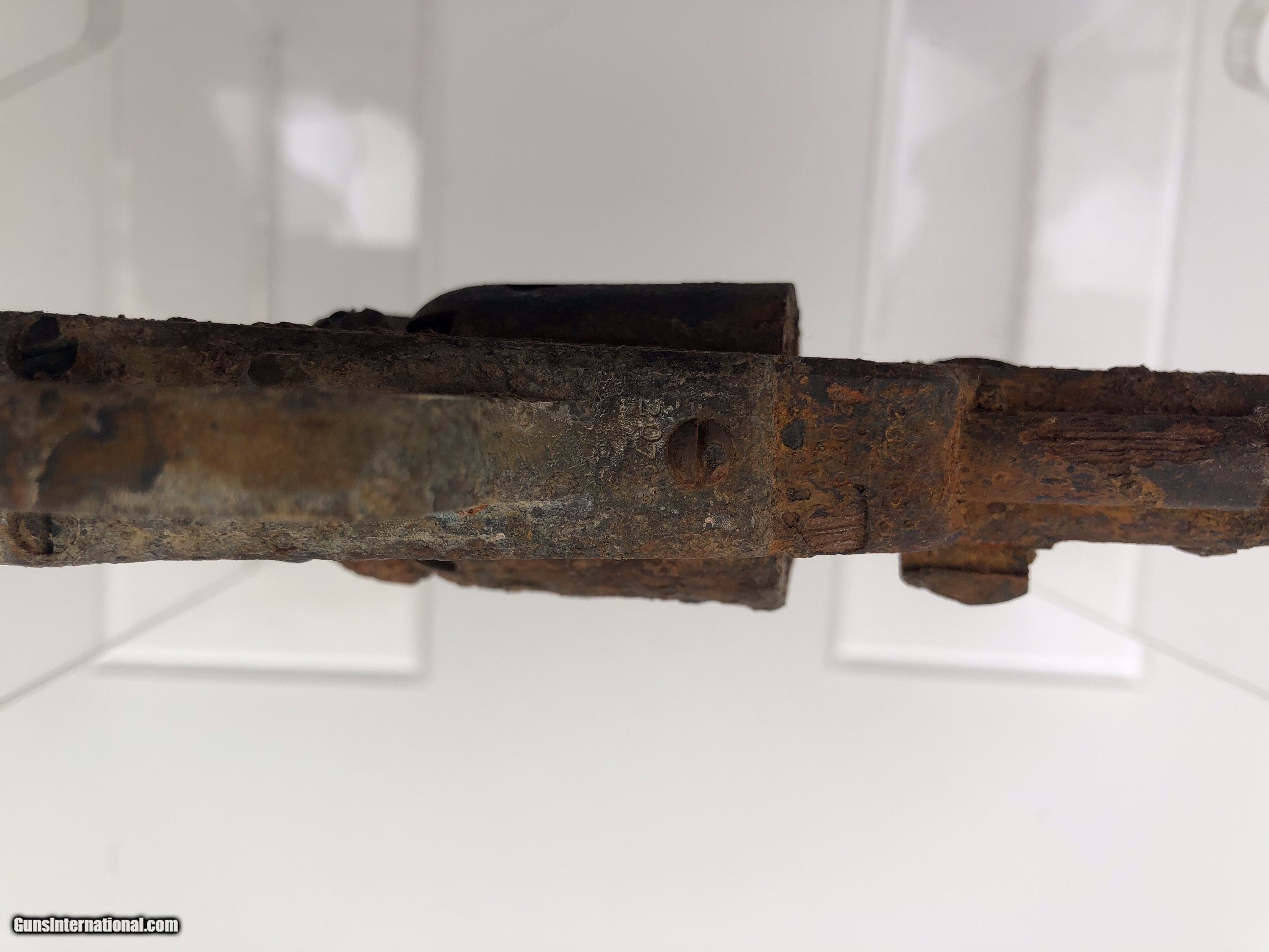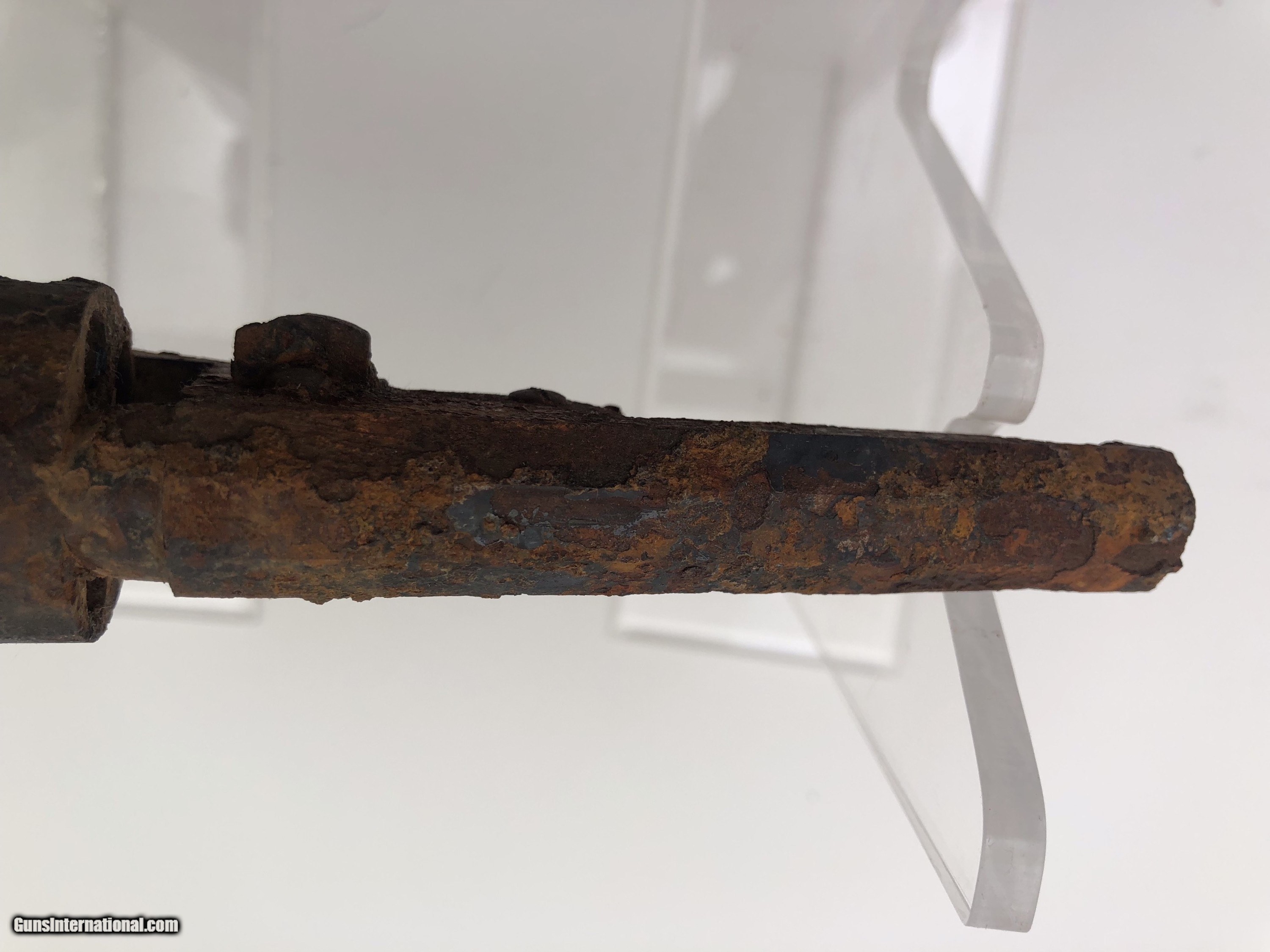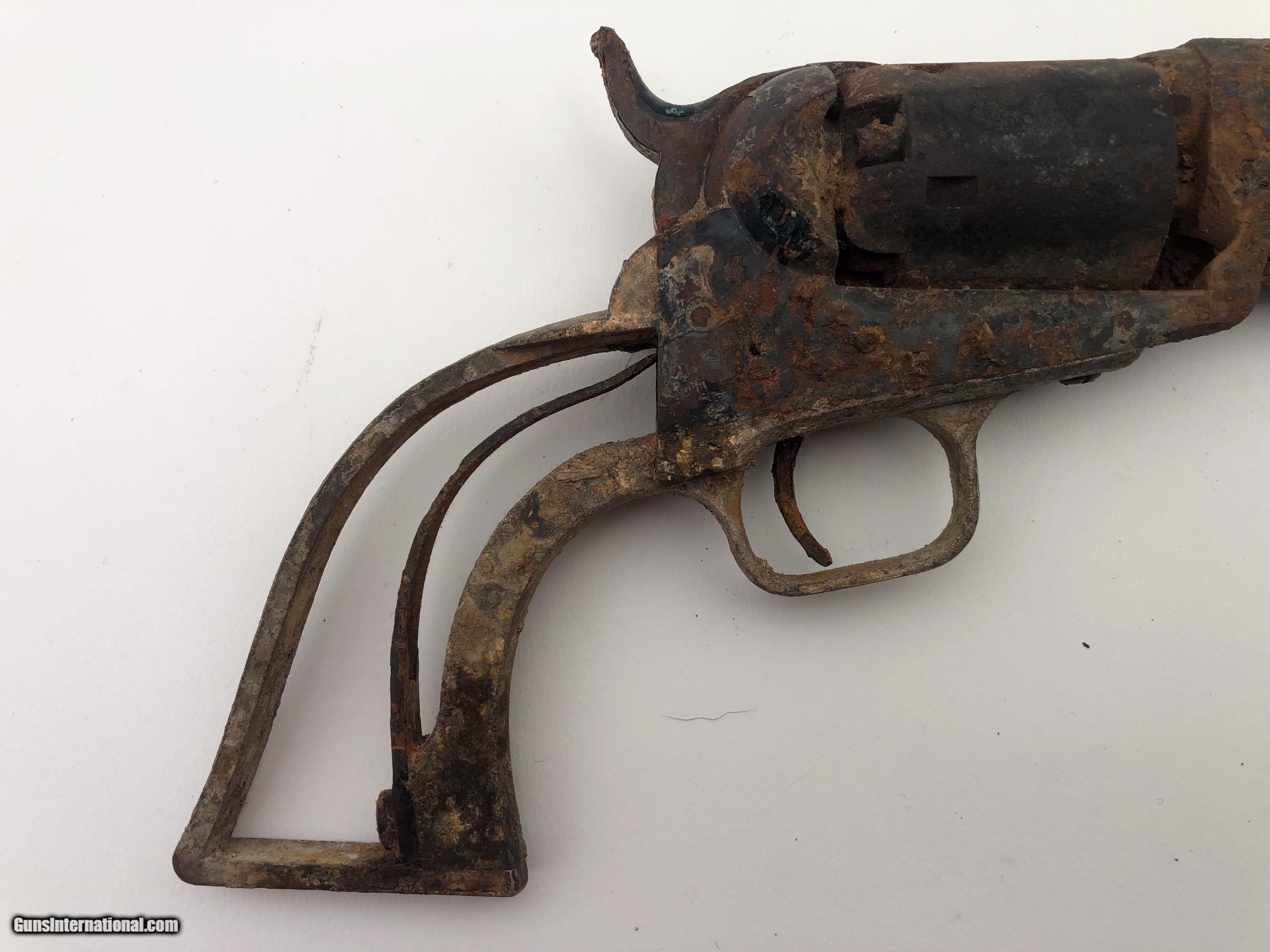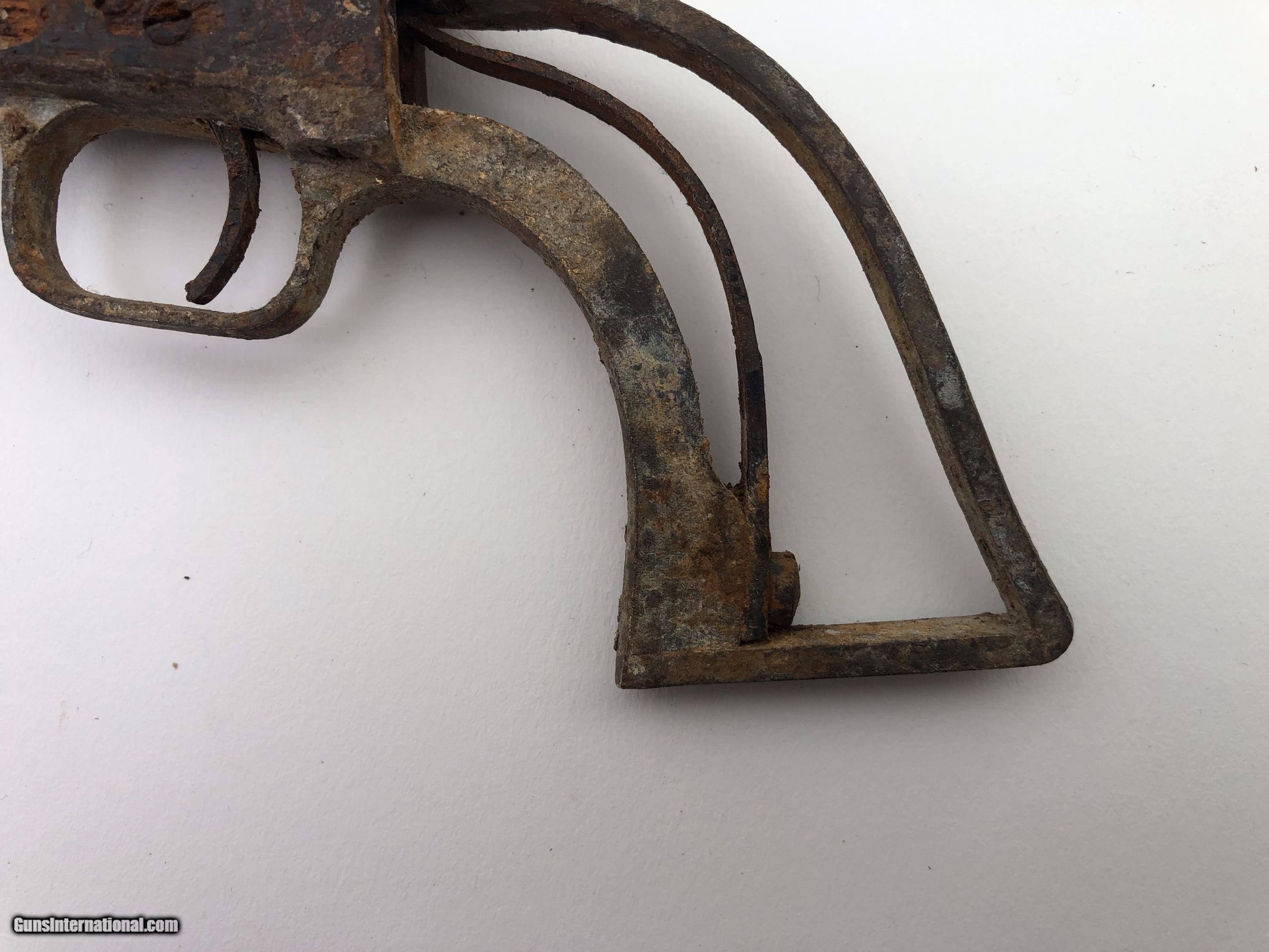 Description: This revolver appears to have been in a fire and was found in the ground many years later. The action is frozen solid. Serial # is 20792 and is an early gun with a small triggerguard and a 5 shot cylinder. SOLD Antique: Yes Manufacturer: Colt Model: 1849 Serial Number: 20792 Barrel Length: 4 Metal Condition: Rusted relic Wood Condition: missing |