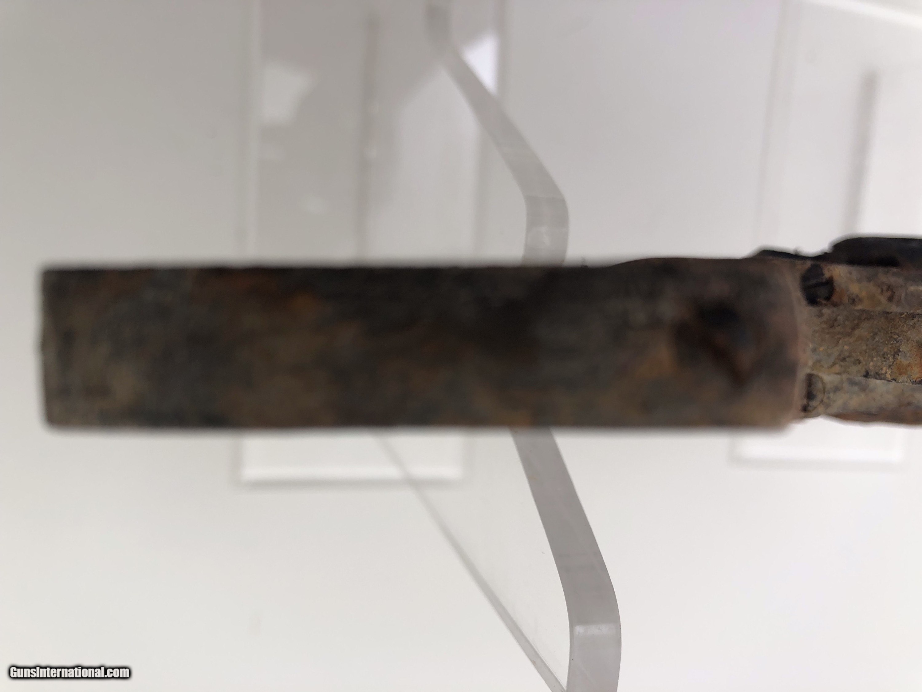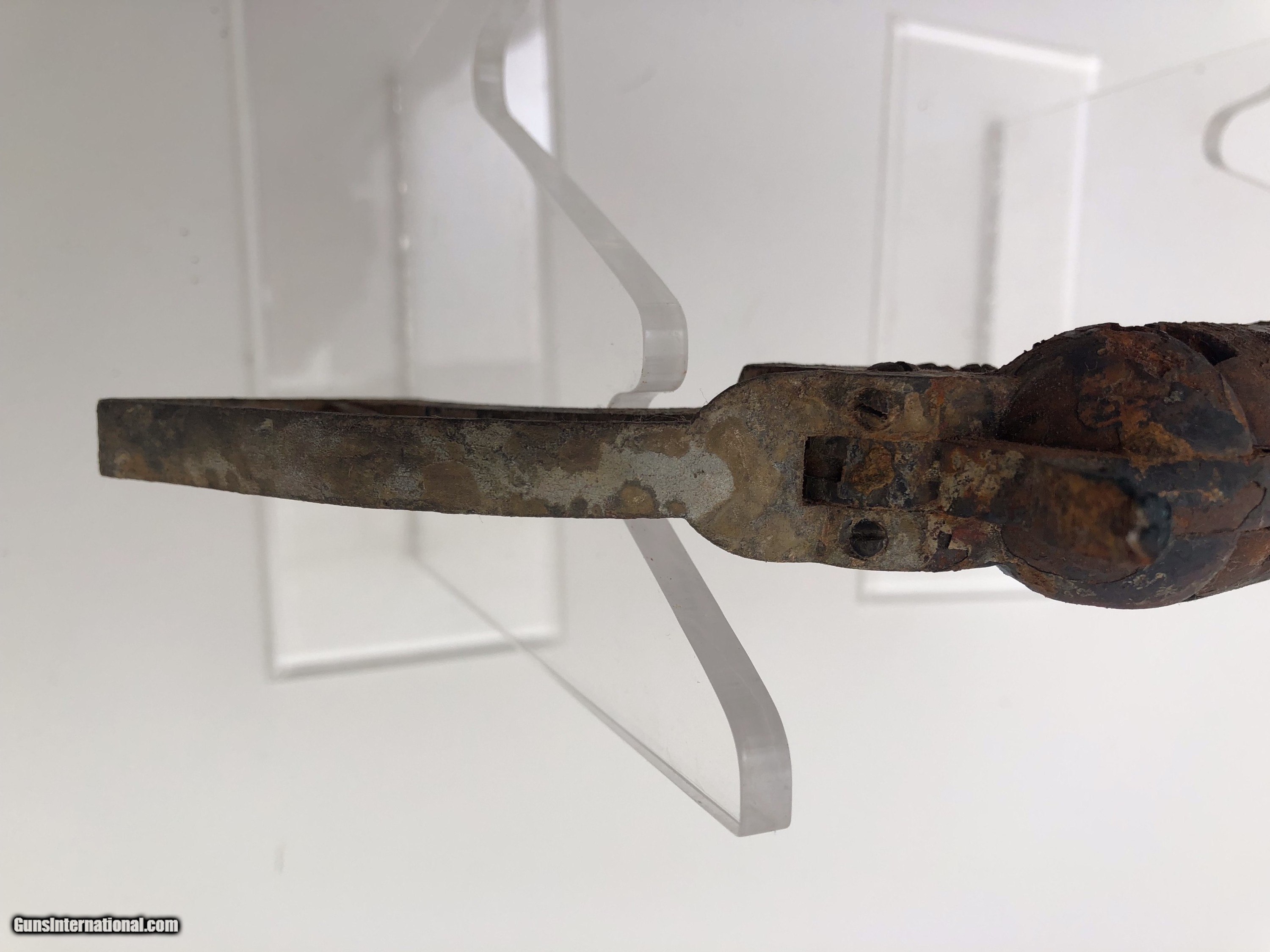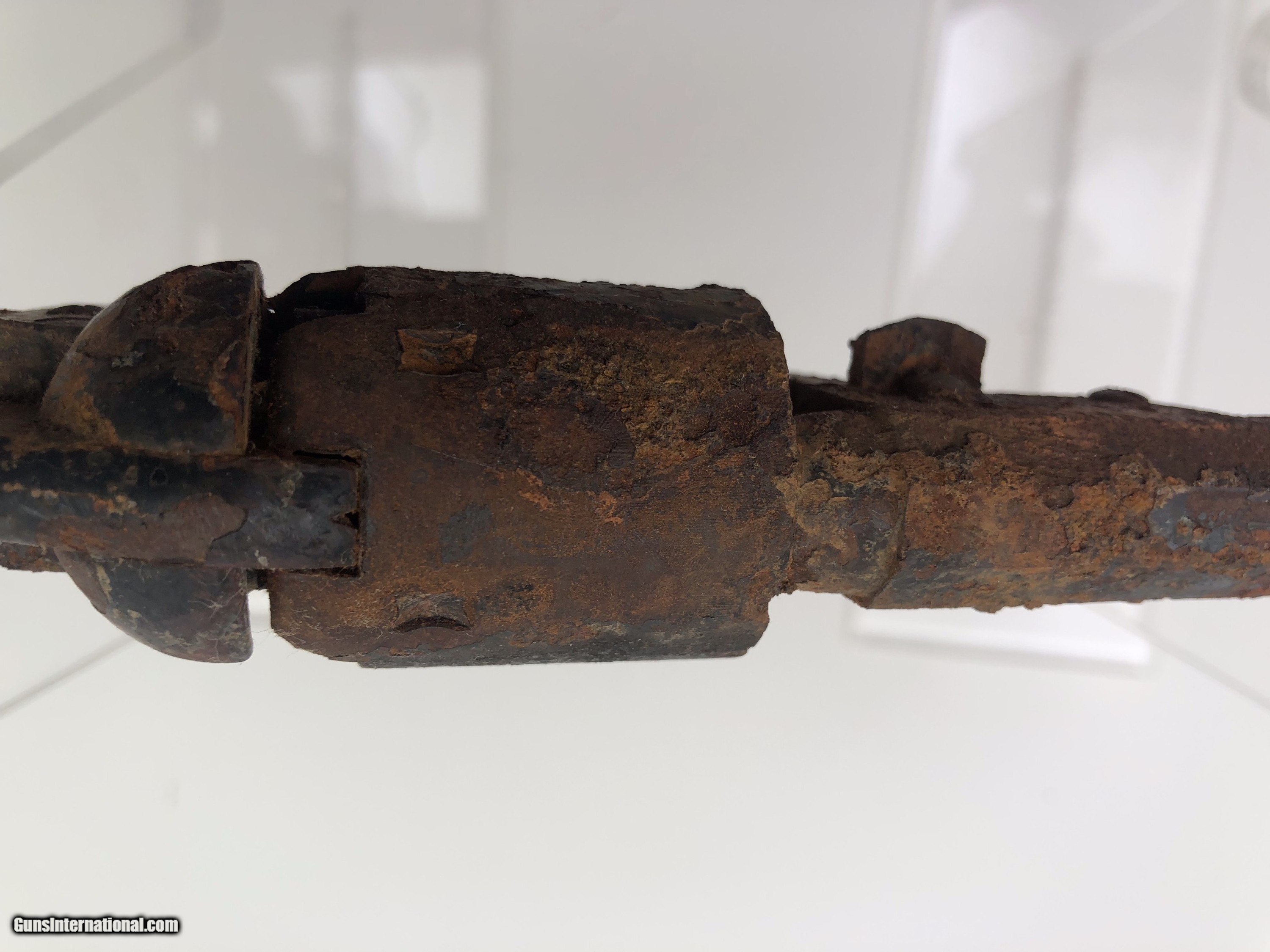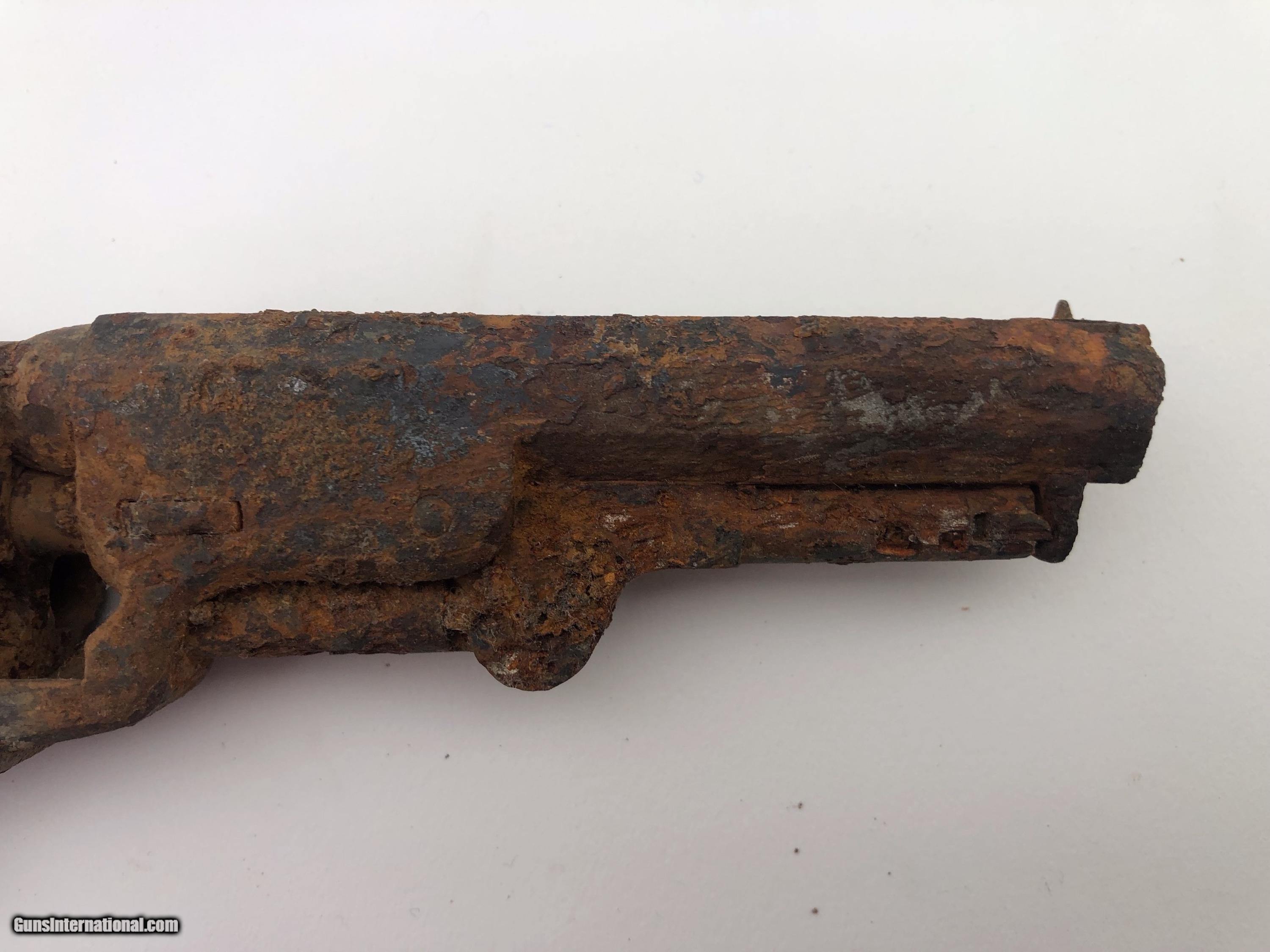Description: This revolver appears to have been in a fire and was found in the ground many years later. The action is frozen solid. Serial # is 20792 and is an early gun with a small triggerguard and a 5 shot cylinder. SOLD Antique: Yes Manufacturer: Colt Model: 1849 Serial Number: 20792 Barrel Length: 4 Metal Condition: Rusted relic Wood Condition: missing |