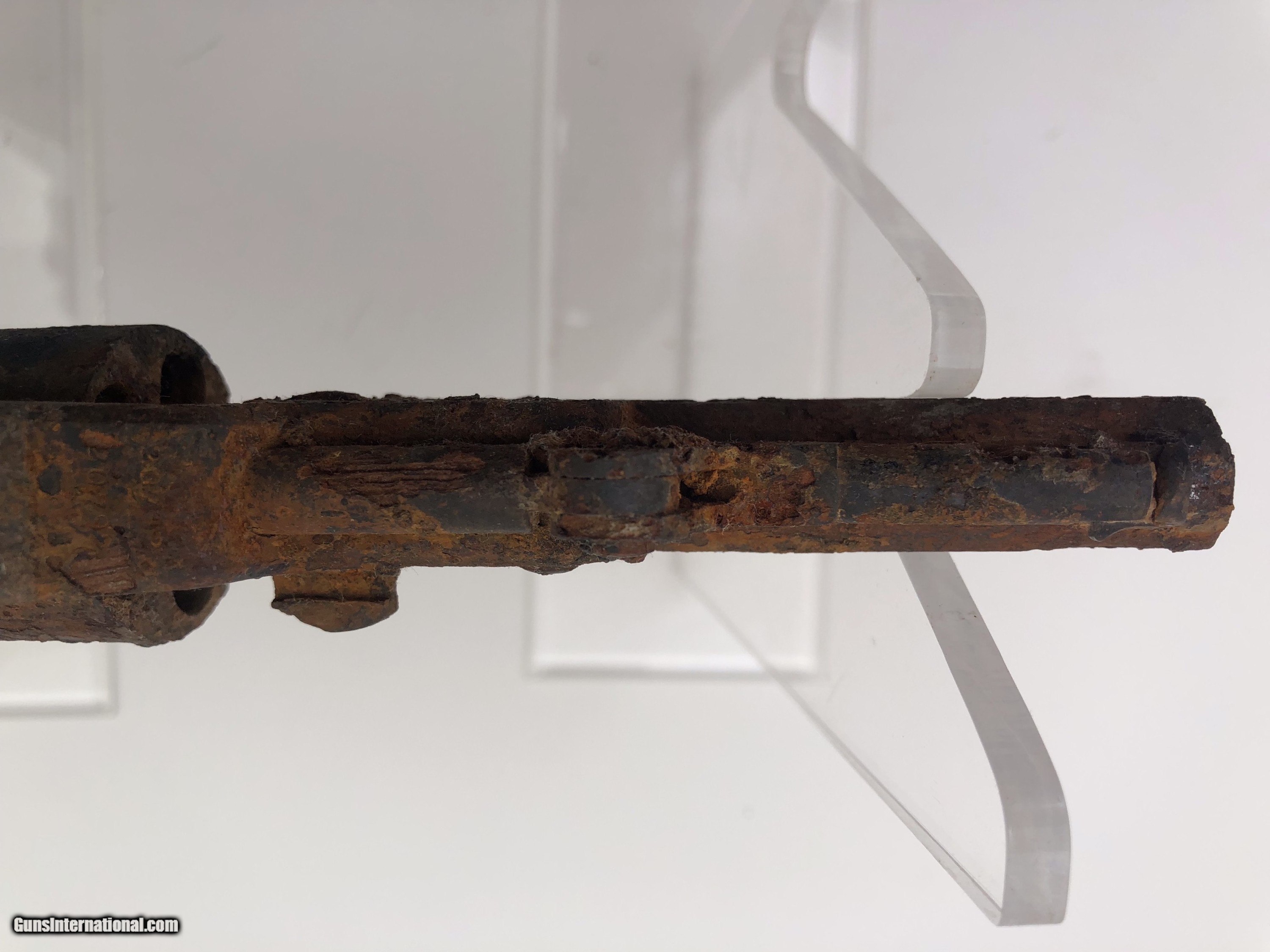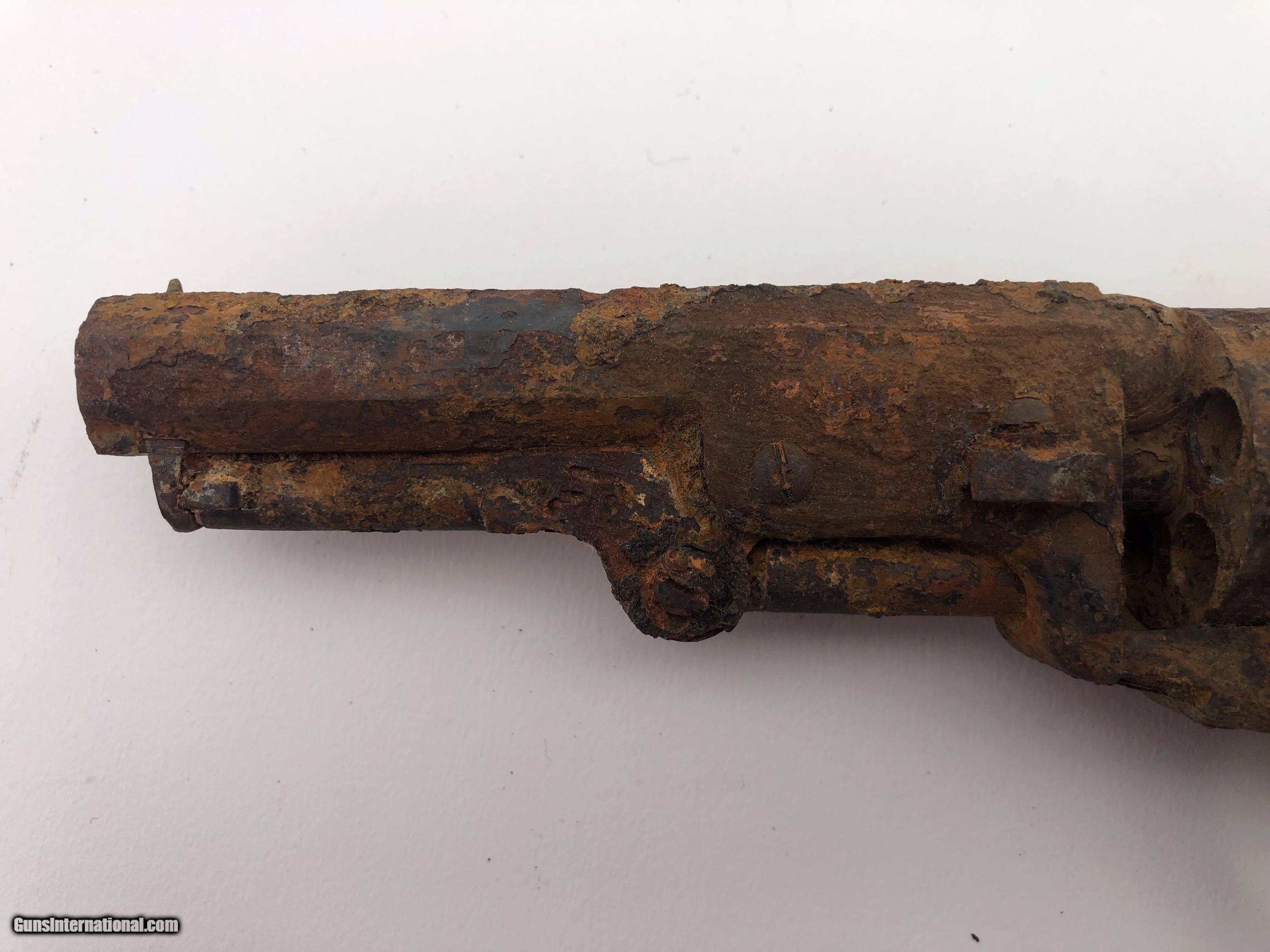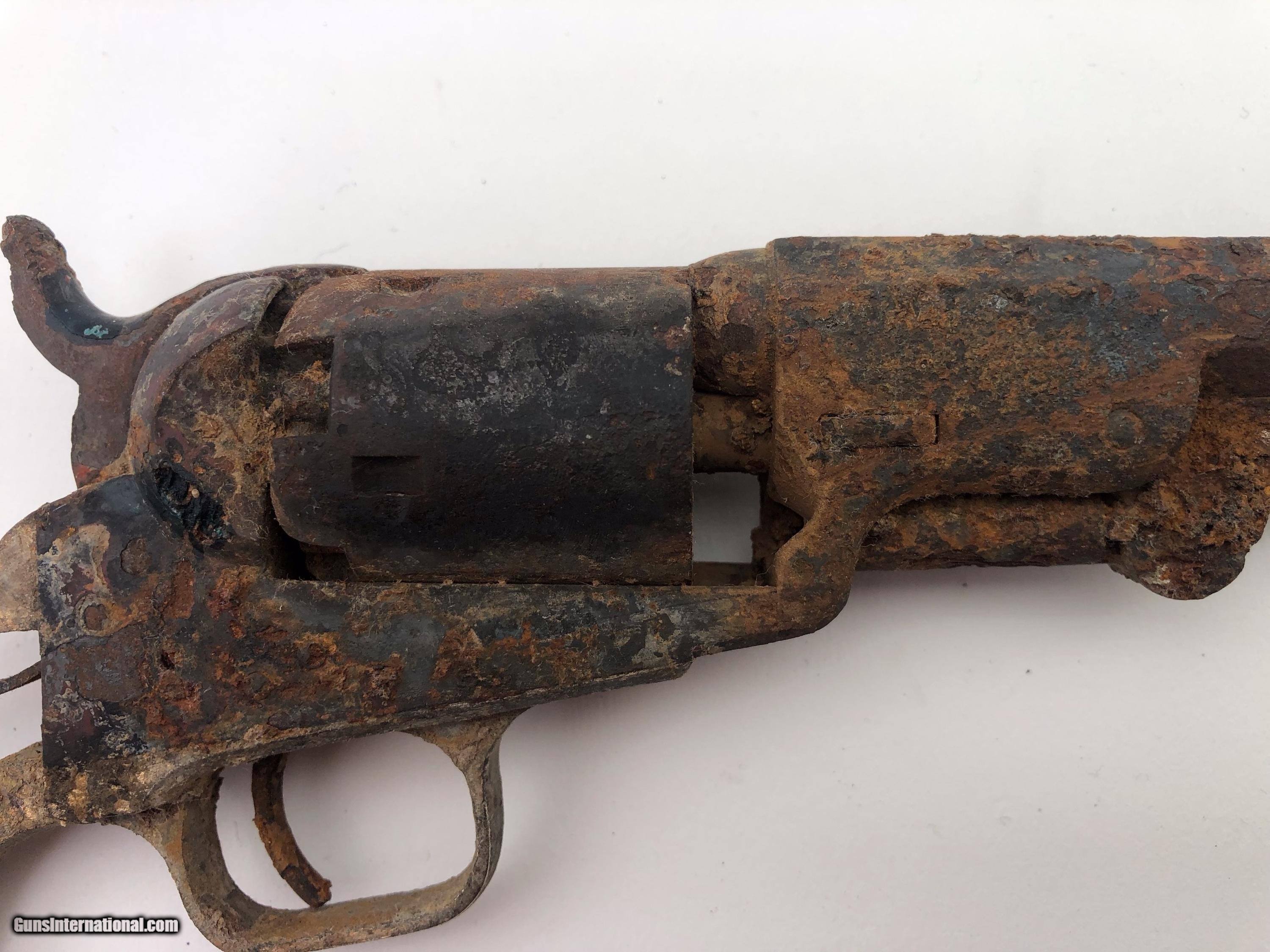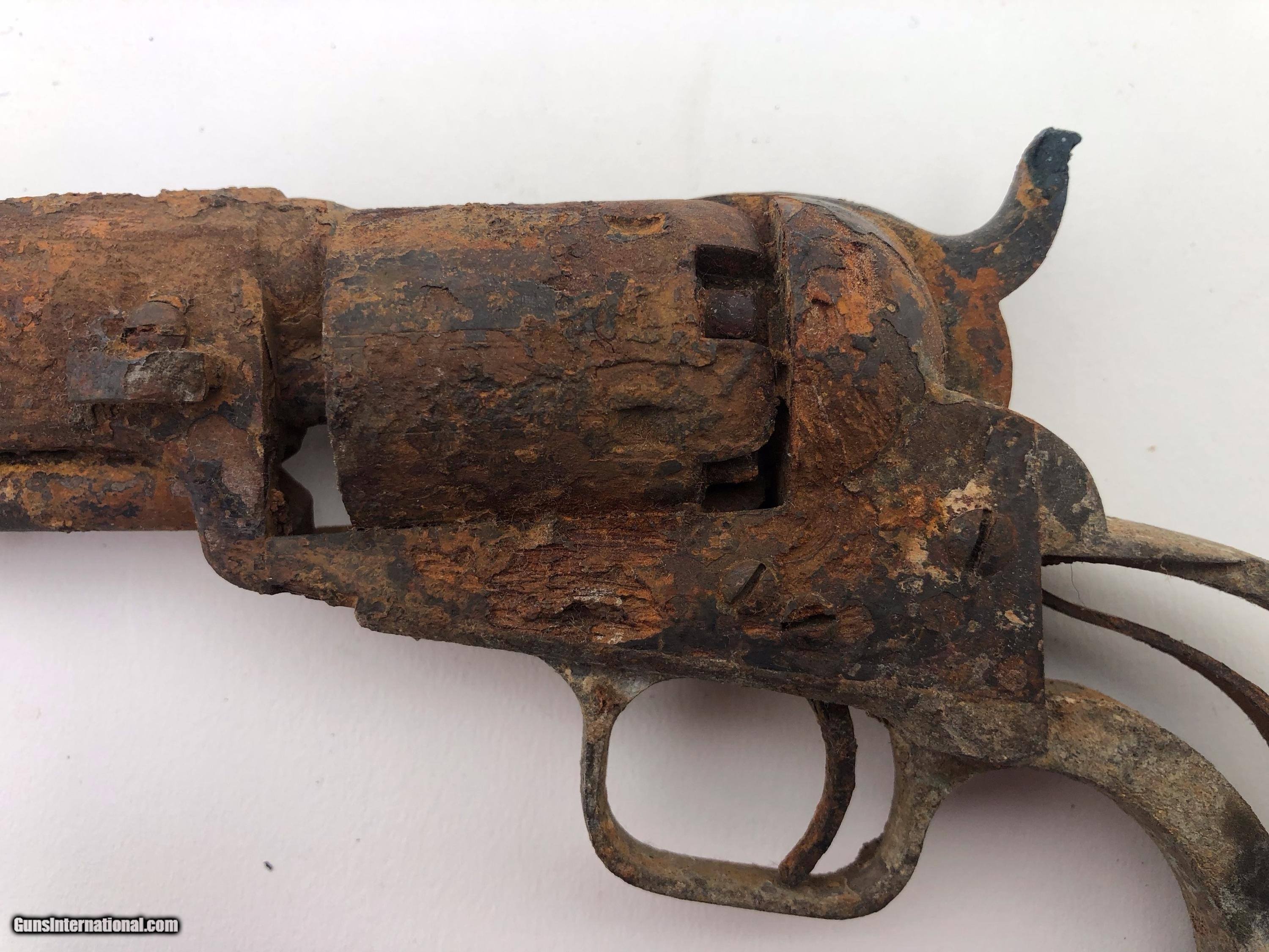 Description: This revolver appears to have been in a fire and was found in the ground many years later. The action is frozen solid. Serial # is 20792 and is an early gun with a small triggerguard and a 5 shot cylinder. SOLD Antique: Yes Manufacturer: Colt Model: 1849 Serial Number: 20792 Barrel Length: 4 Metal Condition: Rusted relic Wood Condition: missing |
