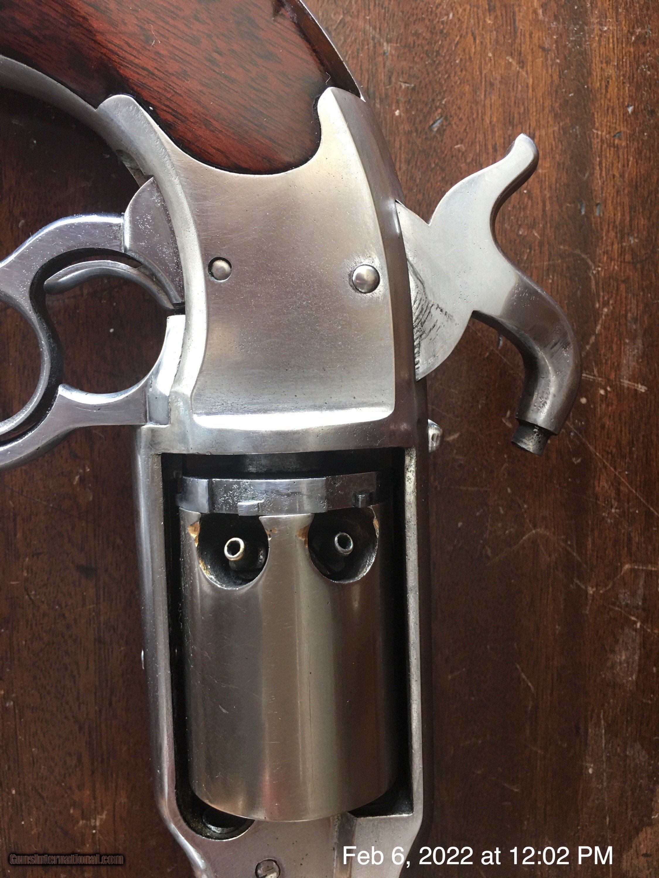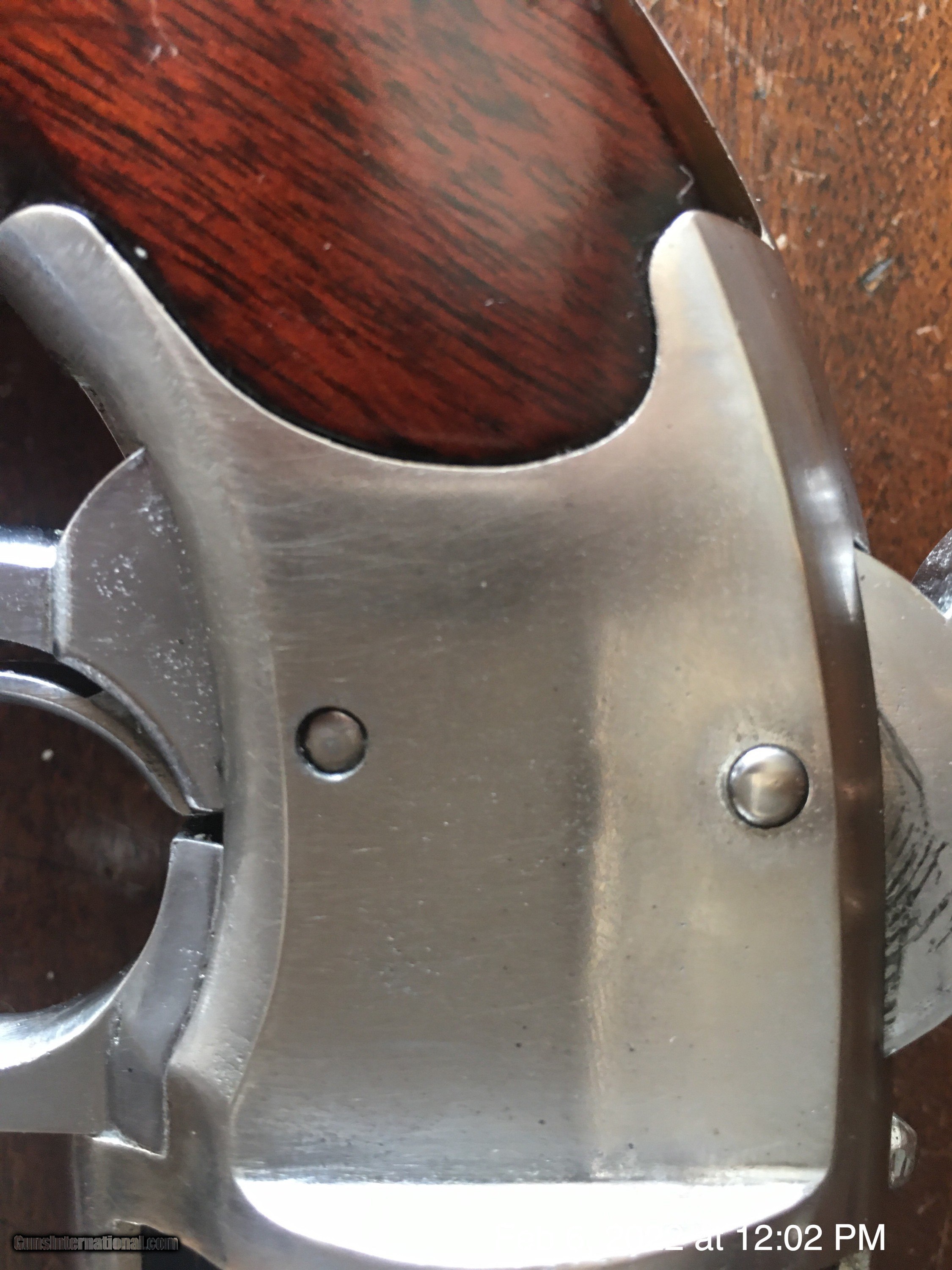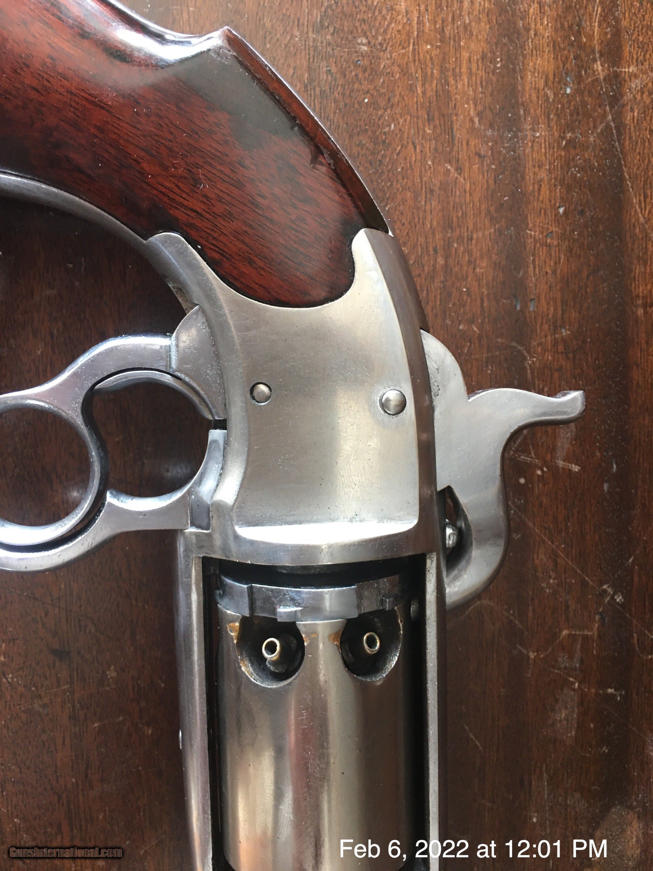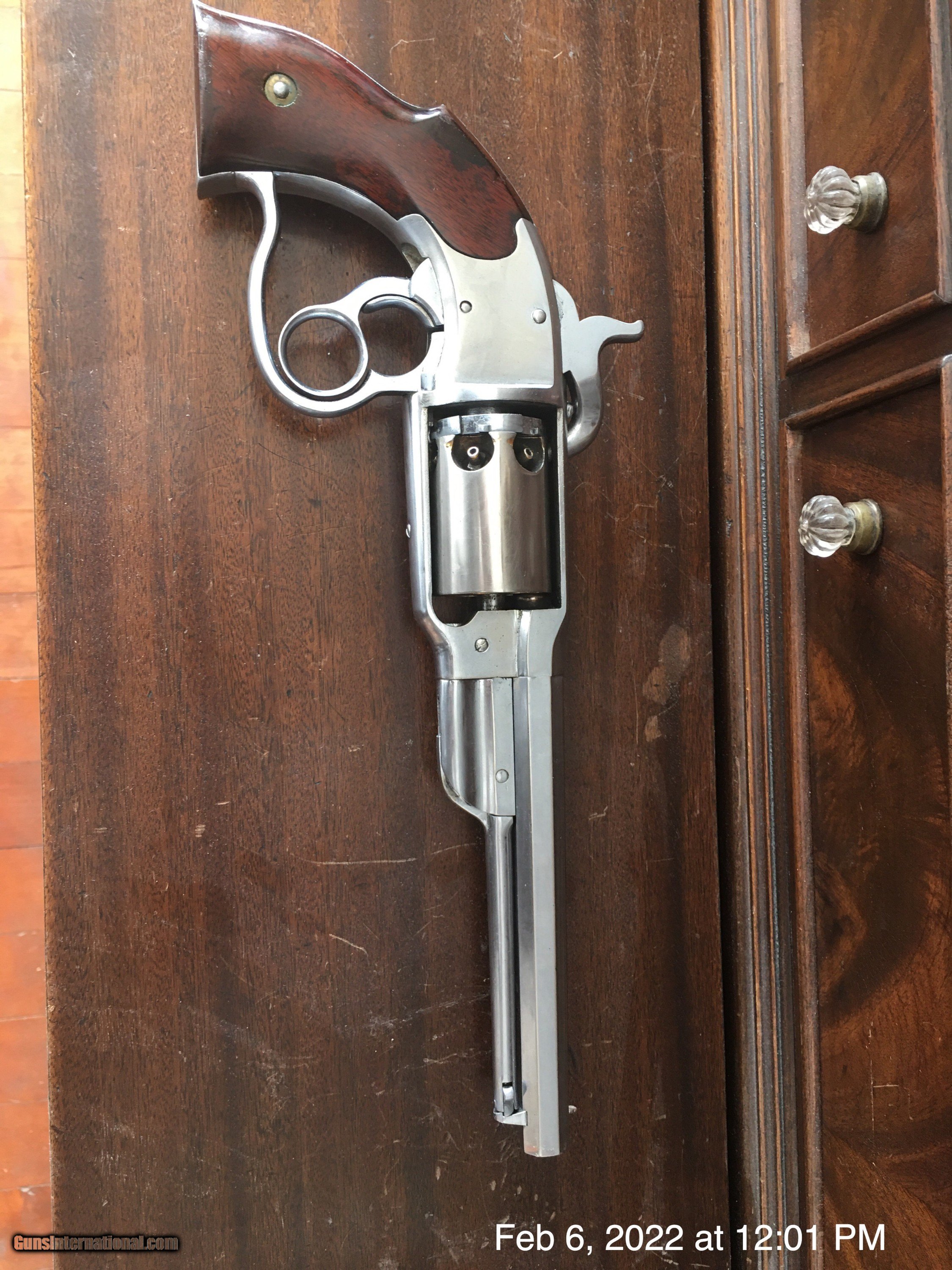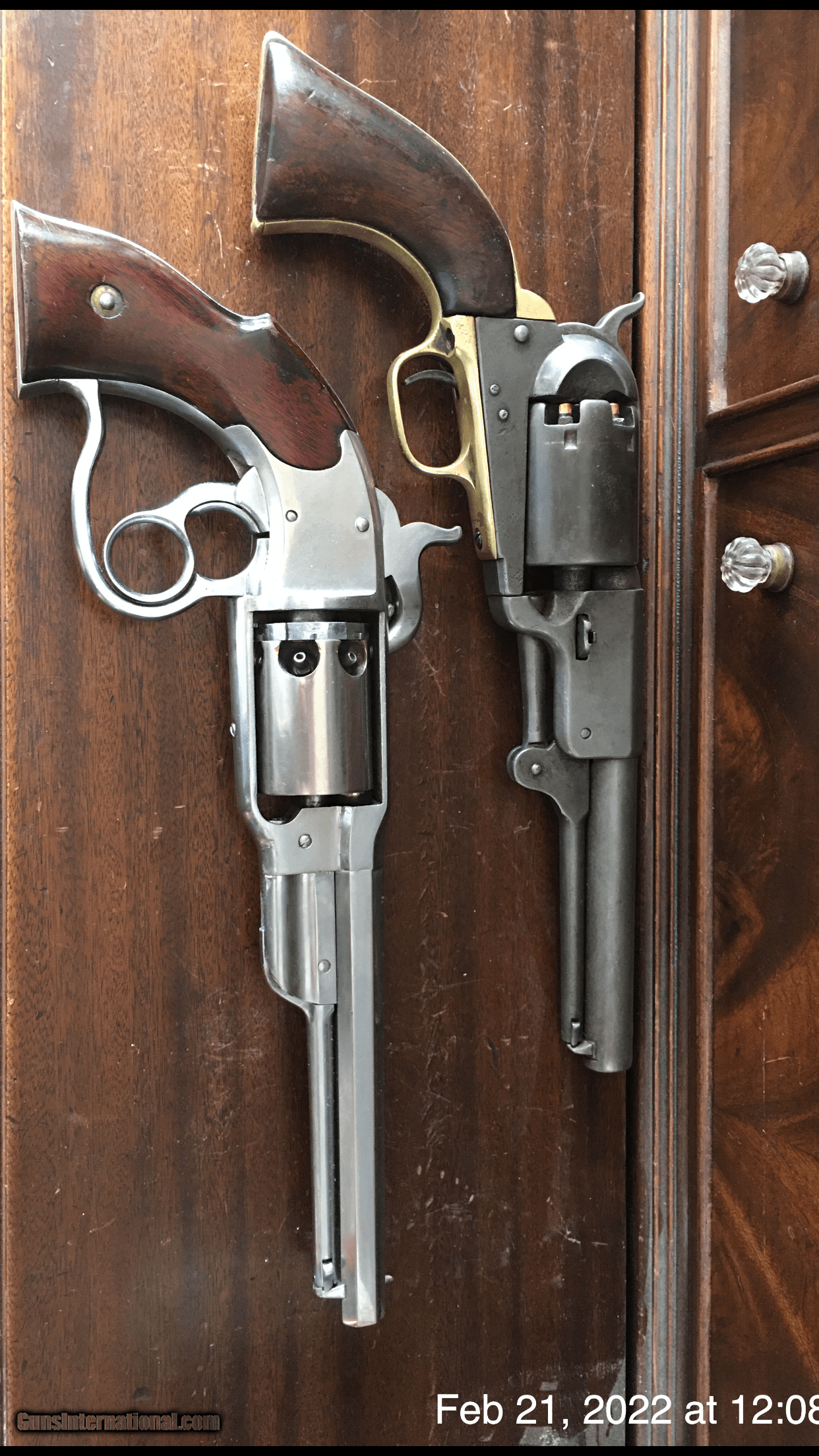 Description: Pending Sale. FFL not required. This is a Savage and North Navy .36 percussion revolver. There were approximately 20,000 of these made in 1861 and 1862. They were made specifically for Civil War combat, with many being sold to the Union Army, and most of the rest sold by nefarious means to Confederate soldiers and Southern Militia. These pistols are huge, just about the same size as an antique Colt Dragoon. (See comparison photo) Because they were cocked with the middle (second) finger and then fired with the forefinger they are considered to be the forerunner of double action firearms. The cylinder is large, and easily capped. The placement of the nipples allowed spent caps to simply fall off and not jam the mechanism when fired. Barrel is 7" and in reasonable condition. This revolver has a low serial number, 2708, visible in the photos. It is in really excellent condition and was professionally nickeled at some point in its history. The edges are exceptionally clean and sharp and the pistol looks beautiful. The grips on Savage Navy's are thin and subject to chipping and breaking. These grips have been strengthened and are strong and beautiful. The nipples on the gun are sharp and clear. Please email any questions. Trades for other antique black powder pistols such as period guns made by Colt, Remington, Sharps, and others always possible! Antique pre-1899 and ships directly to those places where it is legal to acquire and possess such items. Buyer states that it is legal for him to purchase this antique revolver. Sale Pending SOLD Antique: Yes Handgun Caliber: .36 Manufacturer: Savage North Model: .36 Navy Barrel Length: 7” Condition: Beautiful |