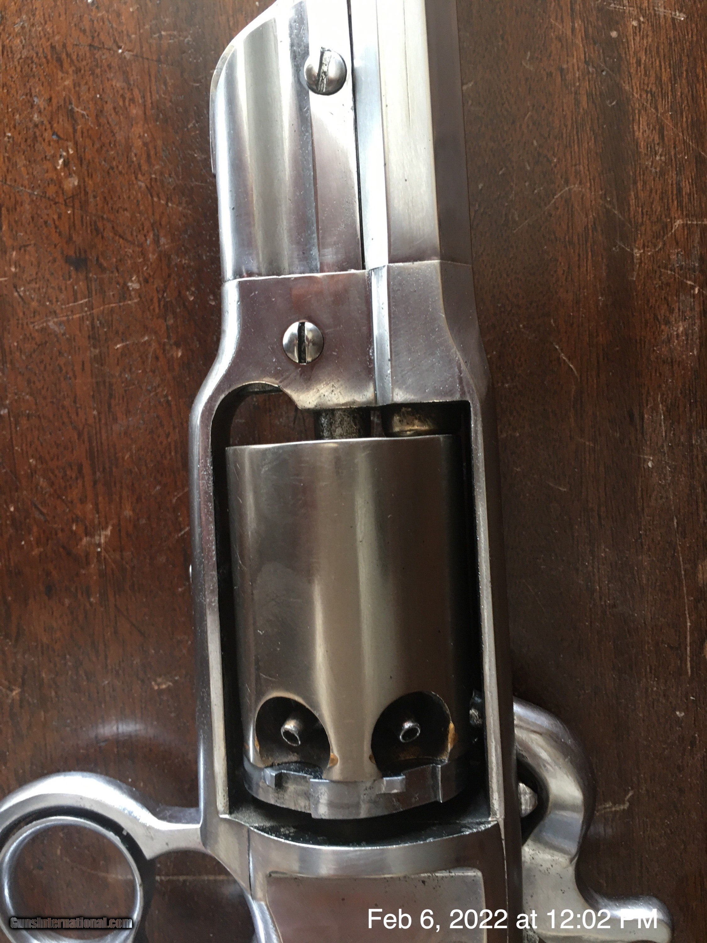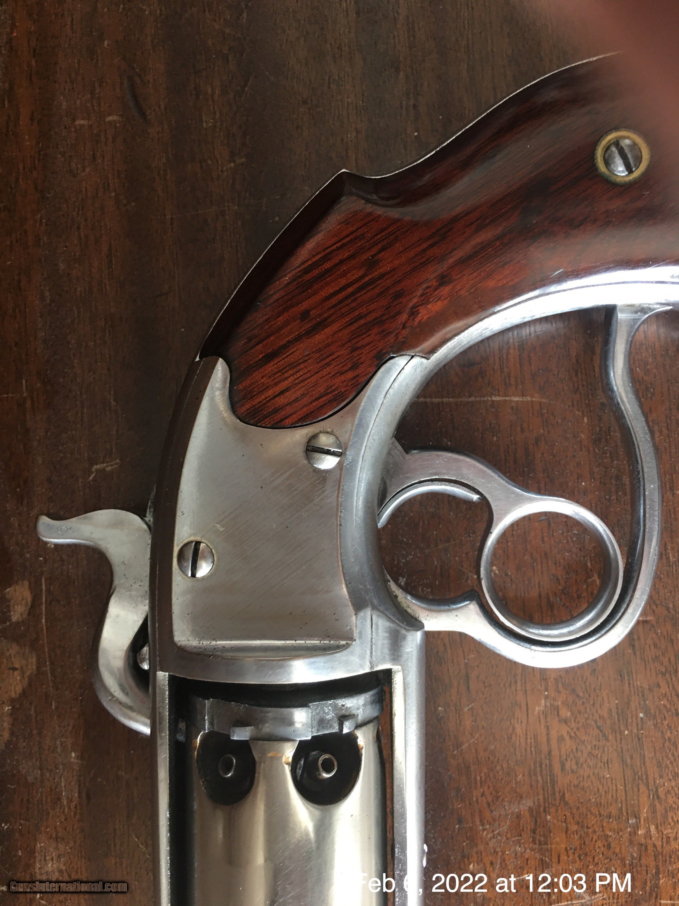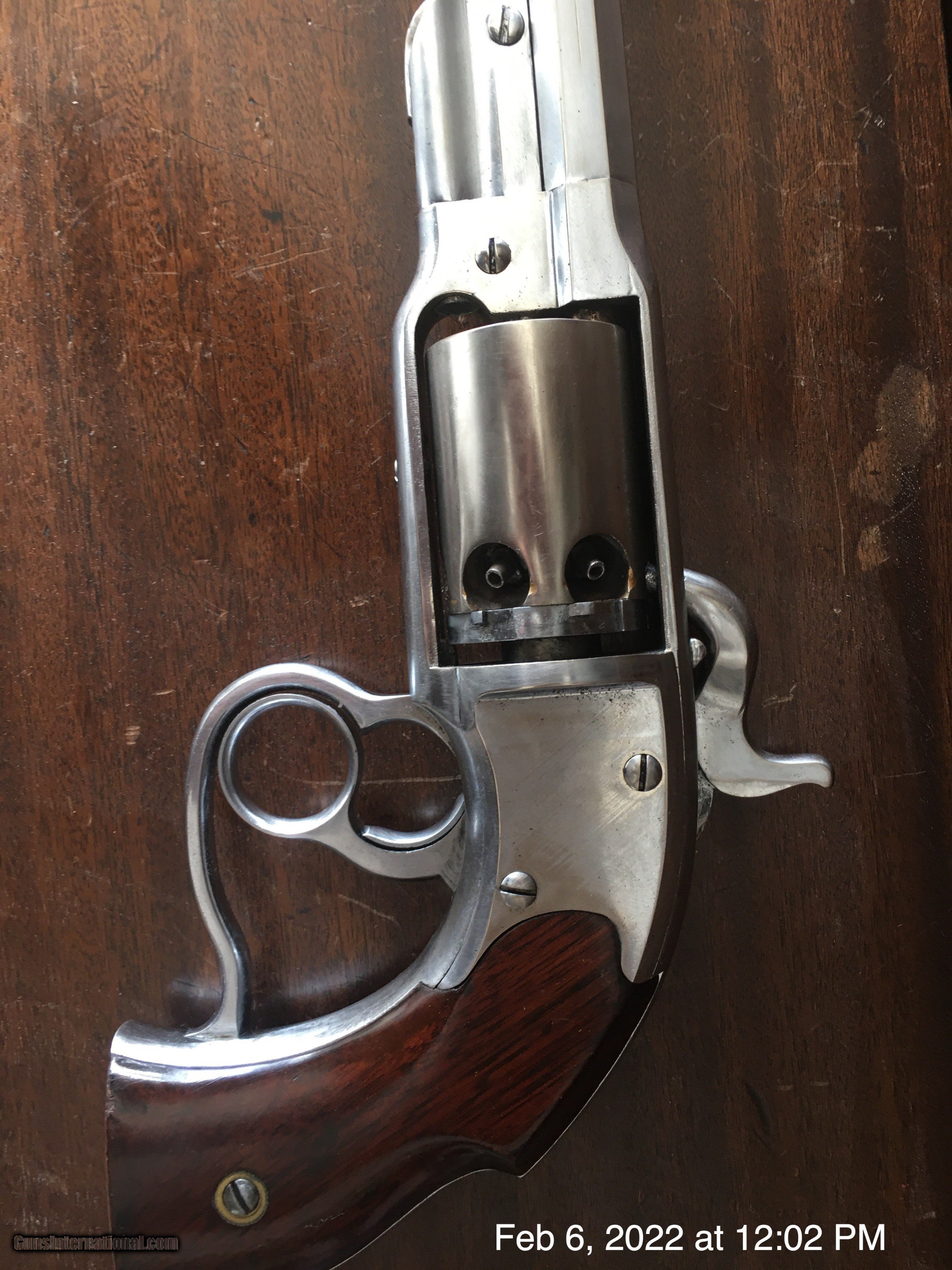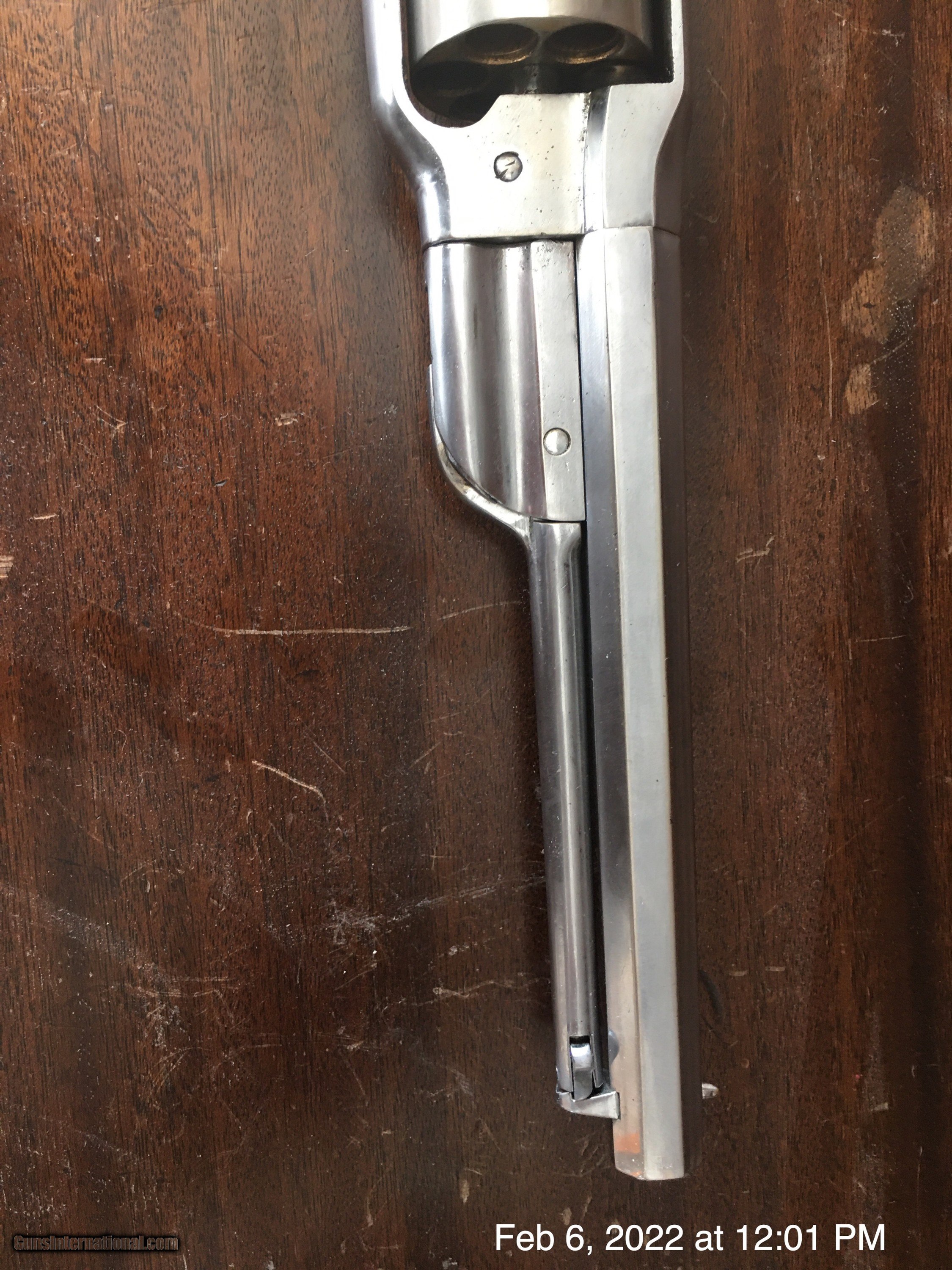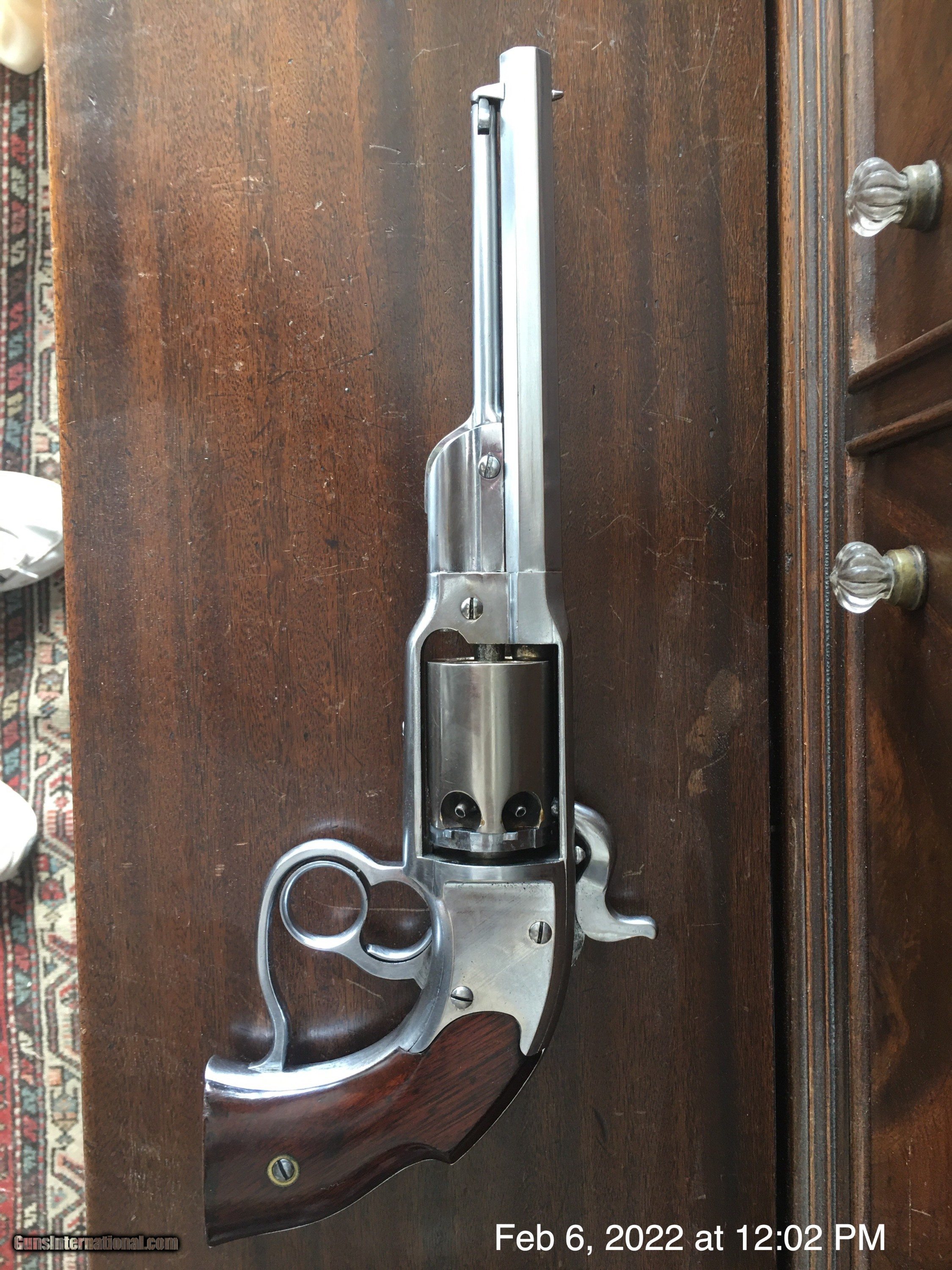 Description: Pending Sale. FFL not required. This is a Savage and North Navy .36 percussion revolver. There were approximately 20,000 of these made in 1861 and 1862. They were made specifically for Civil War combat, with many being sold to the Union Army, and most of the rest sold by nefarious means to Confederate soldiers and Southern Militia. These pistols are huge, just about the same size as an antique Colt Dragoon. (See comparison photo) Because they were cocked with the middle (second) finger and then fired with the forefinger they are considered to be the forerunner of double action firearms. The cylinder is large, and easily capped. The placement of the nipples allowed spent caps to simply fall off and not jam the mechanism when fired. Barrel is 7" and in reasonable condition. This revolver has a low serial number, 2708, visible in the photos. It is in really excellent condition and was professionally nickeled at some point in its history. The edges are exceptionally clean and sharp and the pistol looks beautiful. The grips on Savage Navy's are thin and subject to chipping and breaking. These grips have been strengthened and are strong and beautiful. The nipples on the gun are sharp and clear. Please email any questions. Trades for other antique black powder pistols such as period guns made by Colt, Remington, Sharps, and others always possible! Antique pre-1899 and ships directly to those places where it is legal to acquire and possess such items. Buyer states that it is legal for him to purchase this antique revolver. Sale Pending SOLD Antique: Yes Handgun Caliber: .36 Manufacturer: Savage North Model: .36 Navy Barrel Length: 7” Condition: Beautiful |
