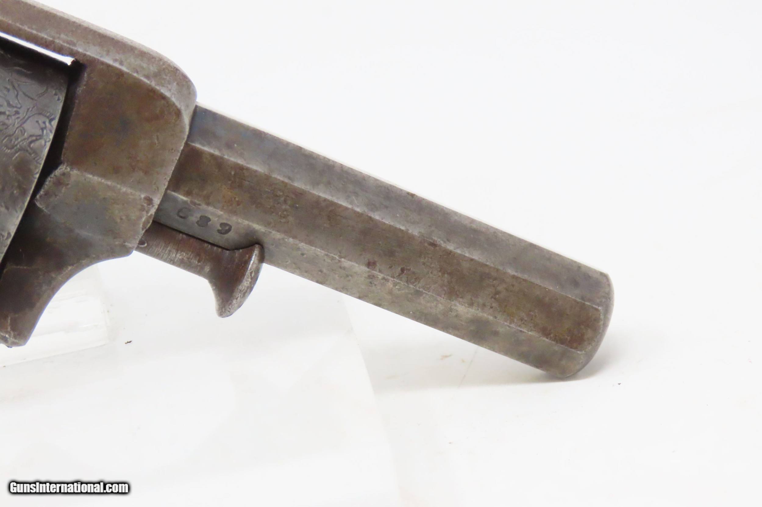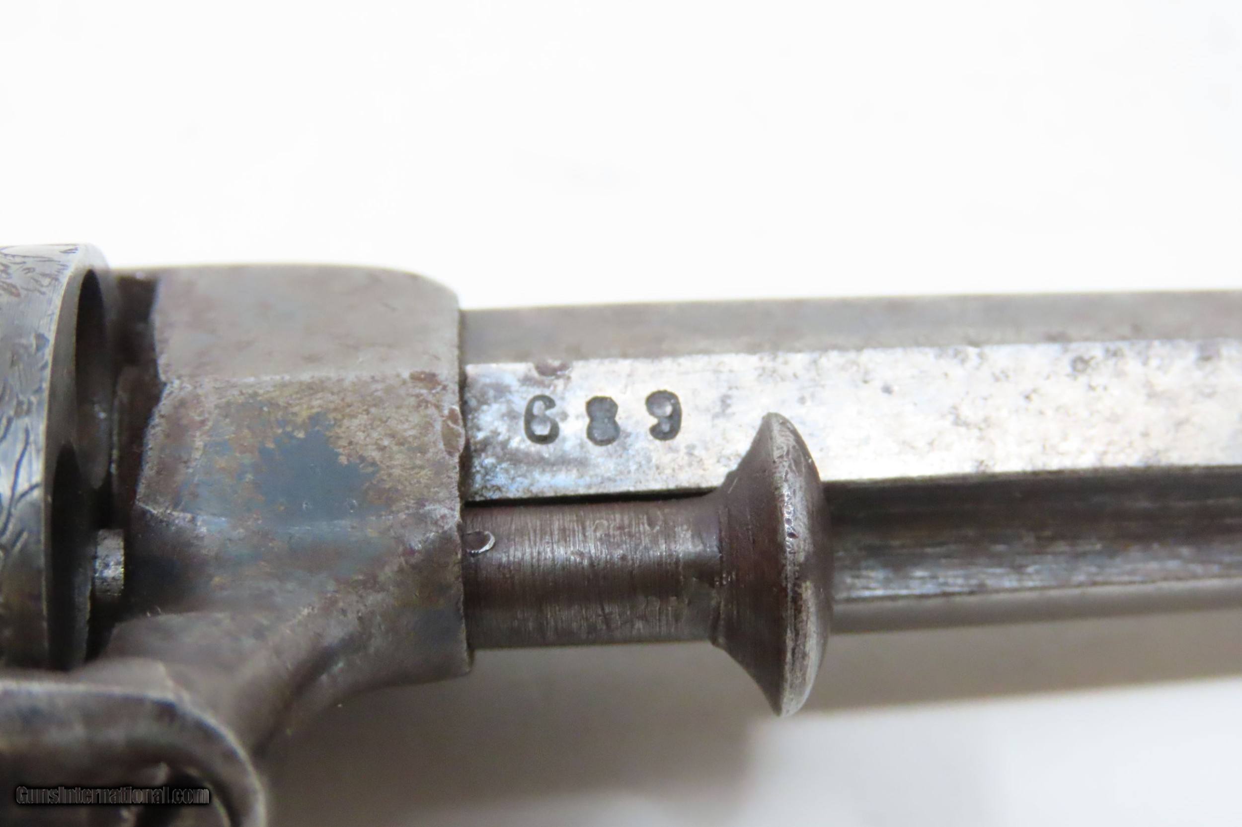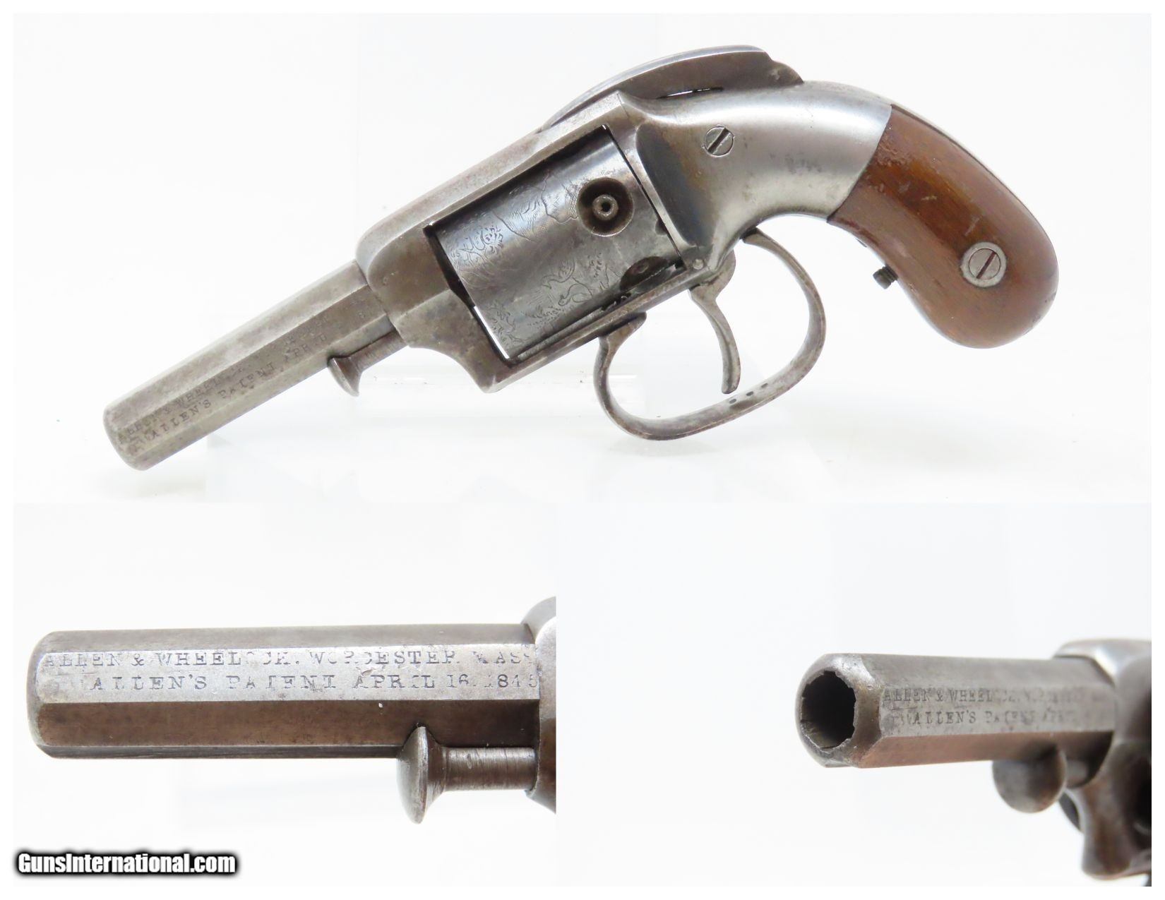 Description: SCARCE Antique ALLEN & WHEELOCK .31 Cal. PERCUSSION Small Pocket Revolver TRANSITIONAL PEPPERBOX-REVOLVER Here we present an antique Allen & Wheelock Small Frame Double Action Percussion Pocket Revolver, made circa 1858-61 in Worcester, Massachusetts. Also known as the "Transition Pepperbox-revolver", this model was manufactured circa 1858 into the early 1860s with a total production of only about 1,000. The small frame model is identical in profile to that of the medium and large frame, but with a hammer that is evenly rounded. The left barrel flat is marked "ALLEN & WHEELOCK. WORCESTER, MA./ALLEN'S PATENT APRIL 16 1845" and the cylinder is roll engraved with a wooded scene with deer and a marsh scene with ducks. The matching serial (batch) number "689" is marked on the inside of each grip panel, on the lower right rear barrel flat and on the right side of the front strap under the grip. The hammer spring and cylinder are also numbered "689". The revolver is manufactured without sights (for up close and personal work), blue finish with casehardened cylinder and hammer, and fitted with smooth varnished walnut grips. The overall condition is very good. Great cylinder scene clarity. The action is excellent. The bore is in nice shape with sharp rifling. The grips are solid and smooth. A great little piece! Own the original! This is a legitimate antique and not a reproduction. Barrel is 2-1/2 inches. Caliber: .31 Percussion Overall condition as seen in photos. Very Fast. Very Safe. FREE SHIPPING WORLDWIDE. Delivered directly to your door by express mail! Guaranteed AUTHENTIC & Includes CERTIFICATE OF AUTHENTICITY. ancestryguns $1800 #220313 SOLD Antique: Yes |