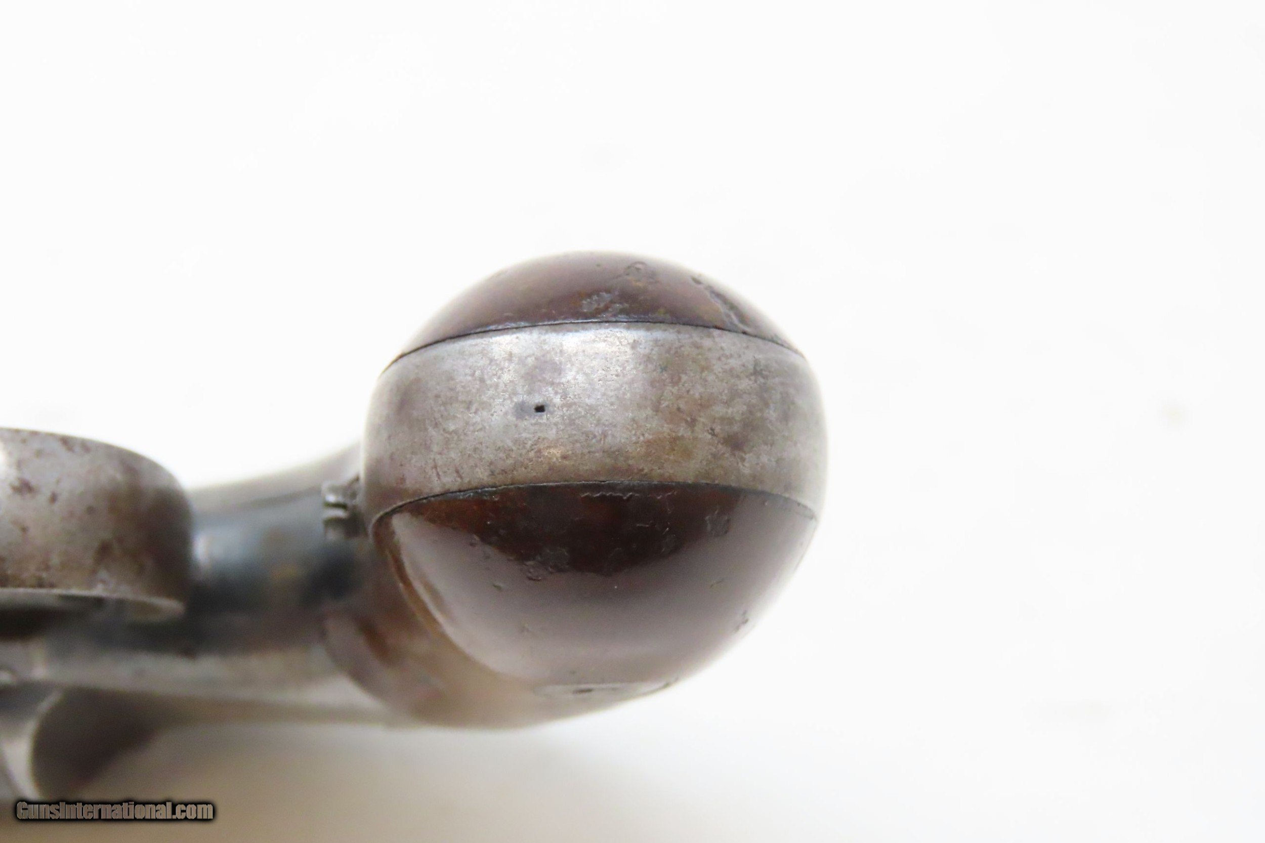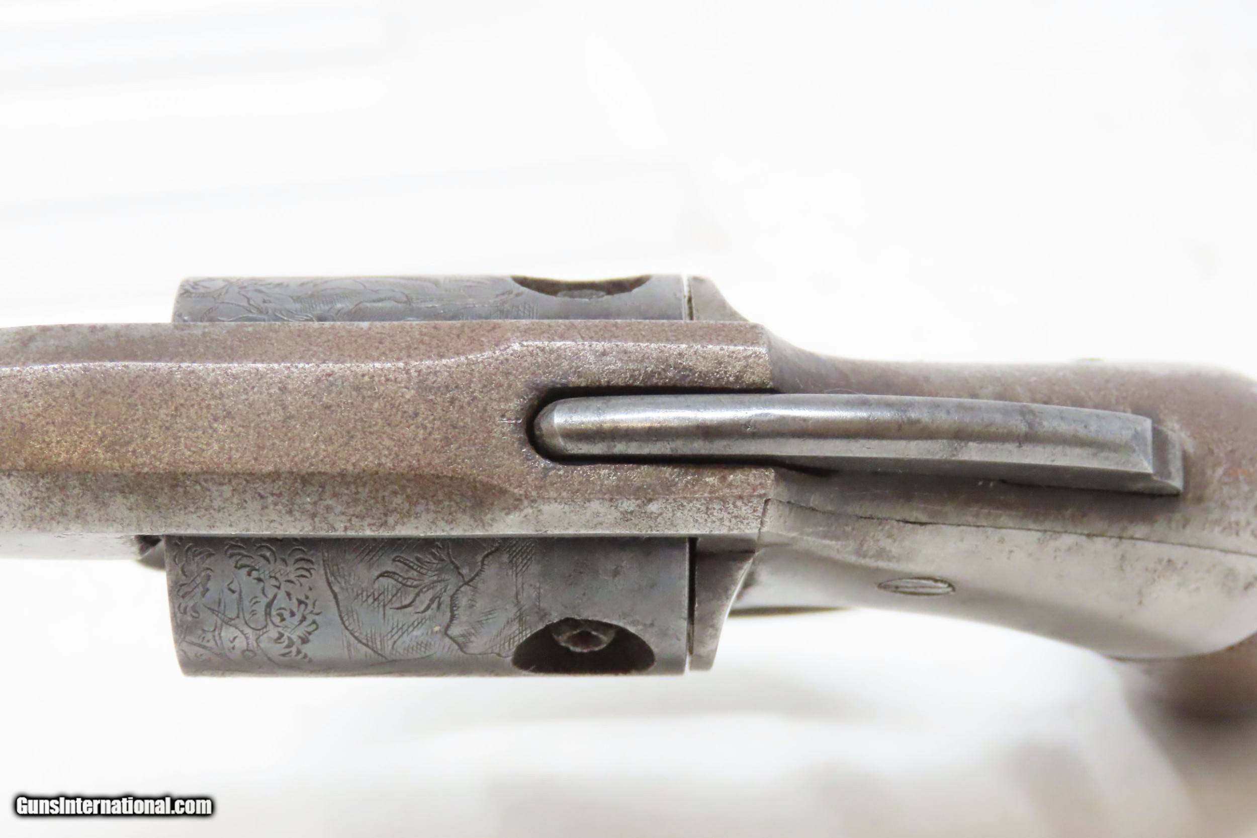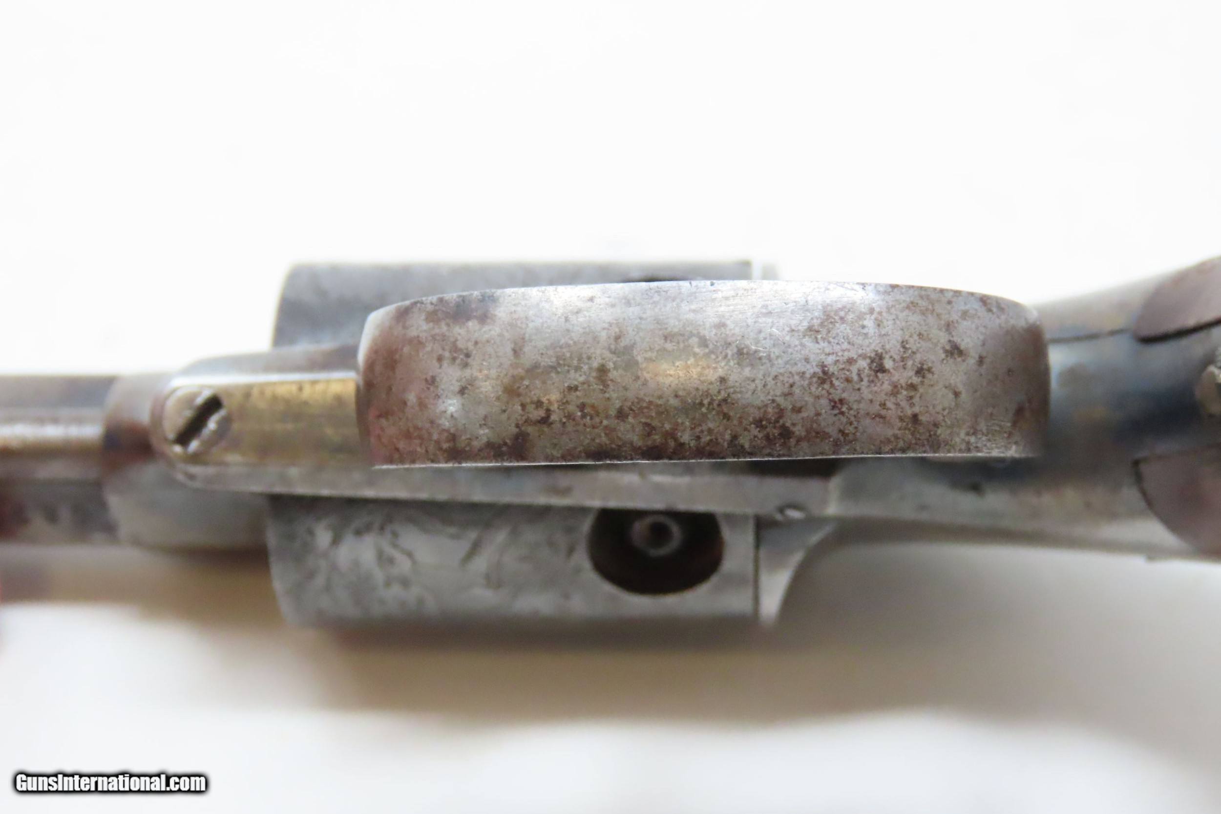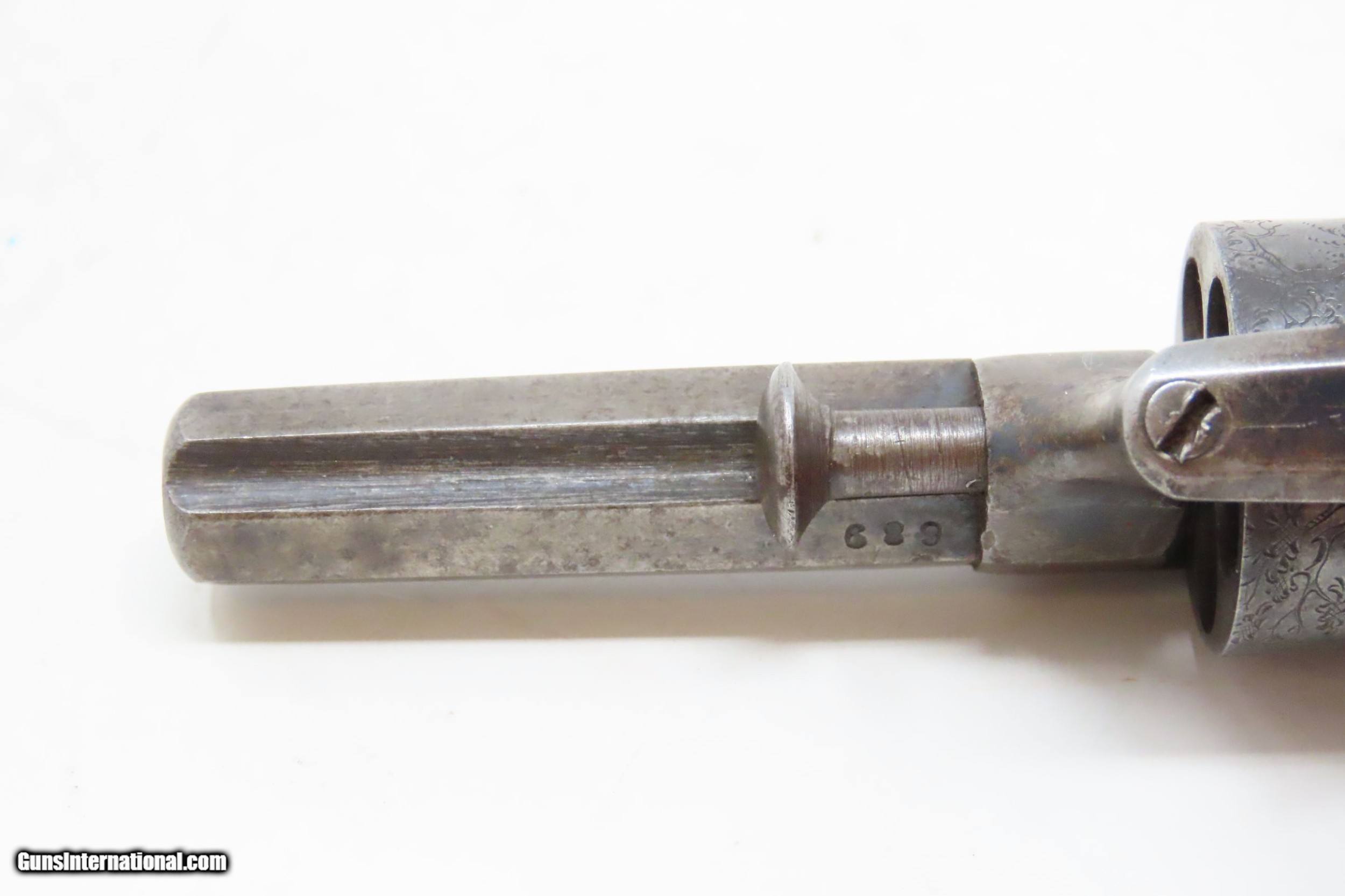 Description: SCARCE Antique ALLEN & WHEELOCK .31 Cal. PERCUSSION Small Pocket Revolver TRANSITIONAL PEPPERBOX-REVOLVER Here we present an antique Allen & Wheelock Small Frame Double Action Percussion Pocket Revolver, made circa 1858-61 in Worcester, Massachusetts. Also known as the "Transition Pepperbox-revolver", this model was manufactured circa 1858 into the early 1860s with a total production of only about 1,000. The small frame model is identical in profile to that of the medium and large frame, but with a hammer that is evenly rounded. The left barrel flat is marked "ALLEN & WHEELOCK. WORCESTER, MA./ALLEN'S PATENT APRIL 16 1845" and the cylinder is roll engraved with a wooded scene with deer and a marsh scene with ducks. The matching serial (batch) number "689" is marked on the inside of each grip panel, on the lower right rear barrel flat and on the right side of the front strap under the grip. The hammer spring and cylinder are also numbered "689". The revolver is manufactured without sights (for up close and personal work), blue finish with casehardened cylinder and hammer, and fitted with smooth varnished walnut grips. The overall condition is very good. Great cylinder scene clarity. The action is excellent. The bore is in nice shape with sharp rifling. The grips are solid and smooth. A great little piece! Own the original! This is a legitimate antique and not a reproduction. Barrel is 2-1/2 inches. Caliber: .31 Percussion Overall condition as seen in photos. Very Fast. Very Safe. FREE SHIPPING WORLDWIDE. Delivered directly to your door by express mail! Guaranteed AUTHENTIC & Includes CERTIFICATE OF AUTHENTICITY. ancestryguns $1800 #220313 SOLD Antique: Yes |