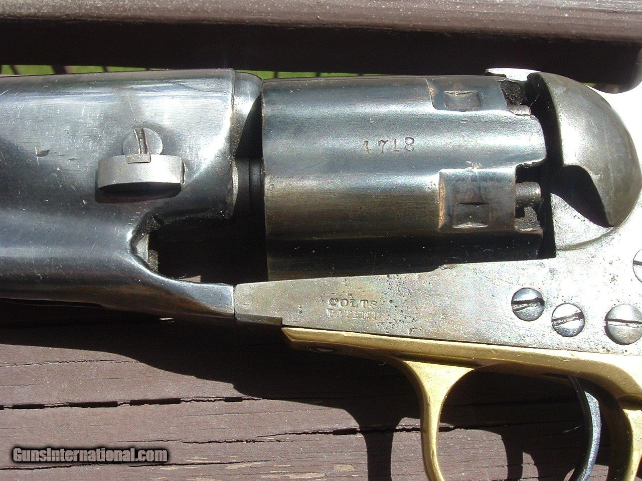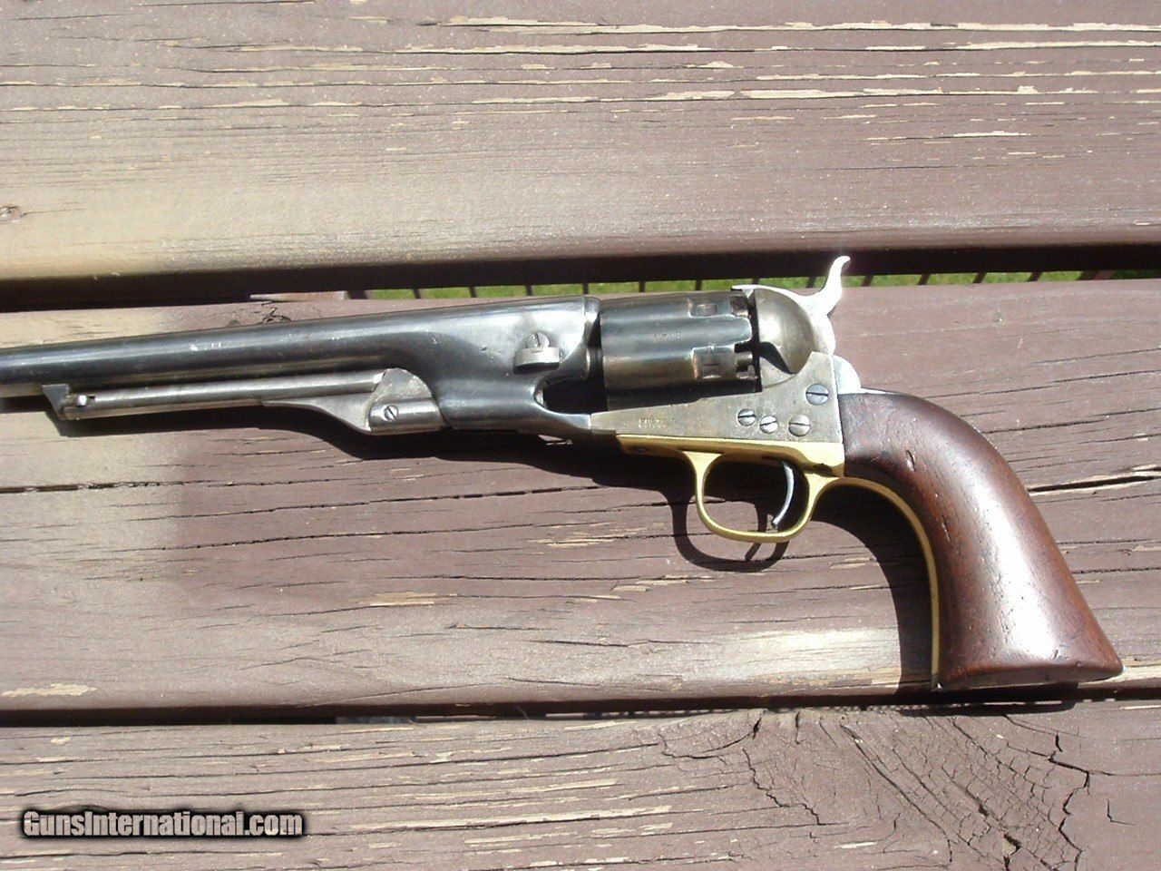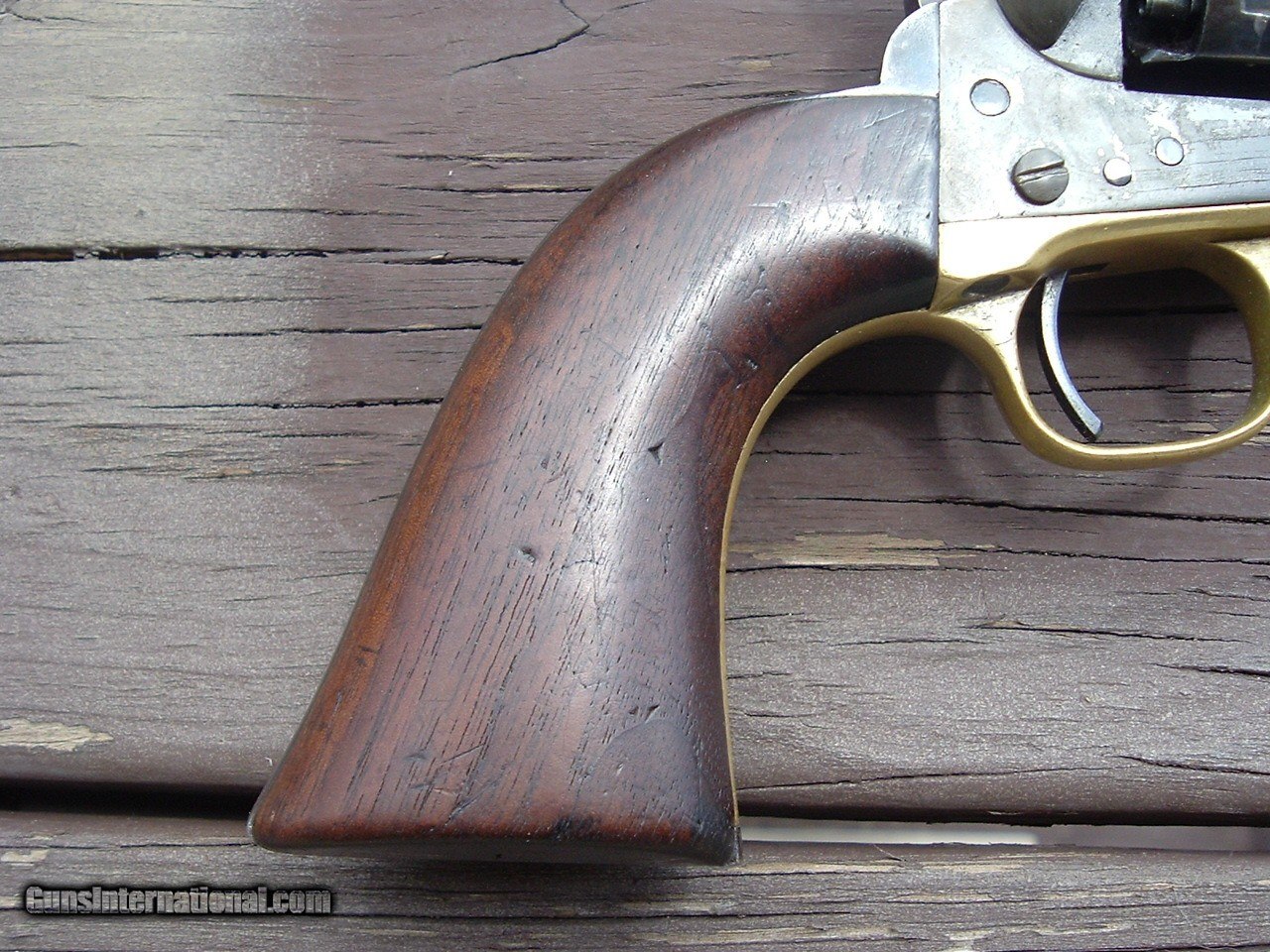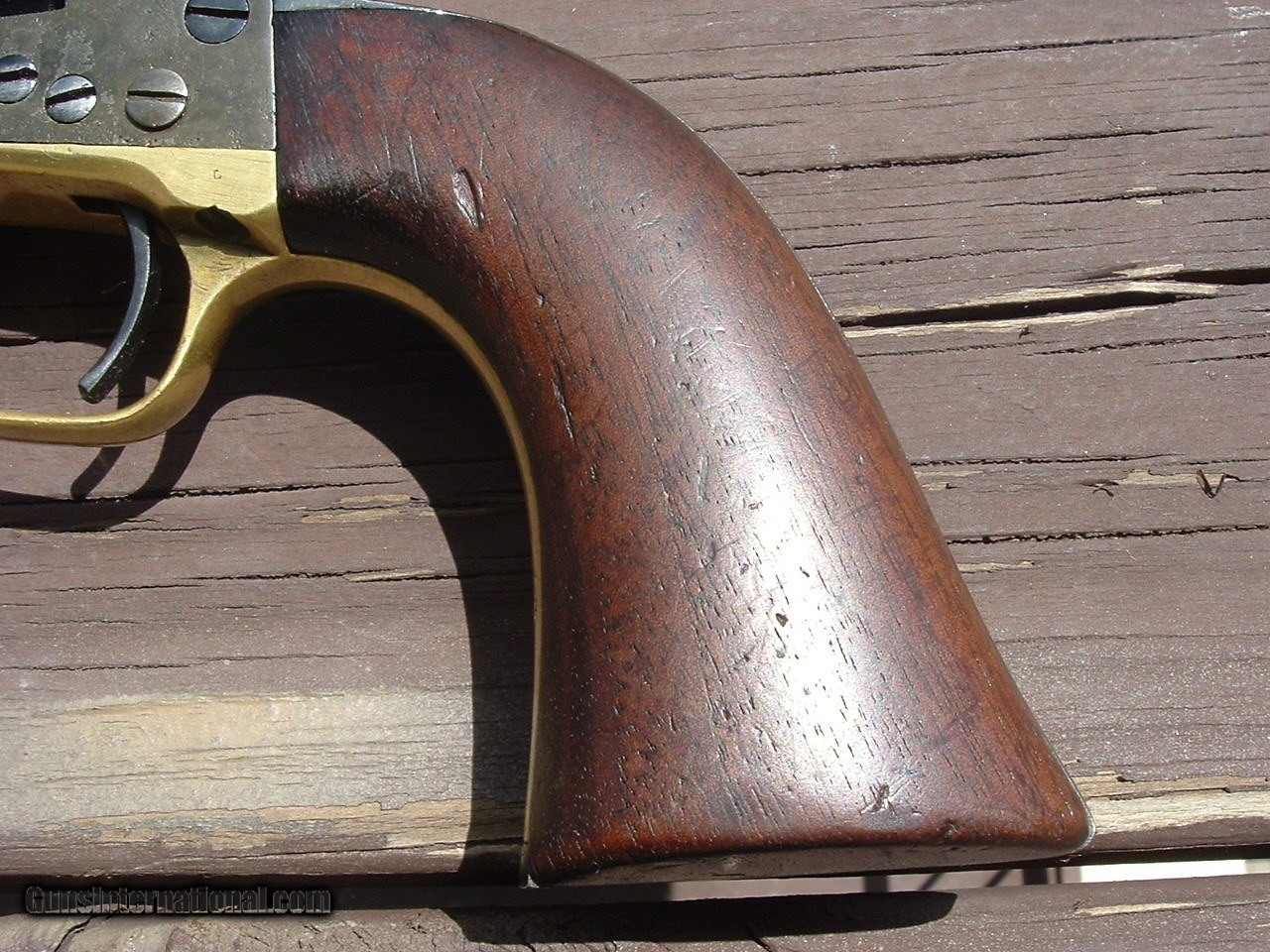 Description: Scarce fluted-cylinder Colt model 1860 Army percussion revolver. Serial #4718 matching, including wedge #5261, 1861 manufacture. .44 caliber bore is very good+, mechanics are tight. Colt's patent marking on frame. Cut for shoulder stock, 4-screw frame. One-line patent dates are present in a cylinder flute. "L" on the left side of the triggerguard. Has a 8" barrel with very good Colt's one-line New York barrel address. Wood grips are very good+. The barrel, backstrap and cylinder have had a light polishing years ago which has toned down somewhat from handling. The frame, brass and grips have more age patina to them. Though polished years ago, the gun overall has a pleasing pewter-grey finish overall. A super scarce example of a desirable and highly sought after fluted Colt Army, these are getting tough to come across. SOLD Antique: Yes |