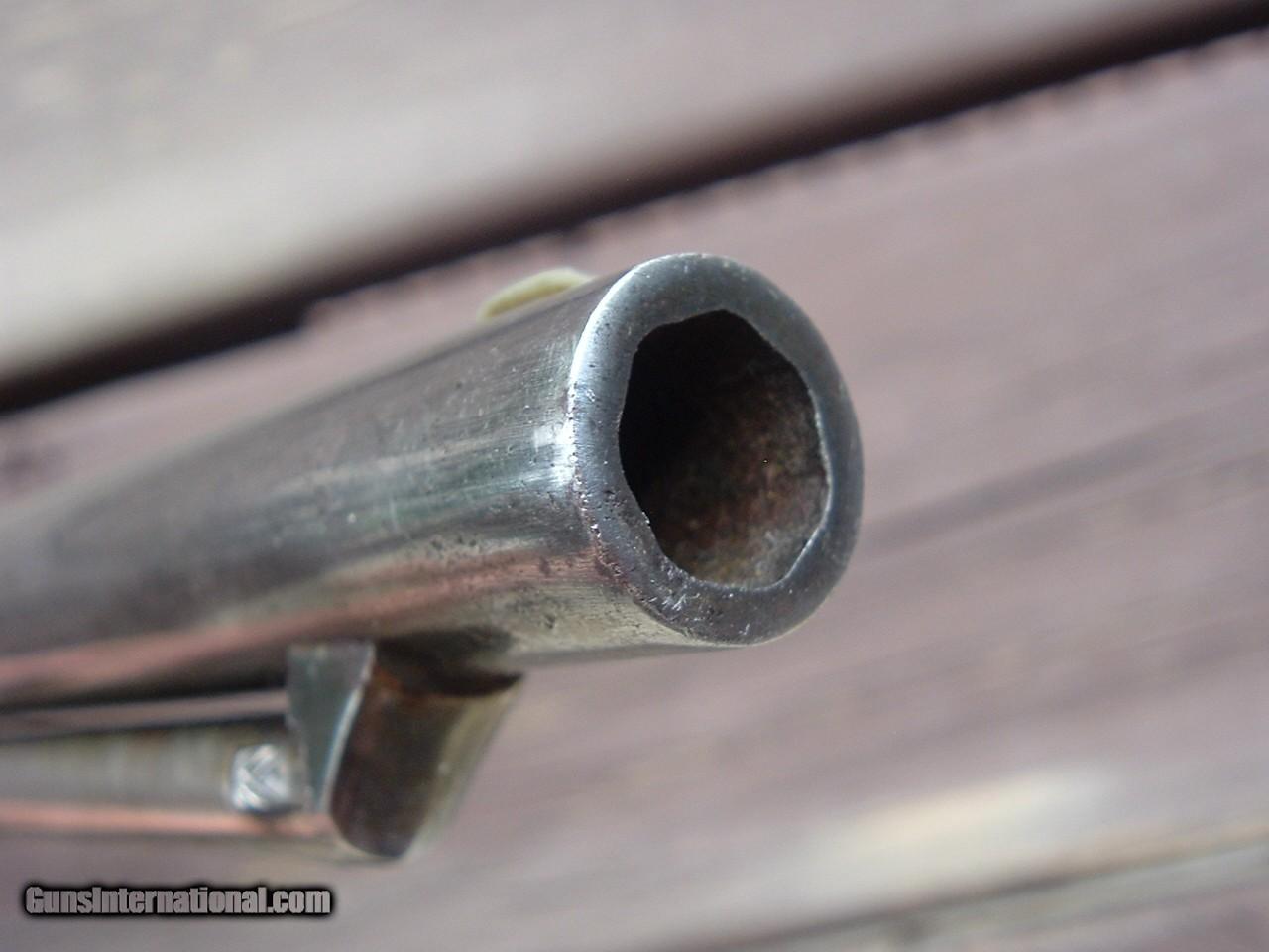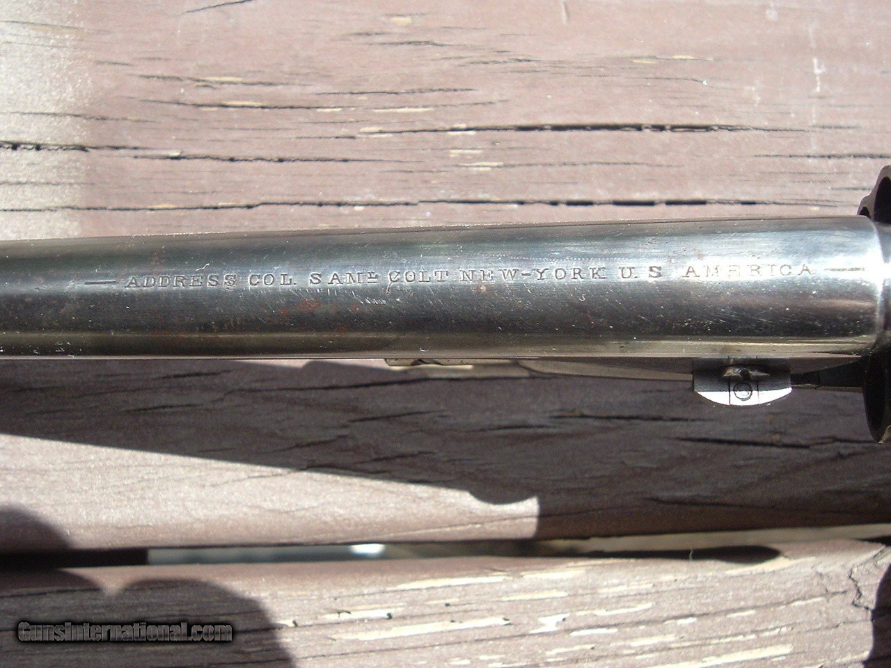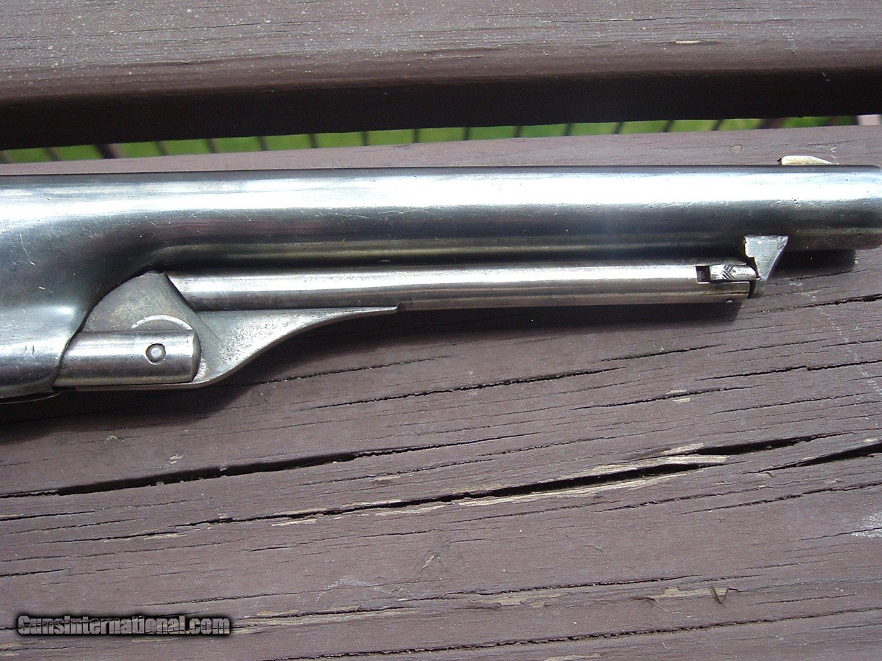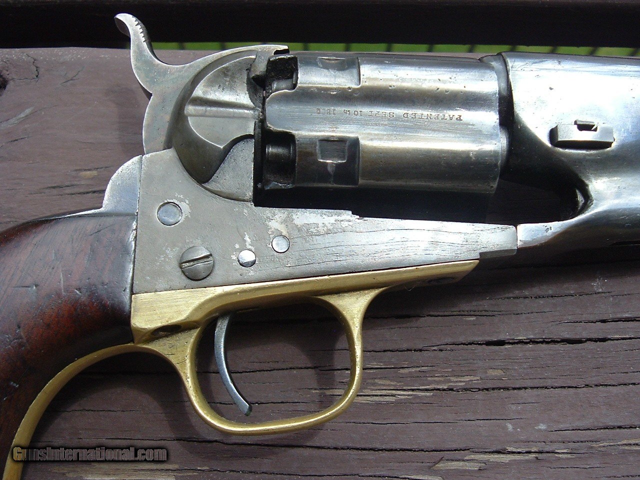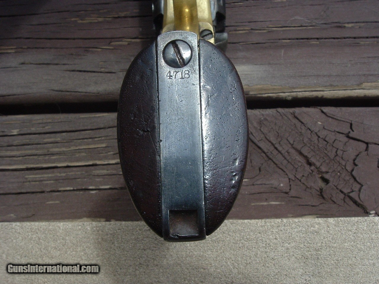 Description: Scarce fluted-cylinder Colt model 1860 Army percussion revolver. Serial #4718 matching, including wedge #5261, 1861 manufacture. .44 caliber bore is very good+, mechanics are tight. Colt's patent marking on frame. Cut for shoulder stock, 4-screw frame. One-line patent dates are present in a cylinder flute. "L" on the left side of the triggerguard. Has a 8" barrel with very good Colt's one-line New York barrel address. Wood grips are very good+. The barrel, backstrap and cylinder have had a light polishing years ago which has toned down somewhat from handling. The frame, brass and grips have more age patina to them. Though polished years ago, the gun overall has a pleasing pewter-grey finish overall. A super scarce example of a desirable and highly sought after fluted Colt Army, these are getting tough to come across. SOLD Antique: Yes |