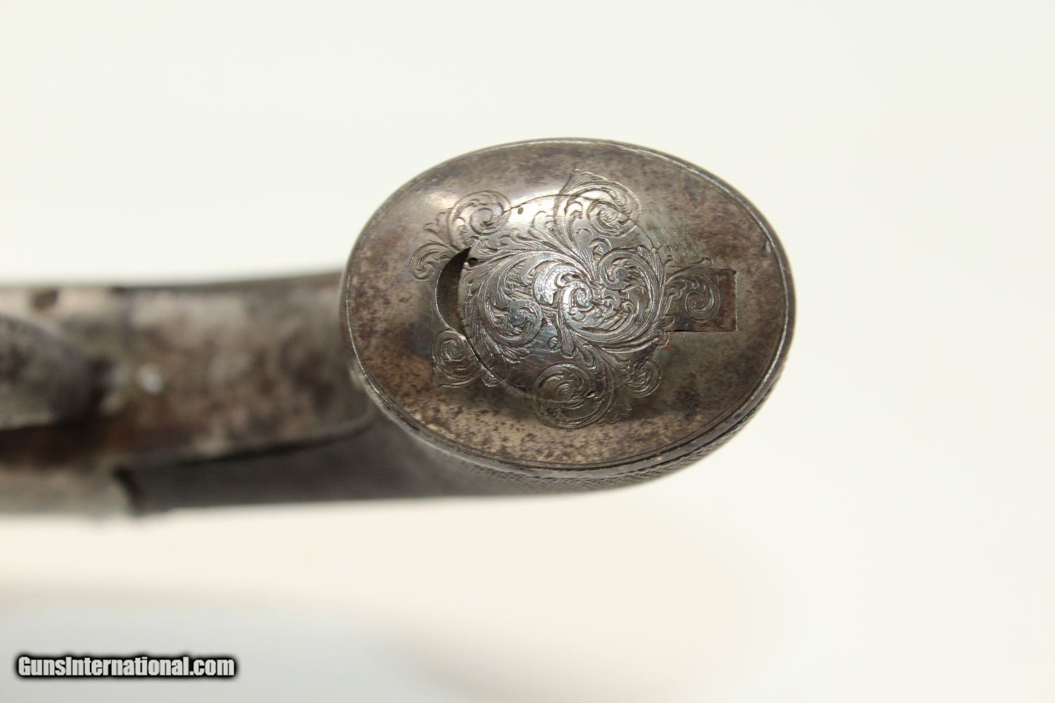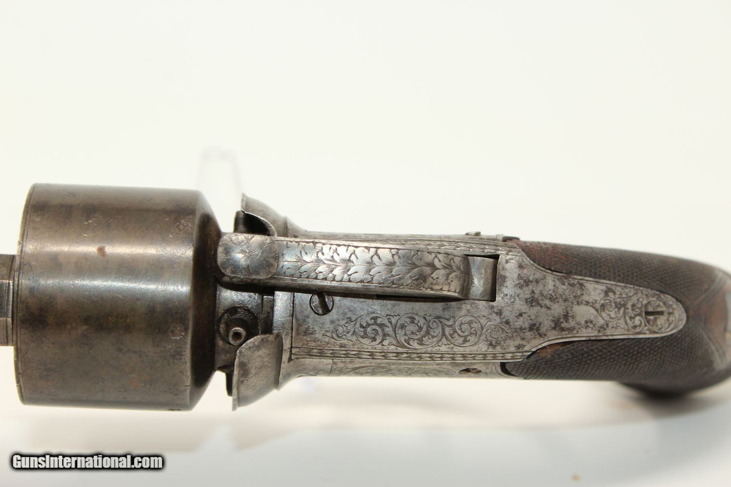 Description: SHARMAN WEST BERRY of WOODBRIDGE Transitional PERCUSSION PEPPERBOX/REVOLVER Double Action Made by Berry of Woodbridge, Suffolk, England Here we present an antique Transitional Revolver by Sharman West Berry of Woodbridge, Suffolk, England, made circa 1845. This piece is considered a prime example of transitional firearms technology. Successful revolvers to this point were few, the most successful being those known as “pepperboxes”, those revolvers having long cylinders with each chamber having its own barrel. They were usually double action and very similar to form as the revolver you see here. This one, however, has a short cylinder as well as a single barrel to which every chamber revolves to utilize. These are few, as the technology was quickly developing. This revolver is larger than average for the type with an overall length of about 12 inches and a .42 caliber bore. The octagonal barrel is marked “BERRY WOODBRIDGE”. The grips are finely checkered walnut. Beautiful engravings. Berry lived from about 1813-1875 and was active as a gunmaker from about 1840-1870. The overall condition is Fine. The bore is shiny and smooth. The action (hammer/trigger) is strong, though the trigger return spring is a tad weak. Excellent cylinder lock-up. You can certainly feel the pepperbox inspiration. With ornate engravings on the frame, trigger guard, tip of the barrel, and the bottom of the grips, this makes for a handsome display piece as well. Own the original! This is a legitimate antique and not a reproduction. Barrel is 5 inches. Caliber: .42 Overall condition as seen in photos. Very Fast. Very Safe. FREE SHIPPING WORLDWIDE. Delivered directly to your door by express mail! Guaranteed AUTHENTIC & Includes CERTIFICATE OF AUTHENTICITY. ancestryguns $1800 #190708 SOLD Antique: Yes |